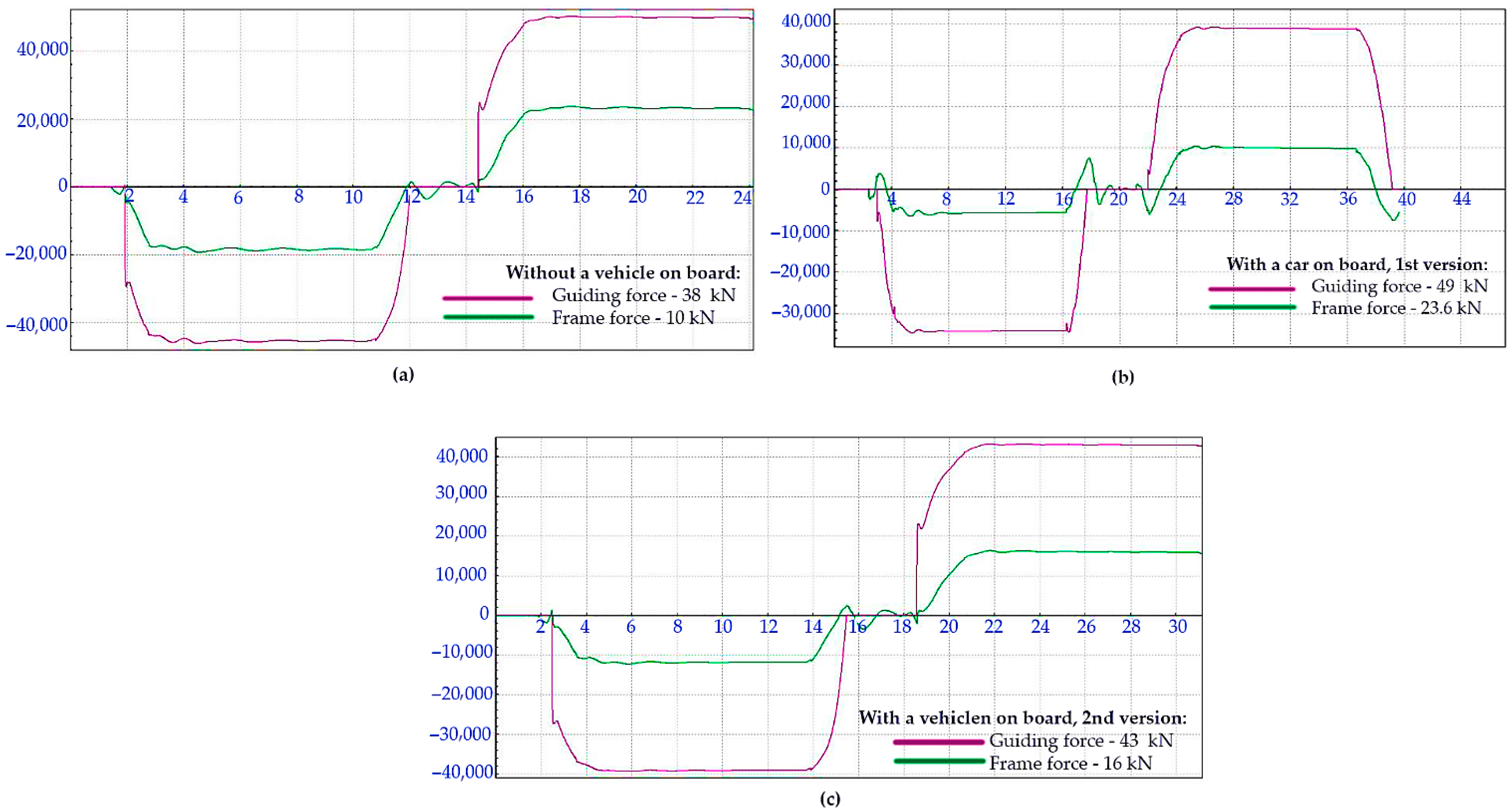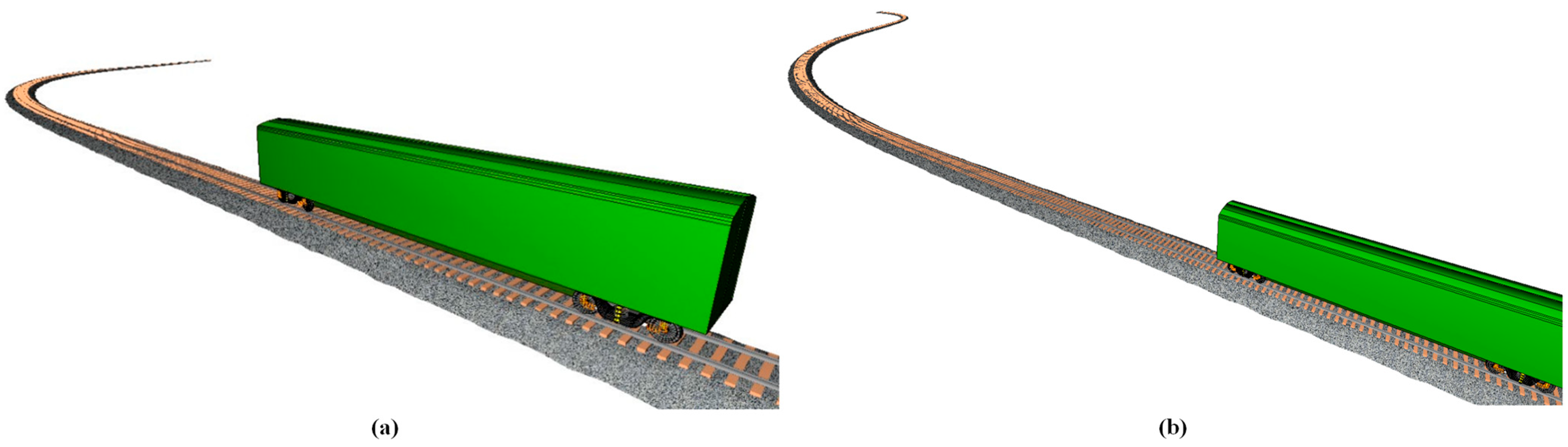 - Configuration 1: the automobile was positioned at the end of coach body, and the motion was analyzed on a simple curve with a radius of R = 350 m (Figure 9a);