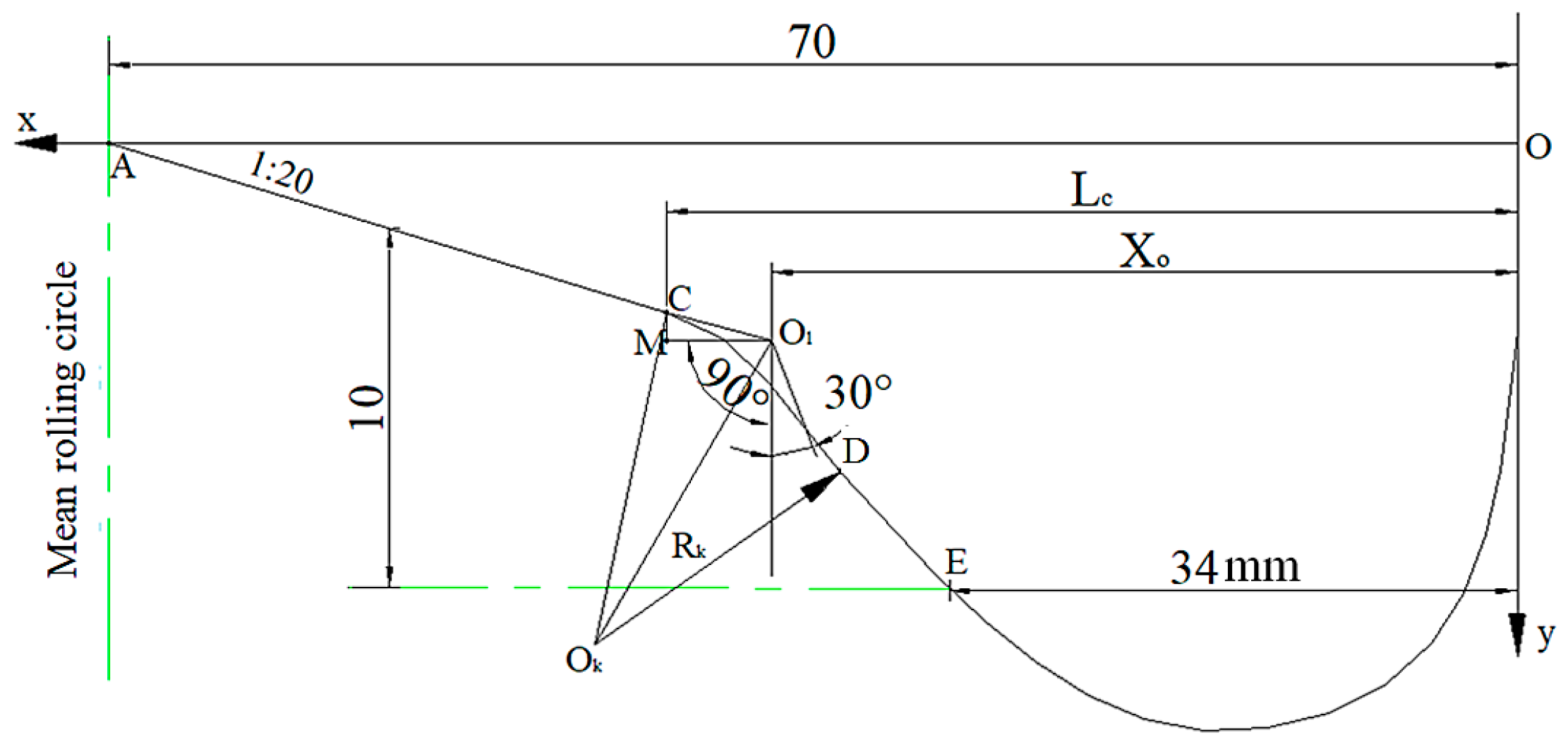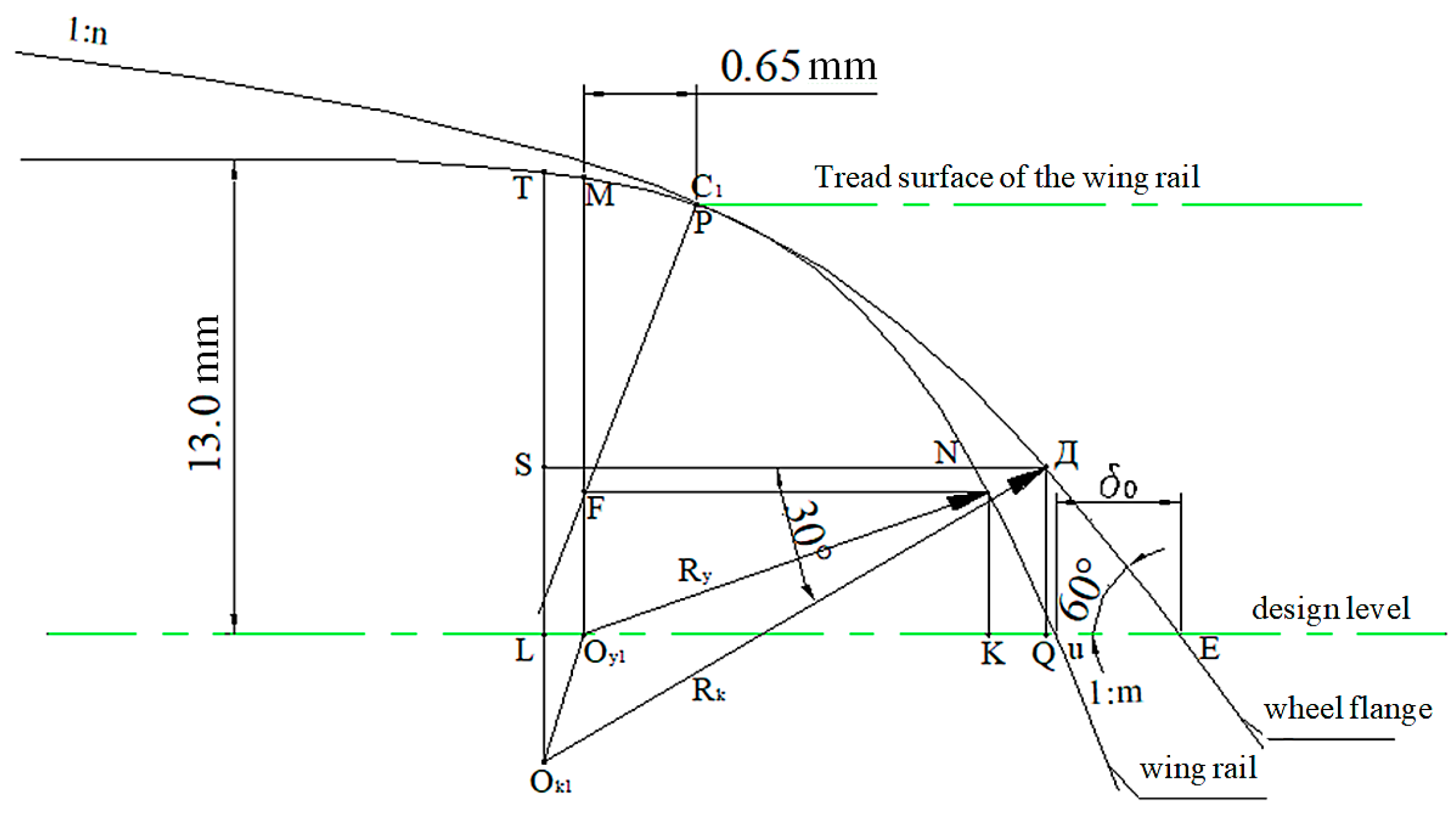 | Crossing Type | Critical Clearance, l (mm) | Unsupported Gap, (mm) | Permissible Wheelset Rotation Angle, ° ′ ″ | Additional Wheel Displacement, (mm) | Wheelset Displacement, (mm) | Total Possible (mm) |
