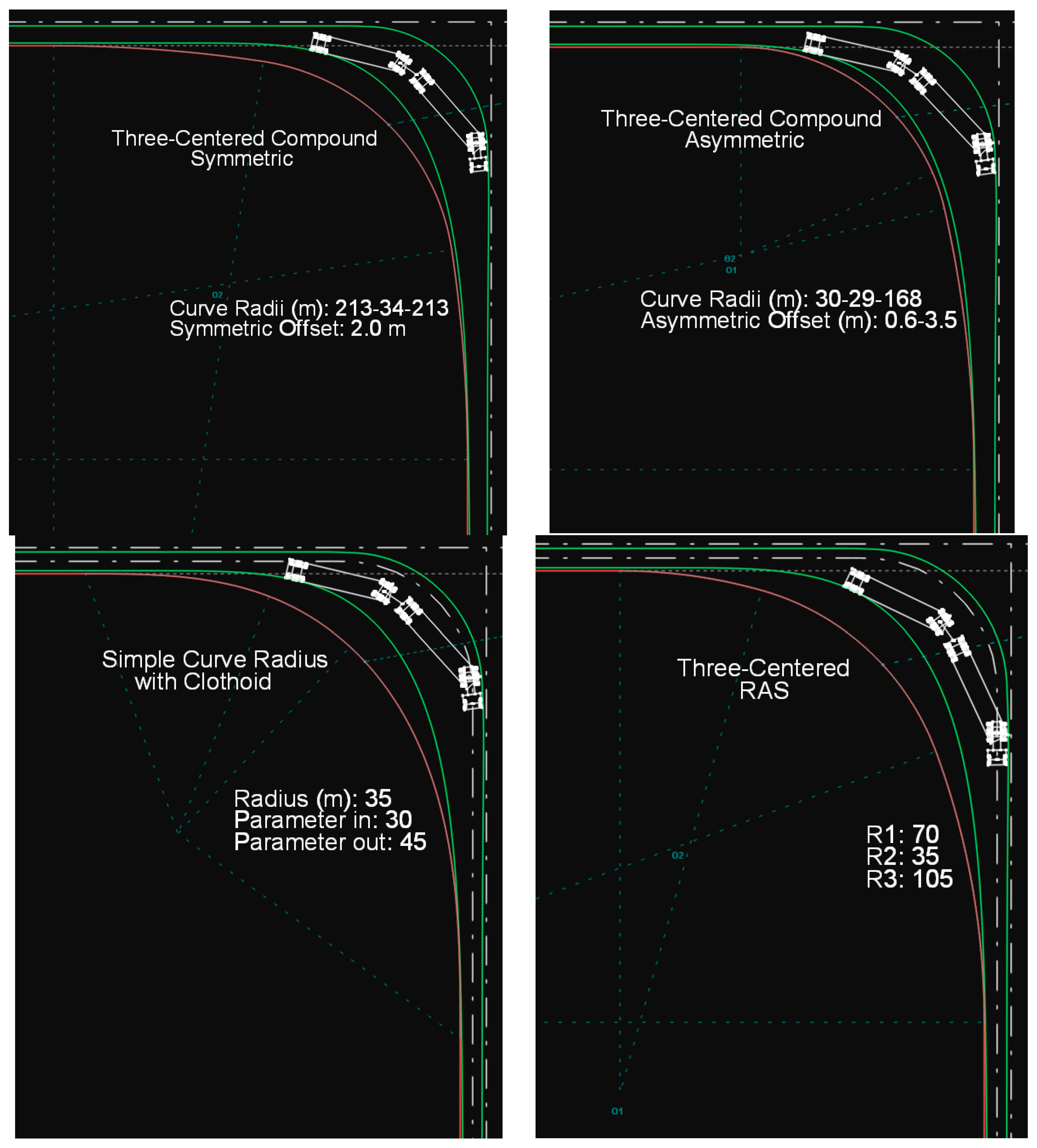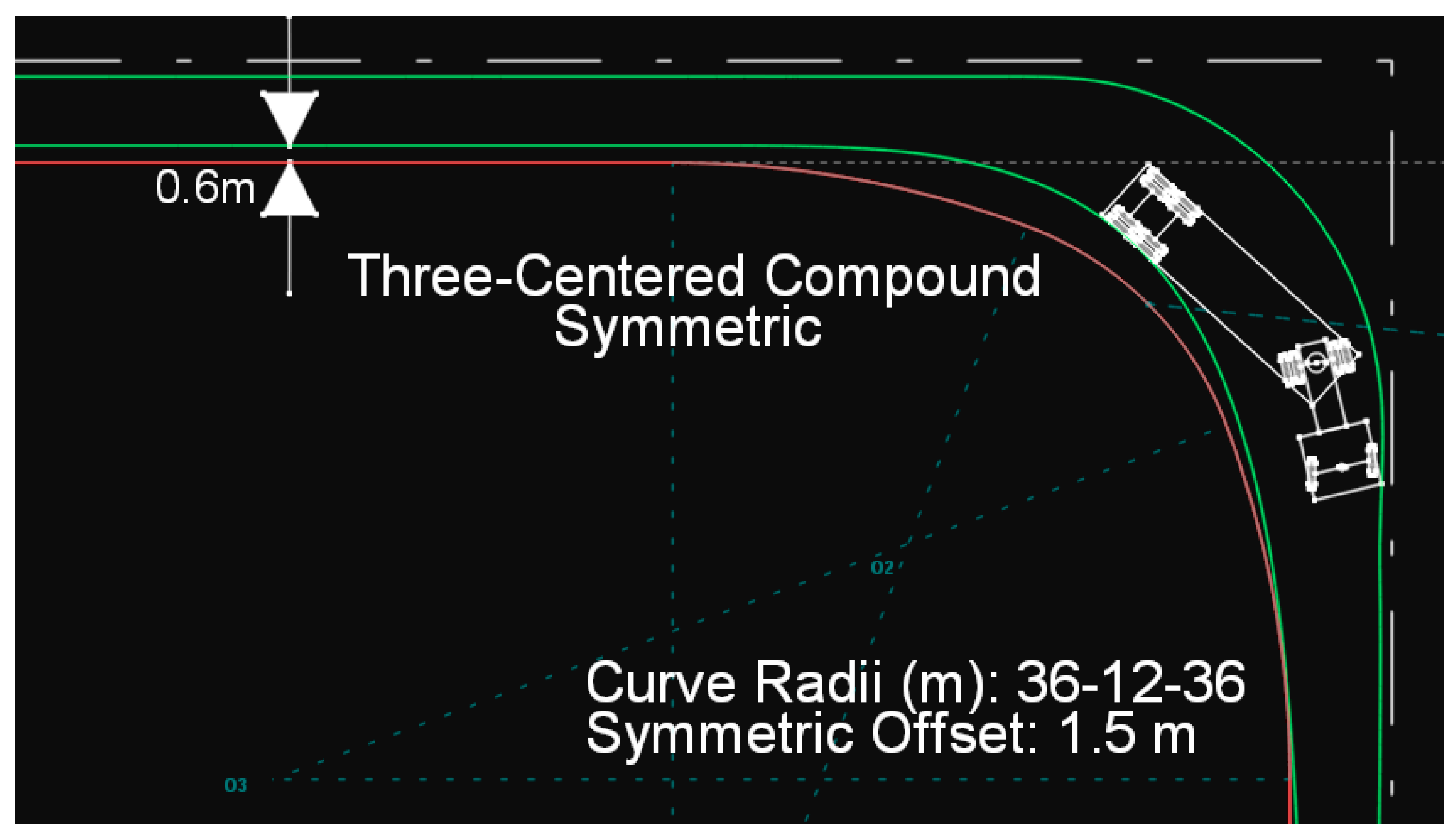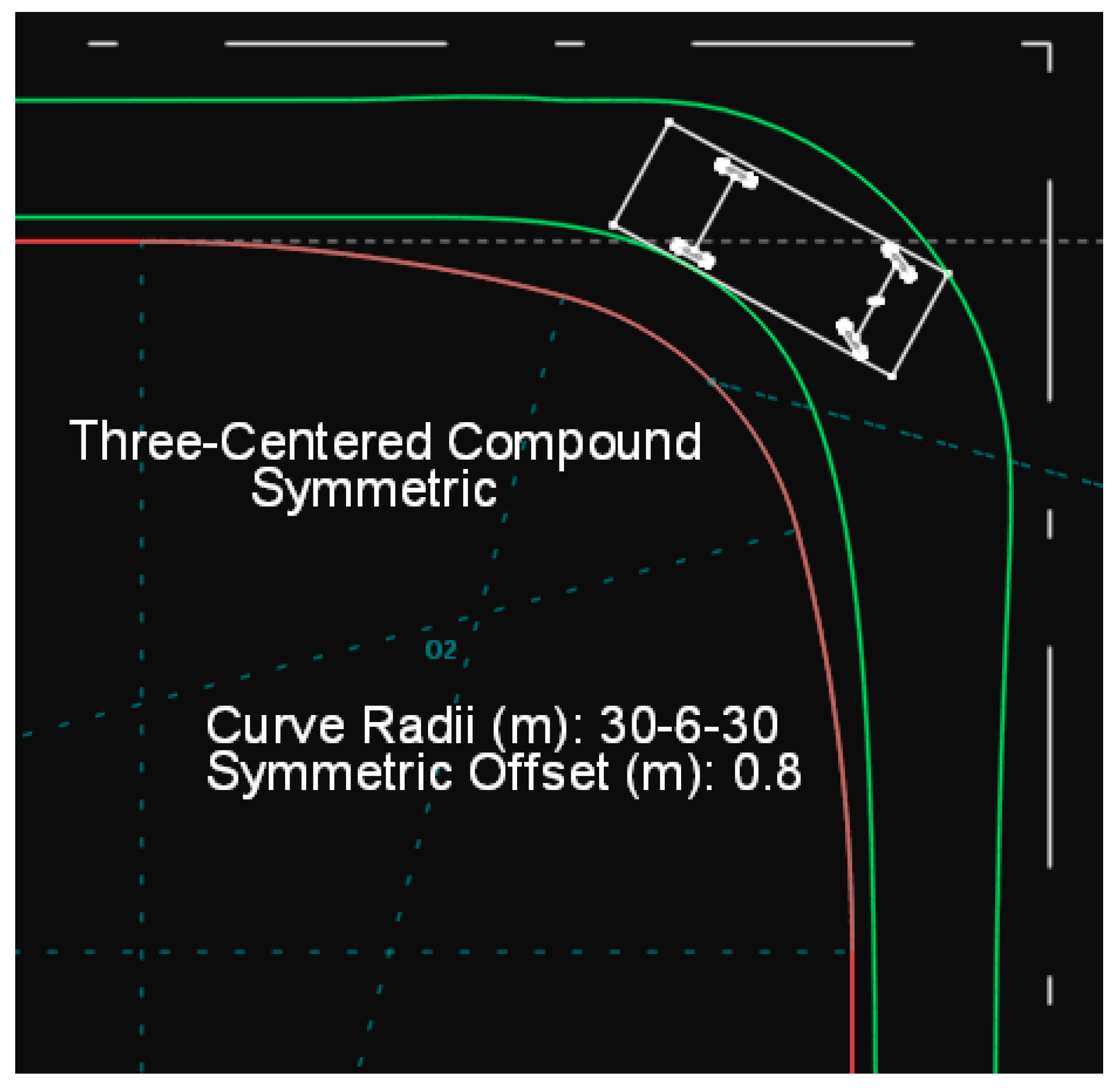 Figure 2 illustrates the trajectory of a design vehicle of type P on a symmetric three-centered compound curve drawn in Anadelta Tessera. In Figures 2–11 and 13–24, green color lines illustrate the swept path width for the design vehicles and red color lines illustrate the edge-of-traveled way.