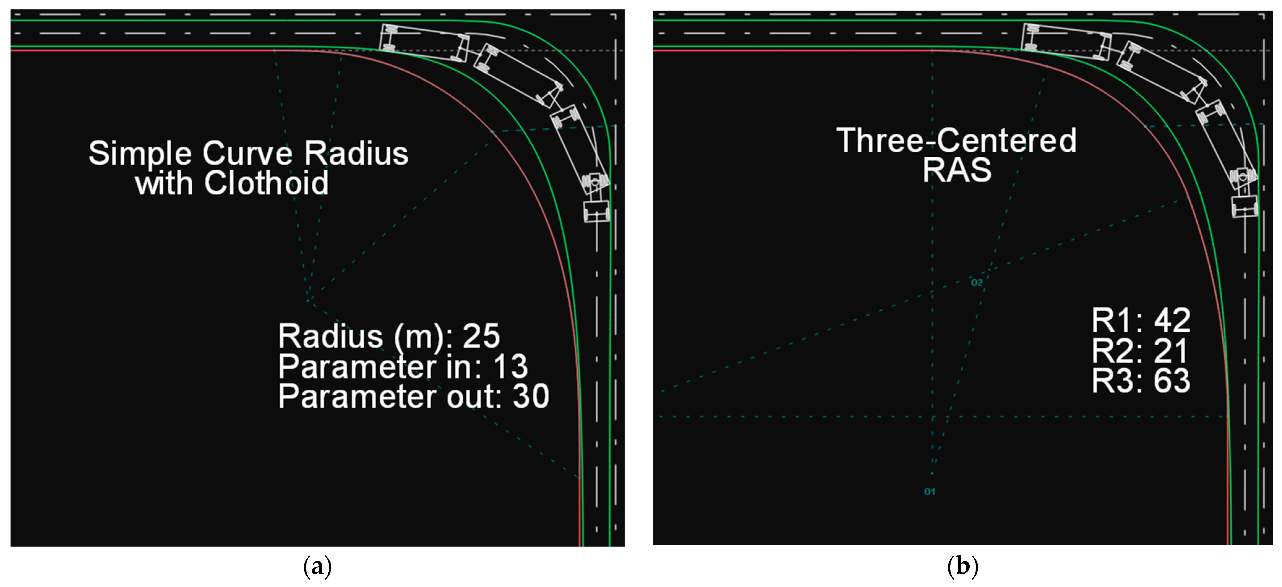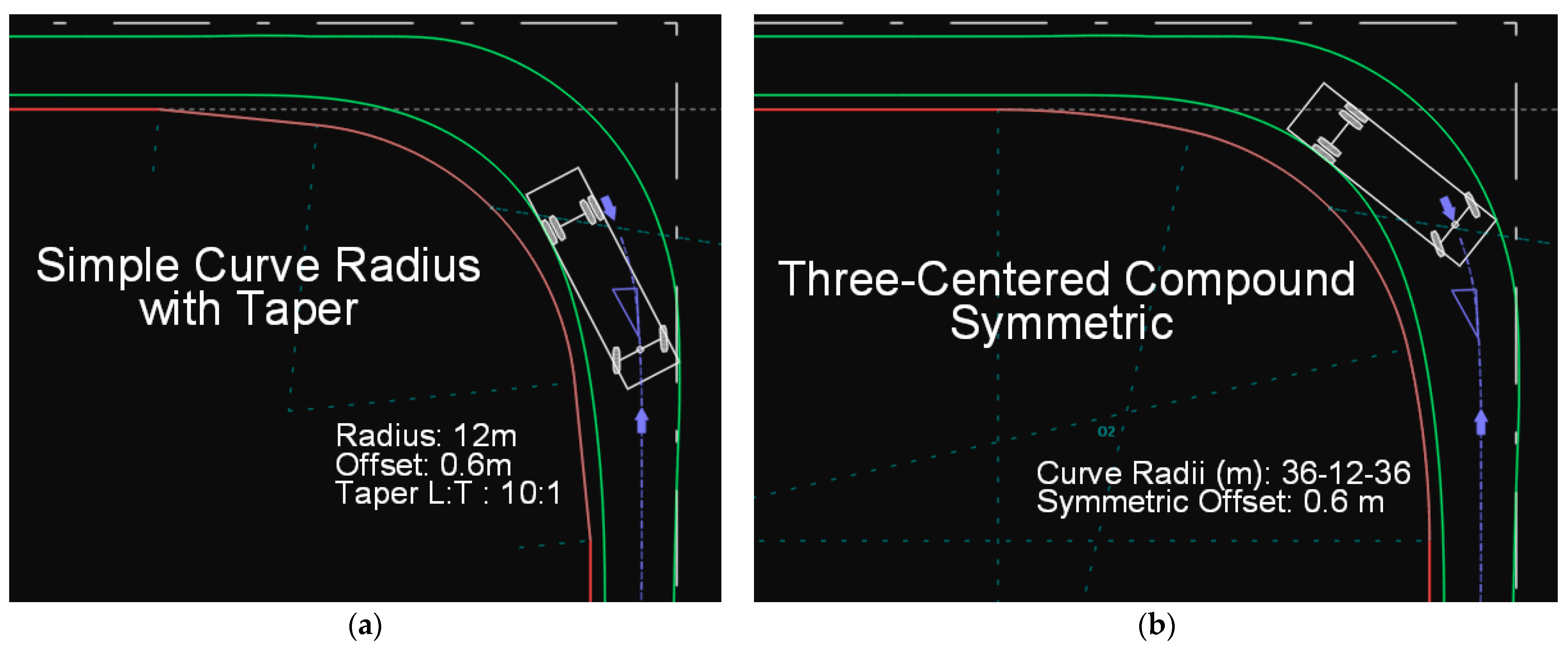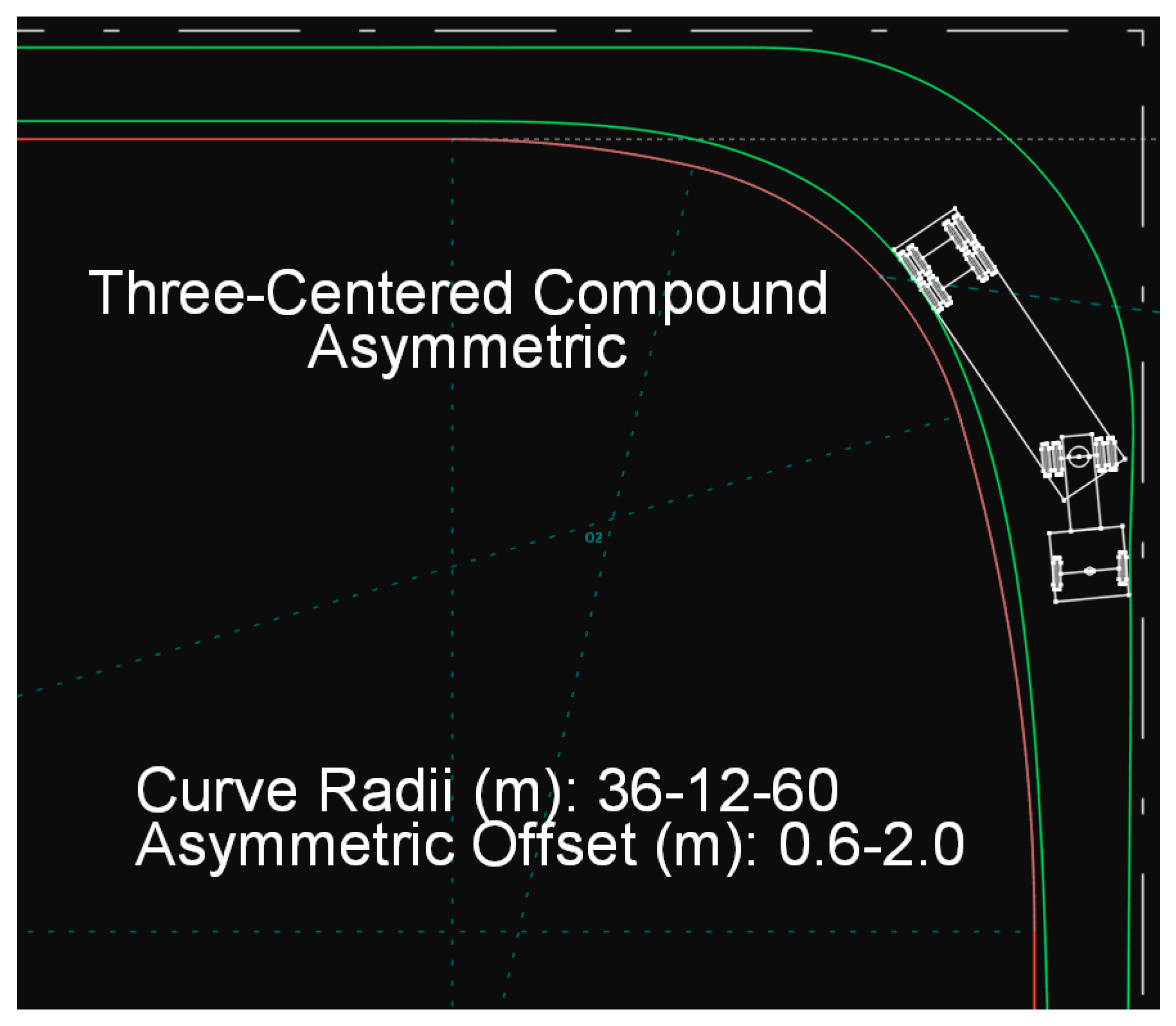 Figure 2 illustrates the trajectory of a design vehicle of type P on a symmetric three-centered compound curve drawn in Anadelta Tessera. In Figures 2–11 and 13–24, green color lines illustrate the swept path width for the design vehicles and red color lines illustrate the edge-of-traveled way.