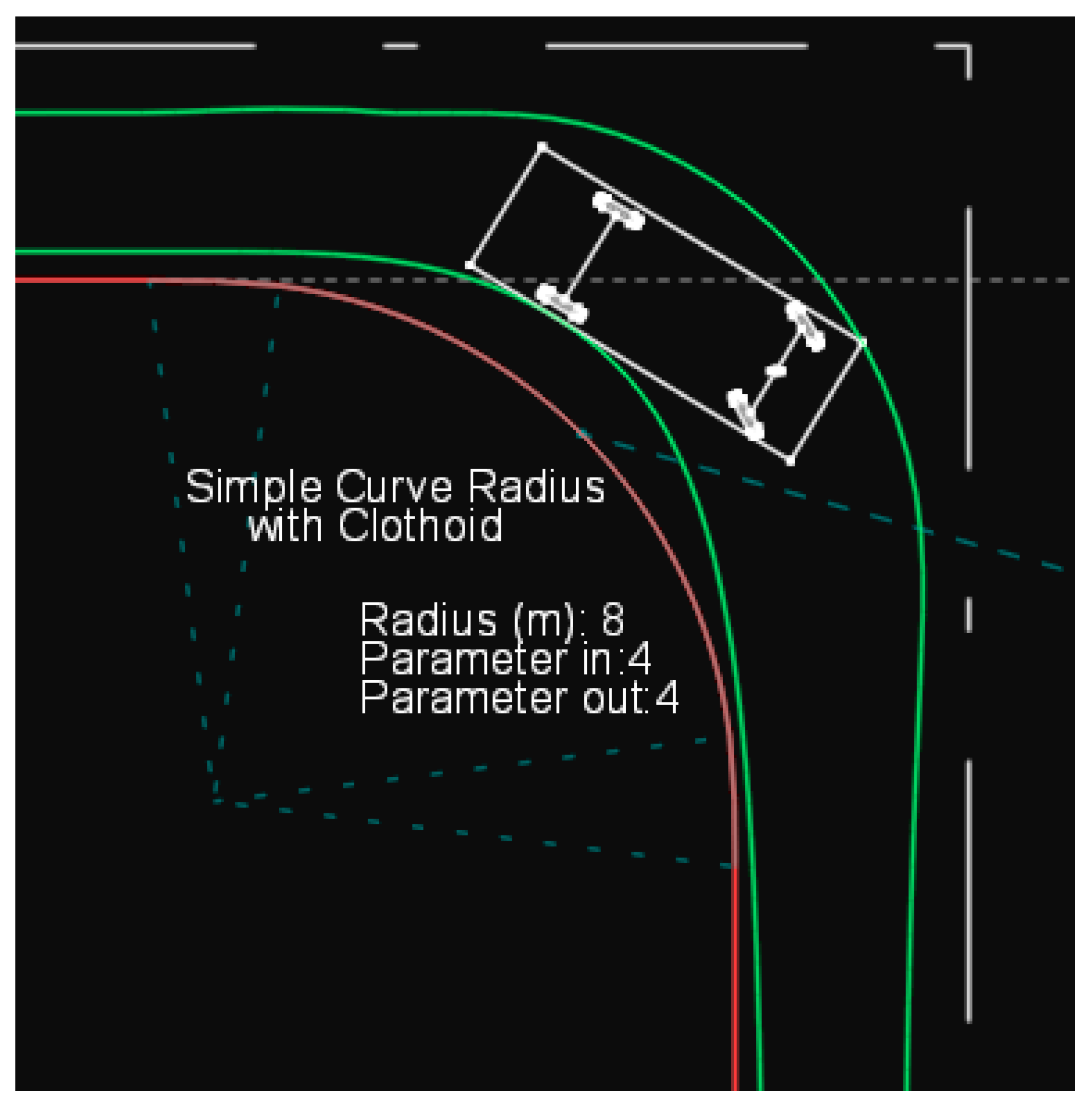 14], which are characterized by a gradual and continuous change in curvature. Clothoids are widely used in highway alignment design due to their benefits for driver comfort and vehicle dynamics, particularly at higher speeds. However, their potential applications in low-speed, tight-turn intersection scenarios remain underexplored. The continuity of curvature offered by clothoids could improve vehicle clearance and reduce abrupt steering changes, especially for long vehicles with significant off-tracking.