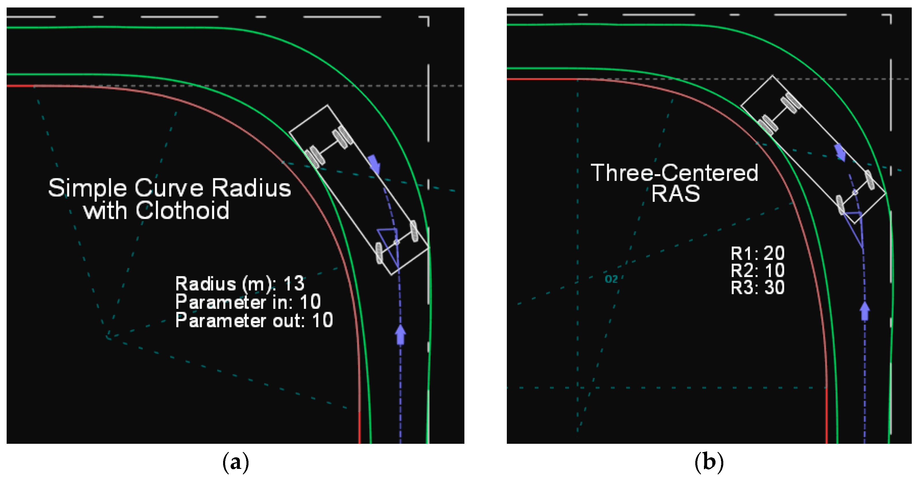 (a) Path of the SU-12 type truck on a simple circular arc with clothoid transitions on both ends. (b) Path of the SU-12 type truck on a three-radius RAS curve.