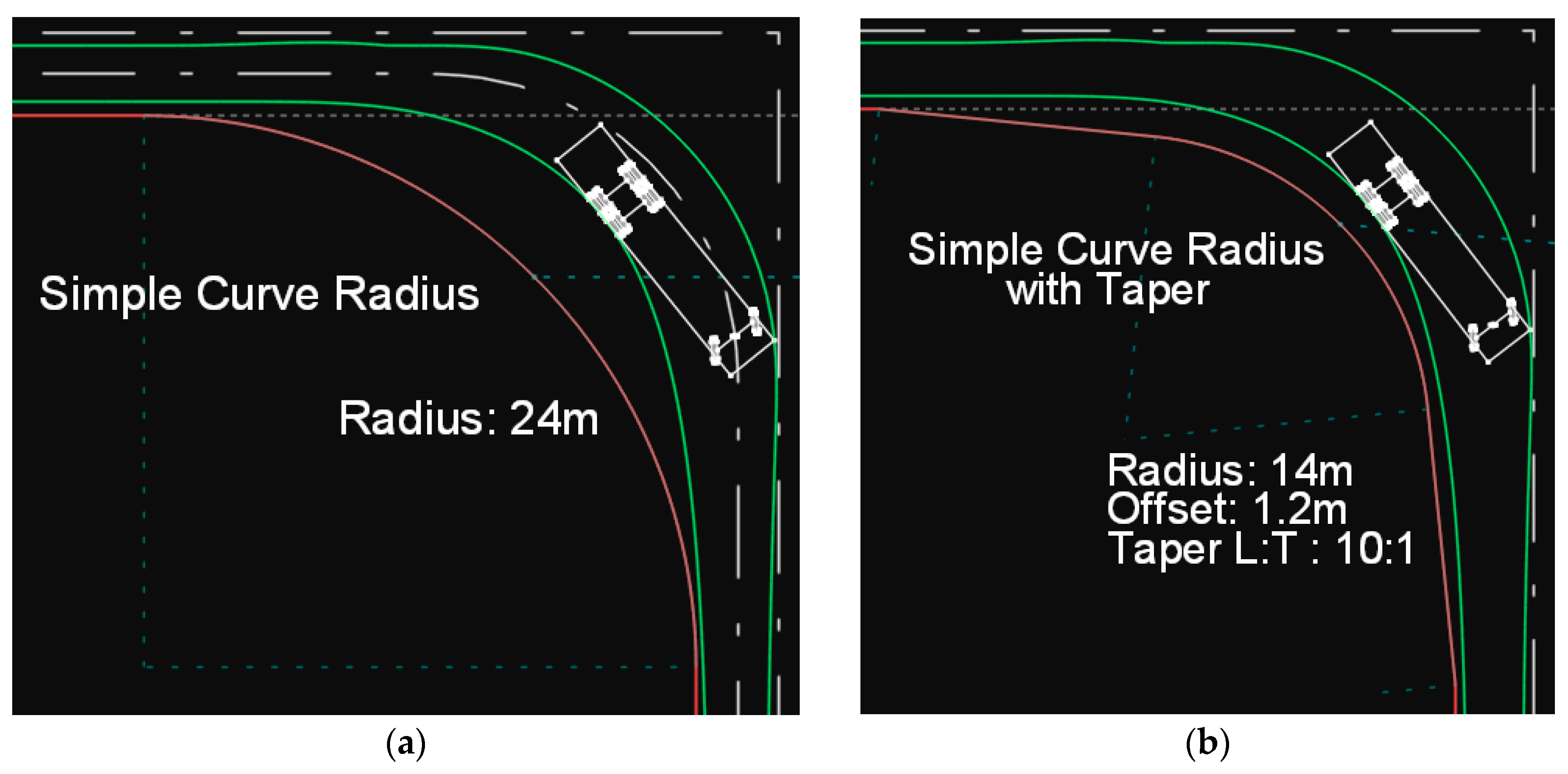 (a) Path of the SU-12 type truck on a simple circular arc. (b) Path of the SU-12 type truck on a simple circular arc with taper.