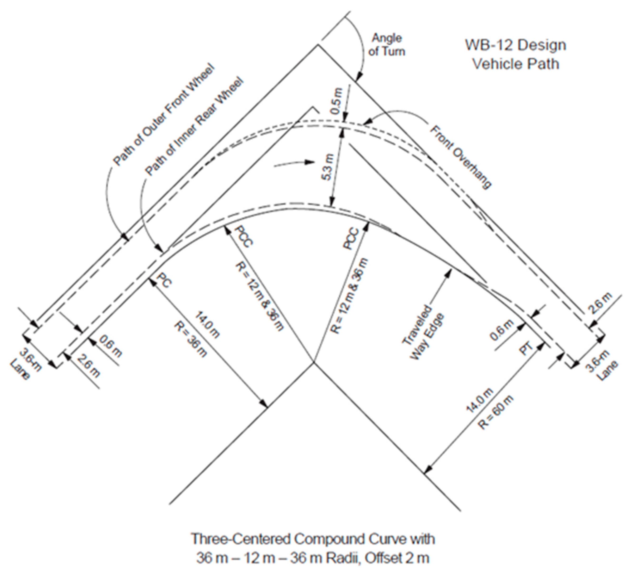 - Saha, U. A Swept Path Analysis of Intersection Designs for Long Combination Vehicles. Master’s Thesis, Graduate Program in Civil Engineering. York University, Toronto, ON, Canada, 2021. Available online: https://yorkspace.library.yorku.ca/items/8a4bd4a9-5e75-463e-b998-d111ae479c4b (accessed on 1 November 2025).