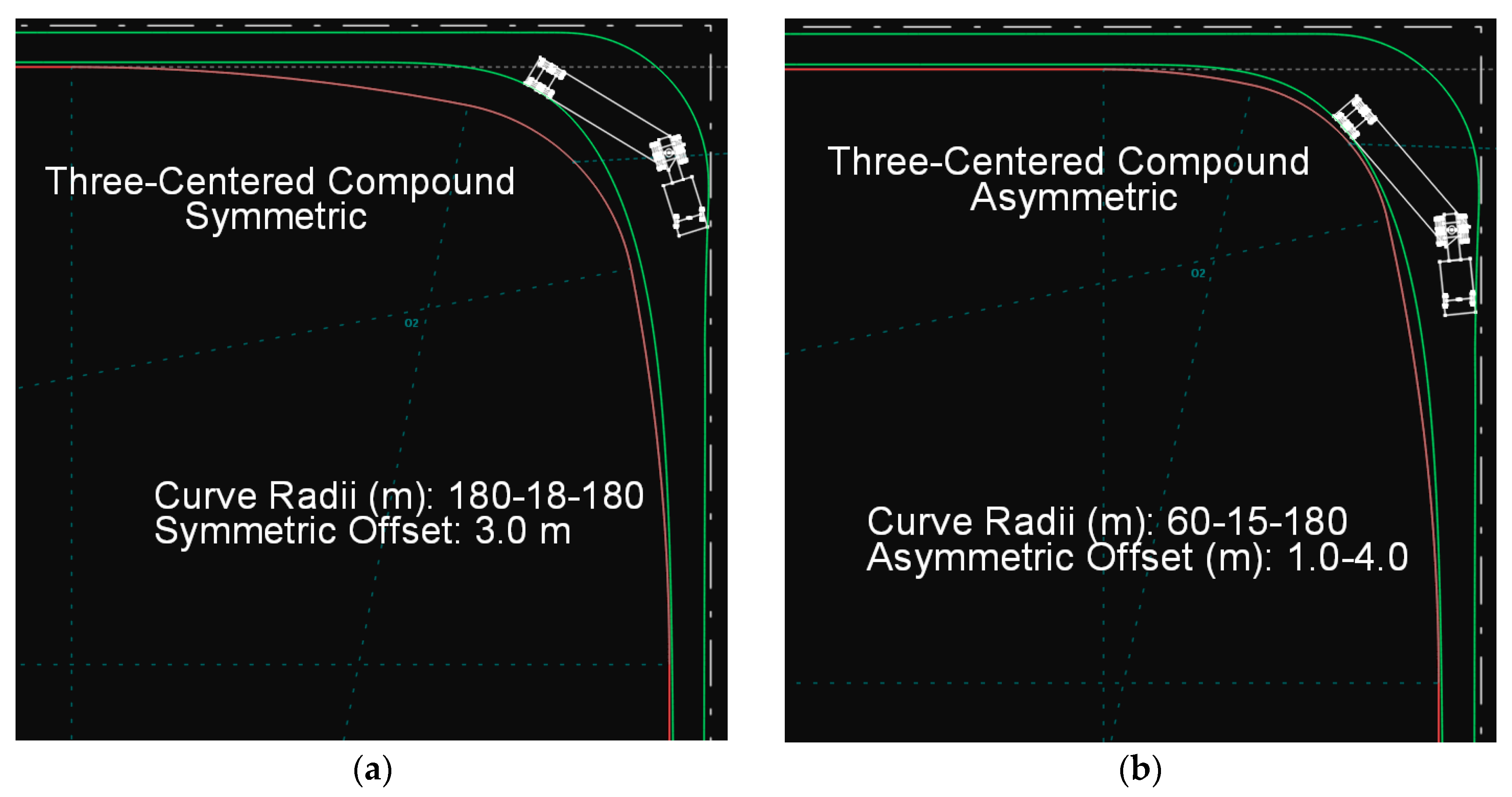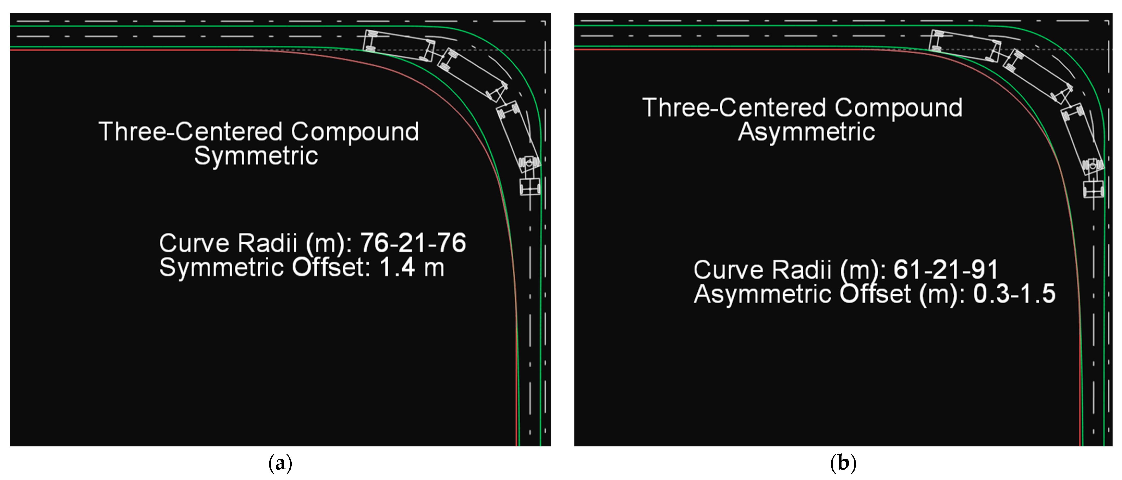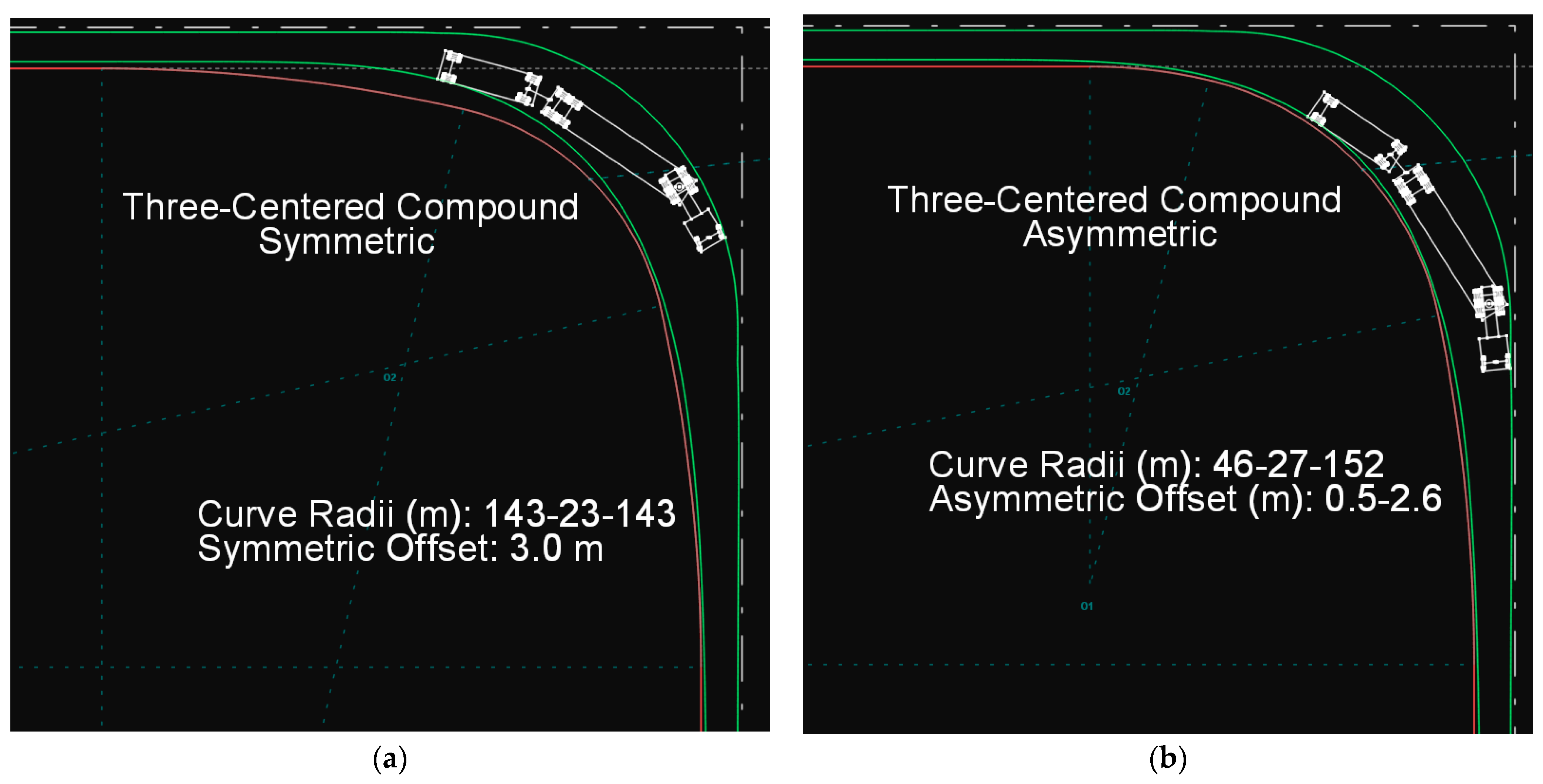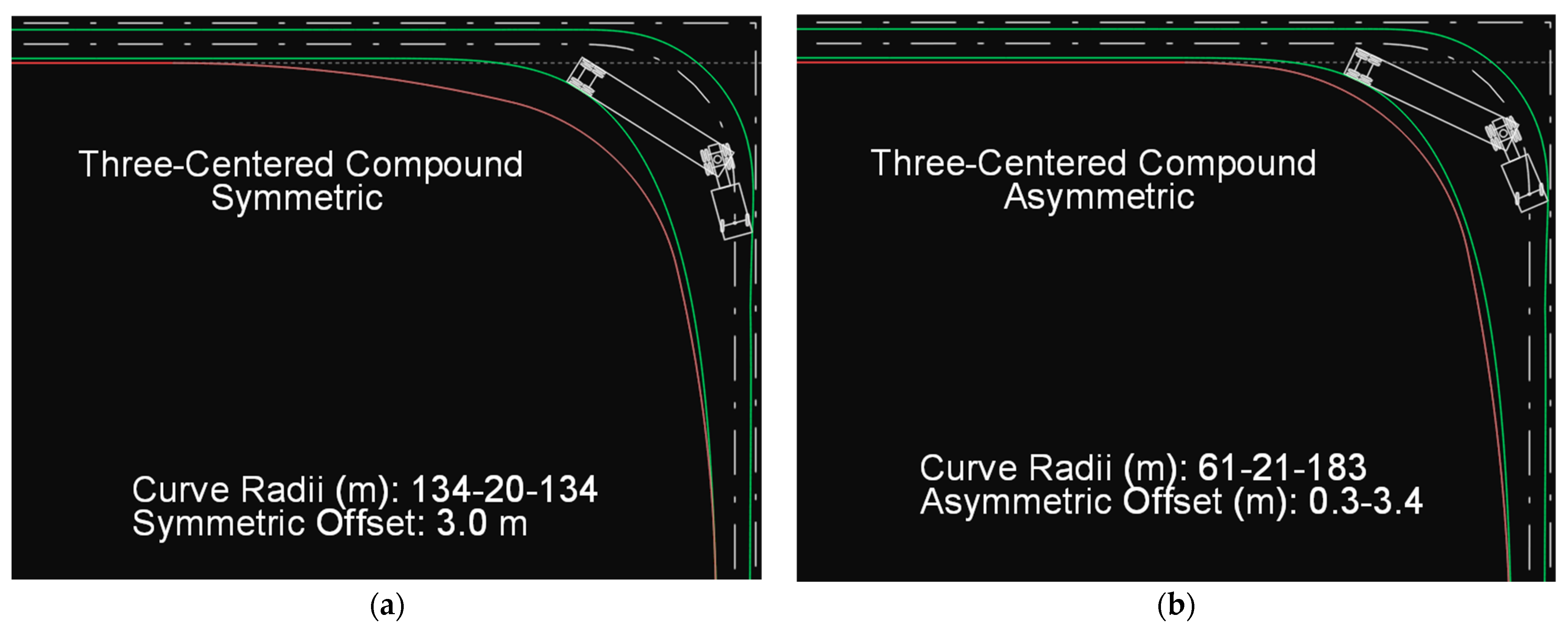 (a) Path of the SU-12 type truck on a symmetric three-centered compound curve. (b) Path of the SU-12 type truck on an asymmetric three-centered compound curve.