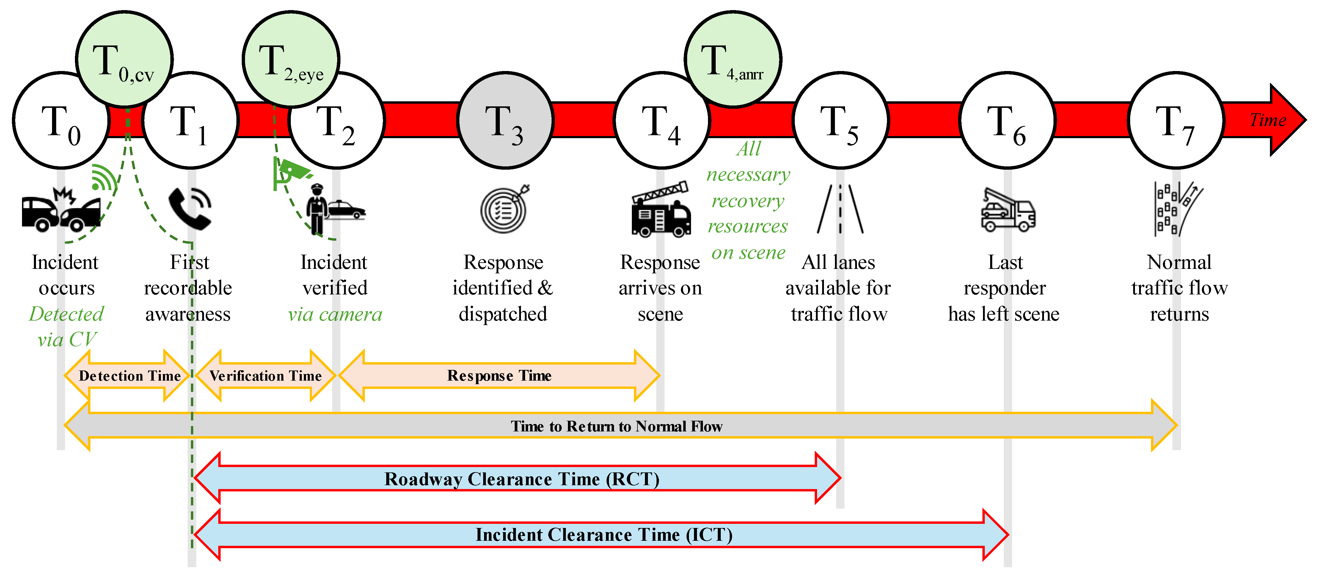 - Incident Clearance Time (ICT): The time from the initial detection (T1) to when all responders have left the scene (T6).