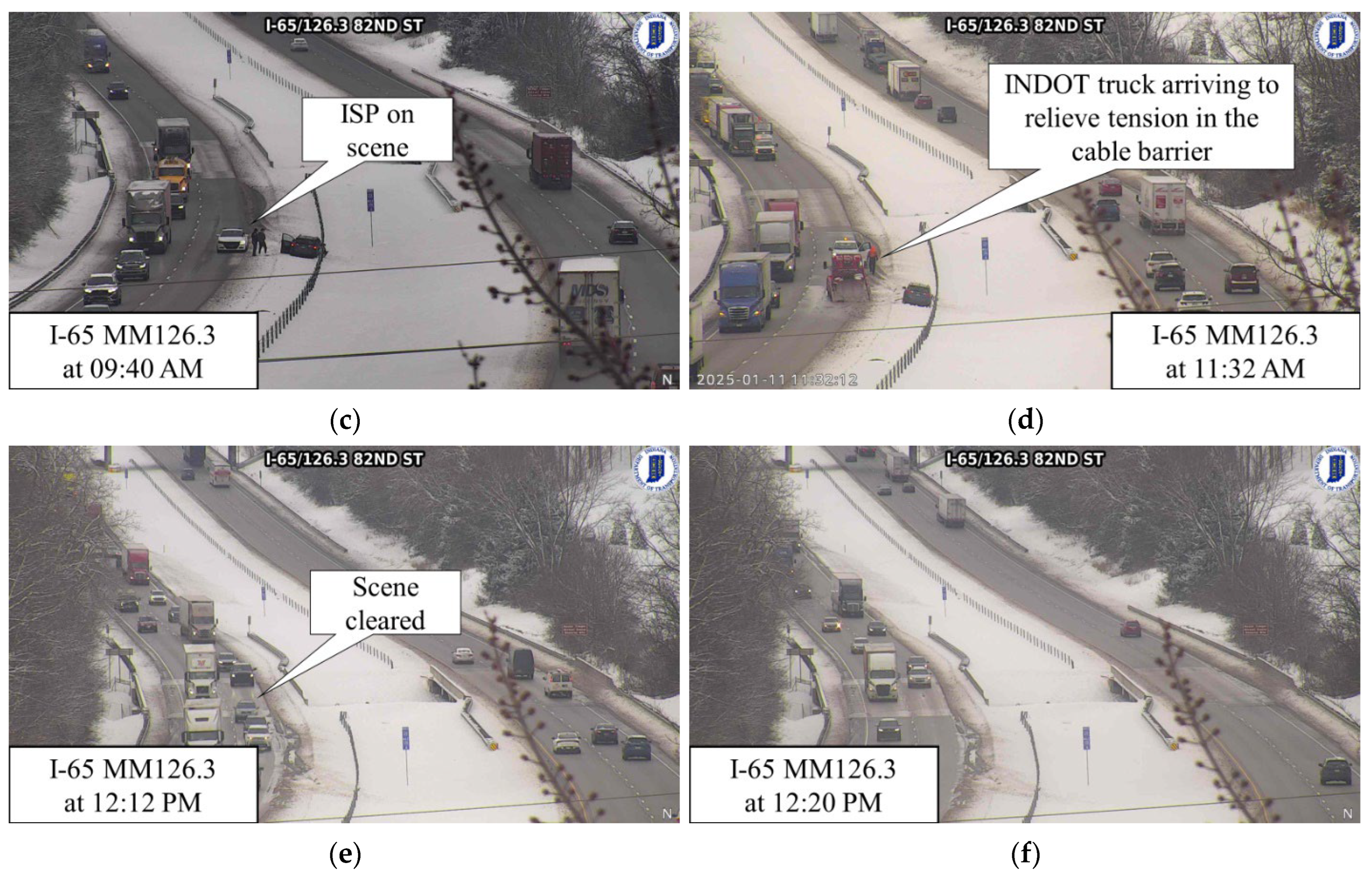 - A passenger vehicle slide-off with entanglement in a cable median barrier. One lane blocked for 3 h with a total incident duration of 3 h and 12 min. The estimated RRMT was 112 min.