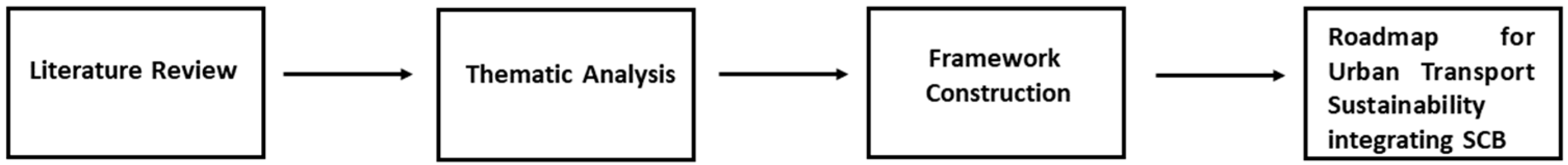 This study employs a theory-building methodology to develop a conceptual framework that explores the integration of transport planning and SCB as a strategic pathway toward fostering sustainable urban development. Given the exploratory and interdisciplinary nature of the research problem, a conceptual and synthesis-oriented approach was deemed appropriate for synthesizing knowledge across fields and constructing a framework that captures the complexity and multidimensionality of SCB within transport planning. The methodology unfolds in several stages as shown in Figure 1.