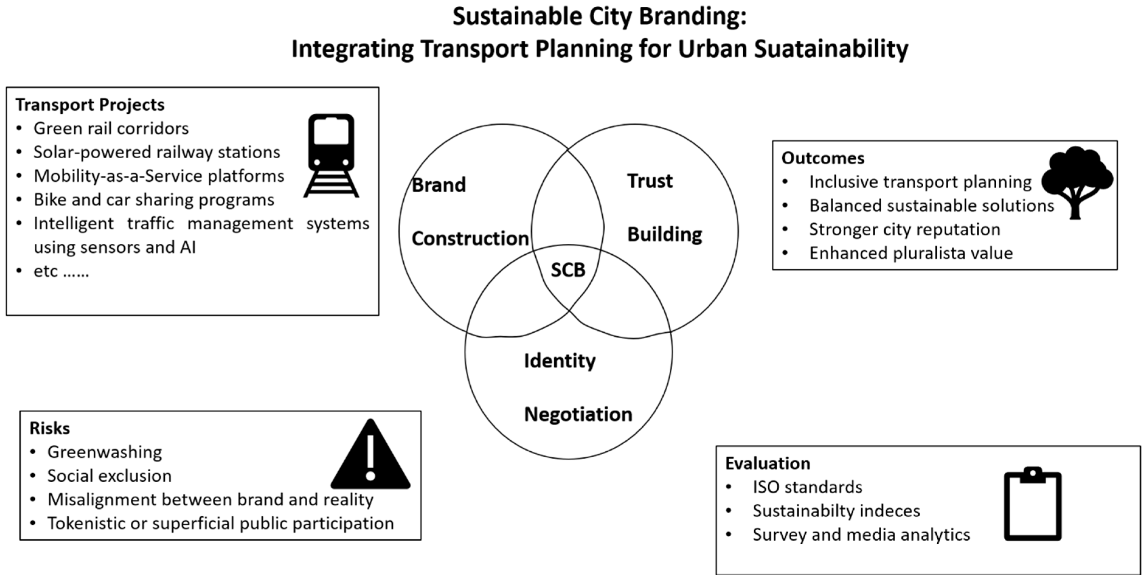• Explicit integration with transport planning. While earlier frameworks focus on branding or sustainability independently, our model directly links SCB with sustainable mobility as a lever for urban transformation.