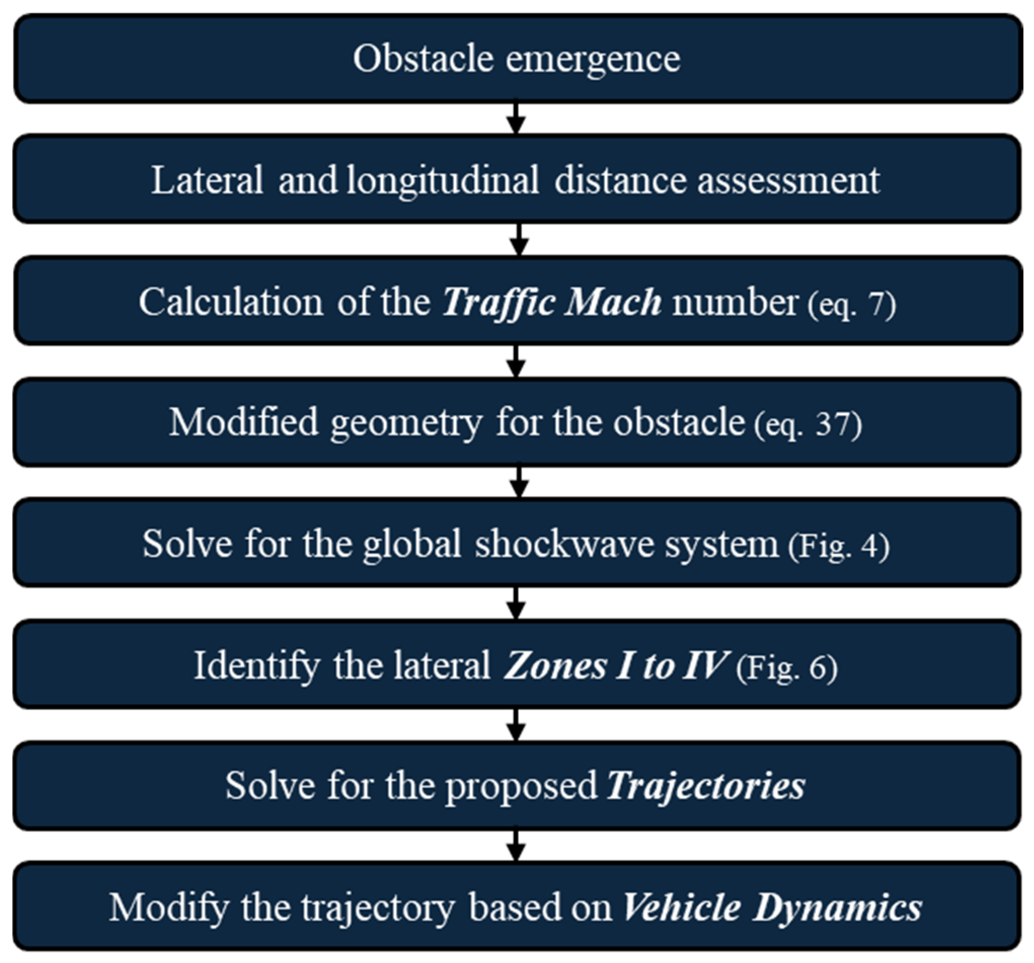 The flow field shockwave and expansion-fan system can be consequently configured, resulting in determination of the trajectories bulks of fluid would take, which are primarily suggested to vehicles upstream to avoid colliding with an obstacle. However, the mathematically driven trajectories of macroscopic supersonic compressible fluid flow show discontinuities in speed, acceleration, and direction, which are not practically followable by traffic flow. Therefore, all of the proposed trajectories have been input into the criteria in the field of vehicle dynamics and path planning to check the feasibility of vehicle control in following the trajectories in an approximate fashion, while not deviating from the primary fluid mechanical concerns of the method.