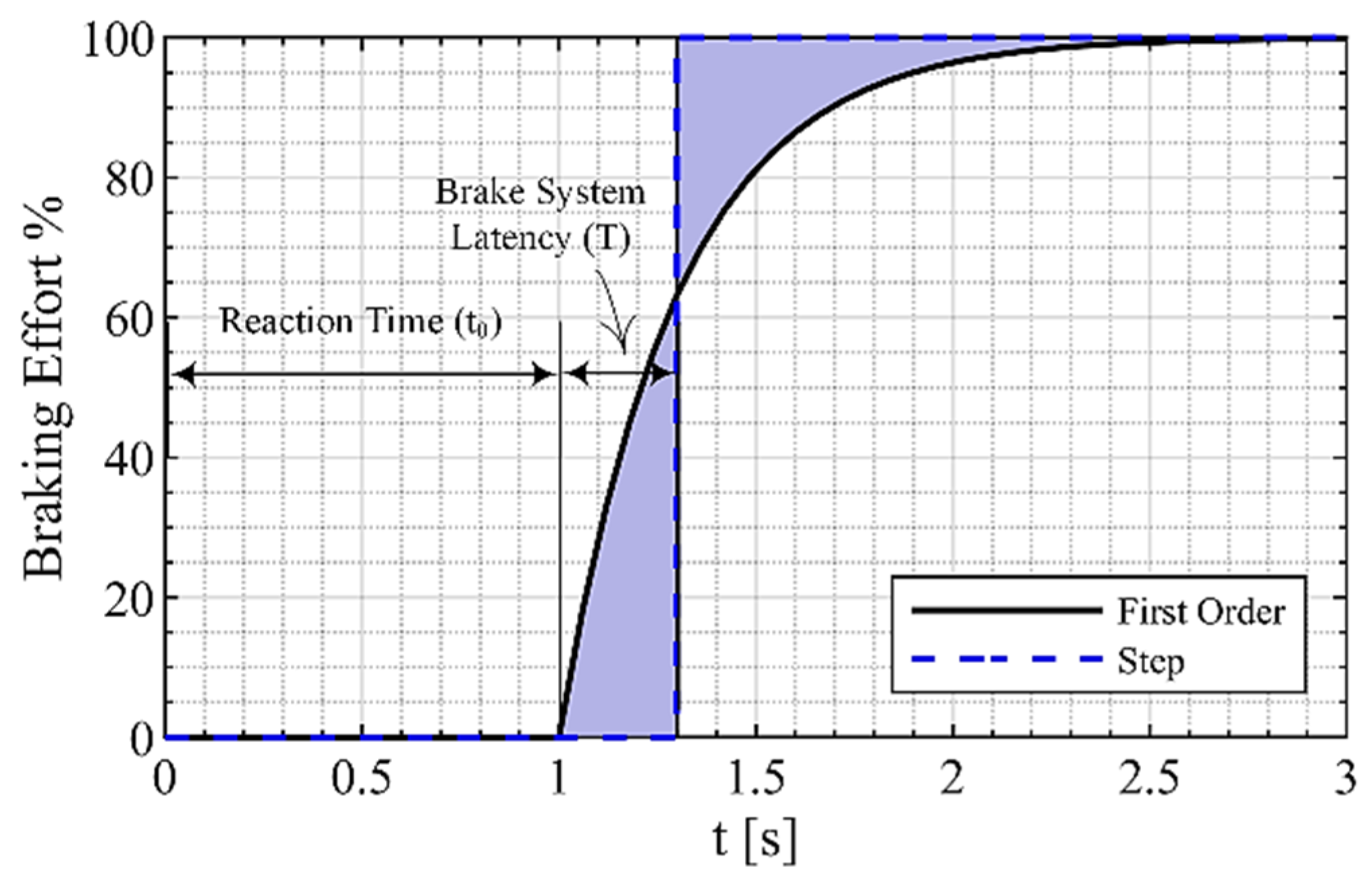 A realistic model of the braking action, including both the driver’s reaction delay and the latency in the brake system, which may be simplified to a first-order transfer function with a time constant