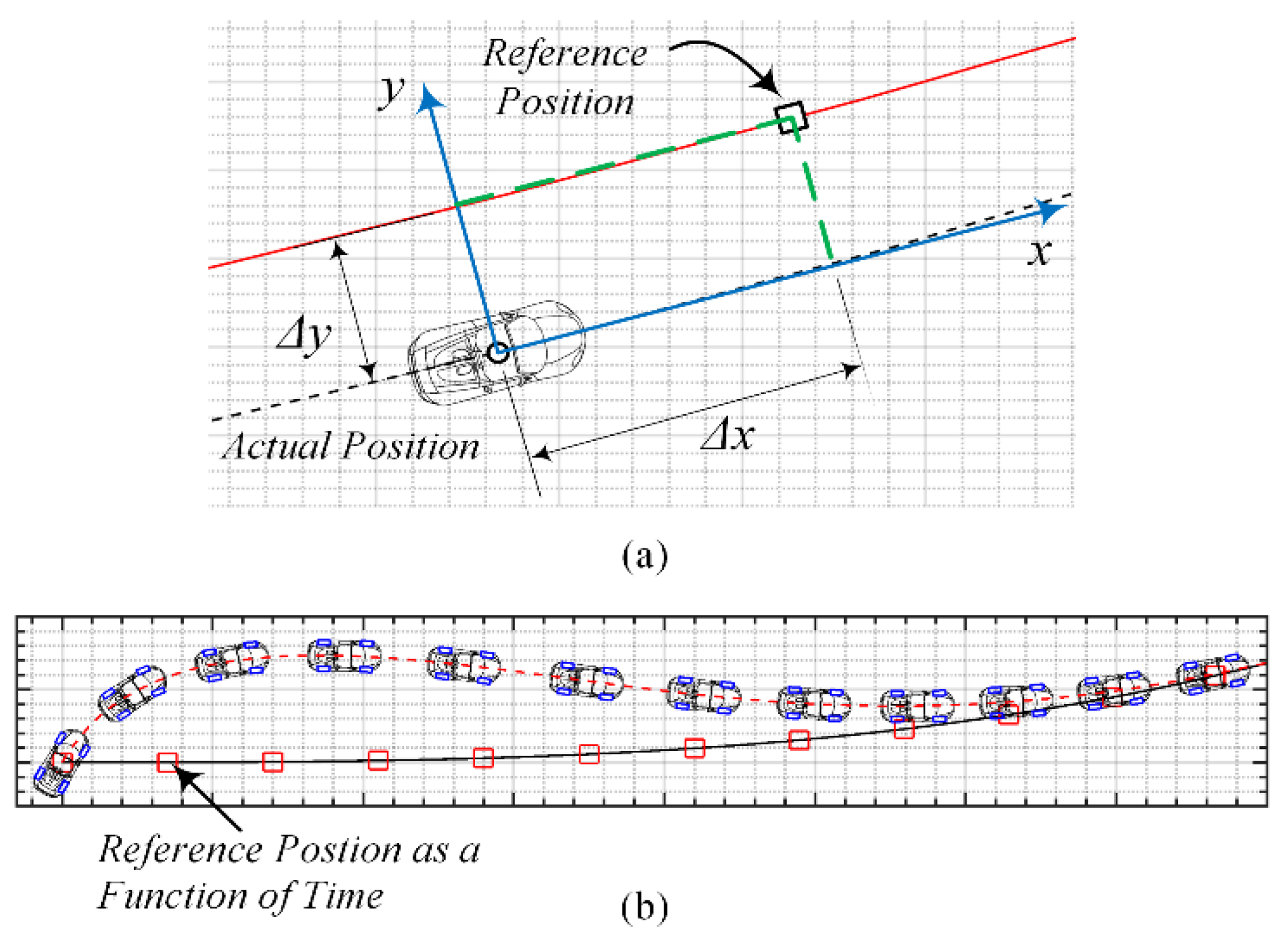 Figure 19a show the target (dashed lines) and the actual (solid lines) paths of motion in all four cases. There are negligible differences between the cases, and in all of them, the beginning of the maneuver shows promising path tracking. The second half of the maneuver also shows reasonable deviation from the target path, considering vehicle dynamics. Hence, the value of