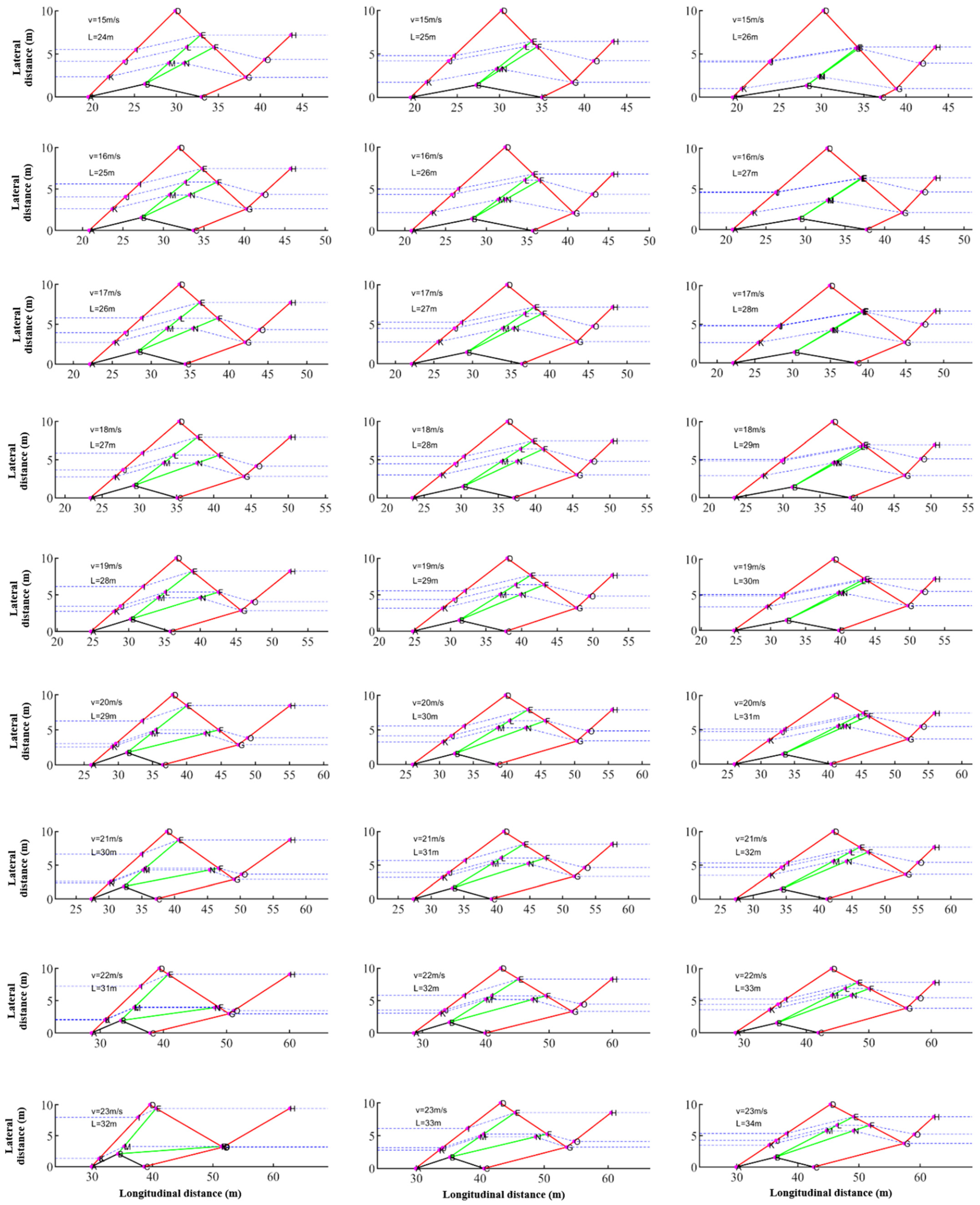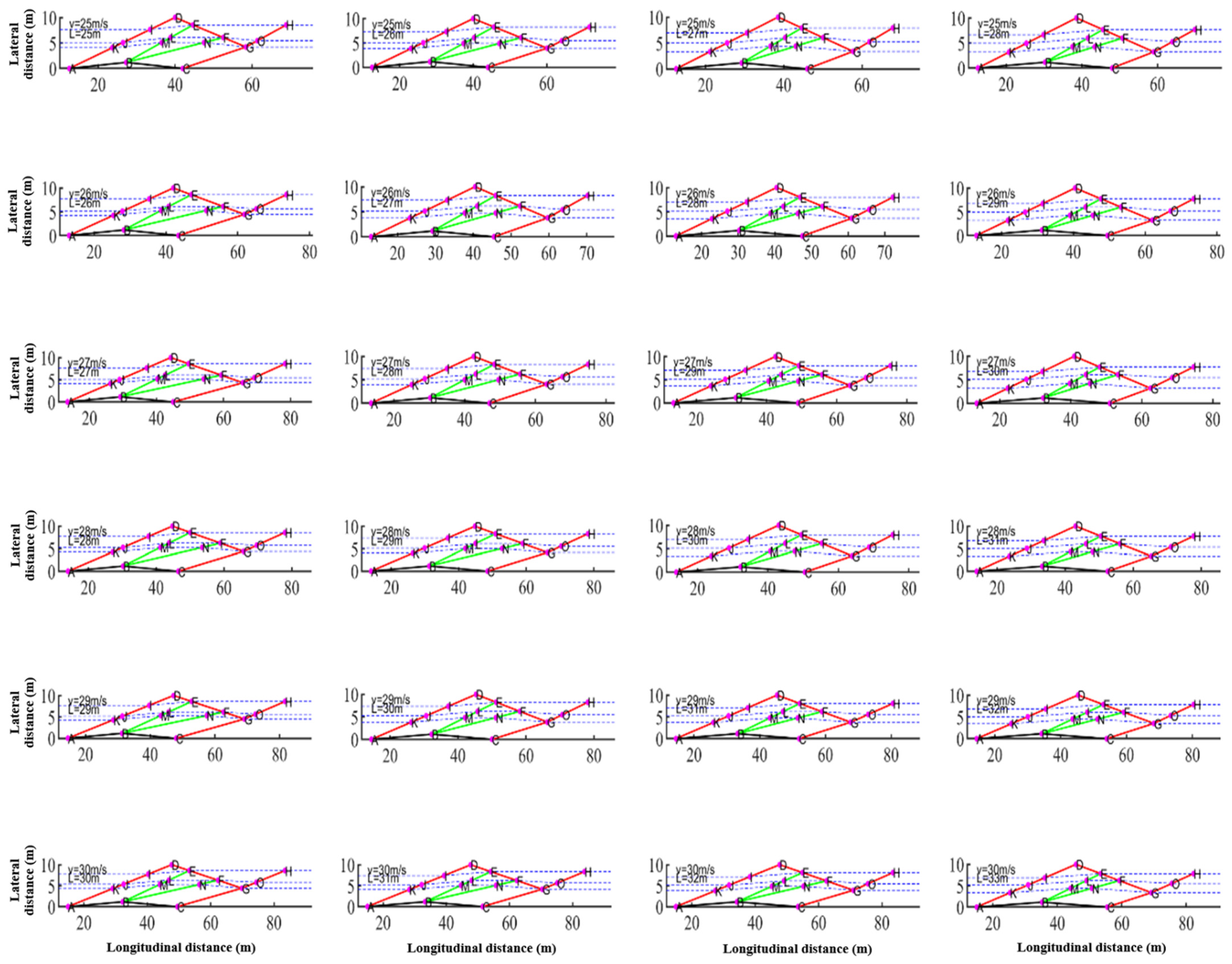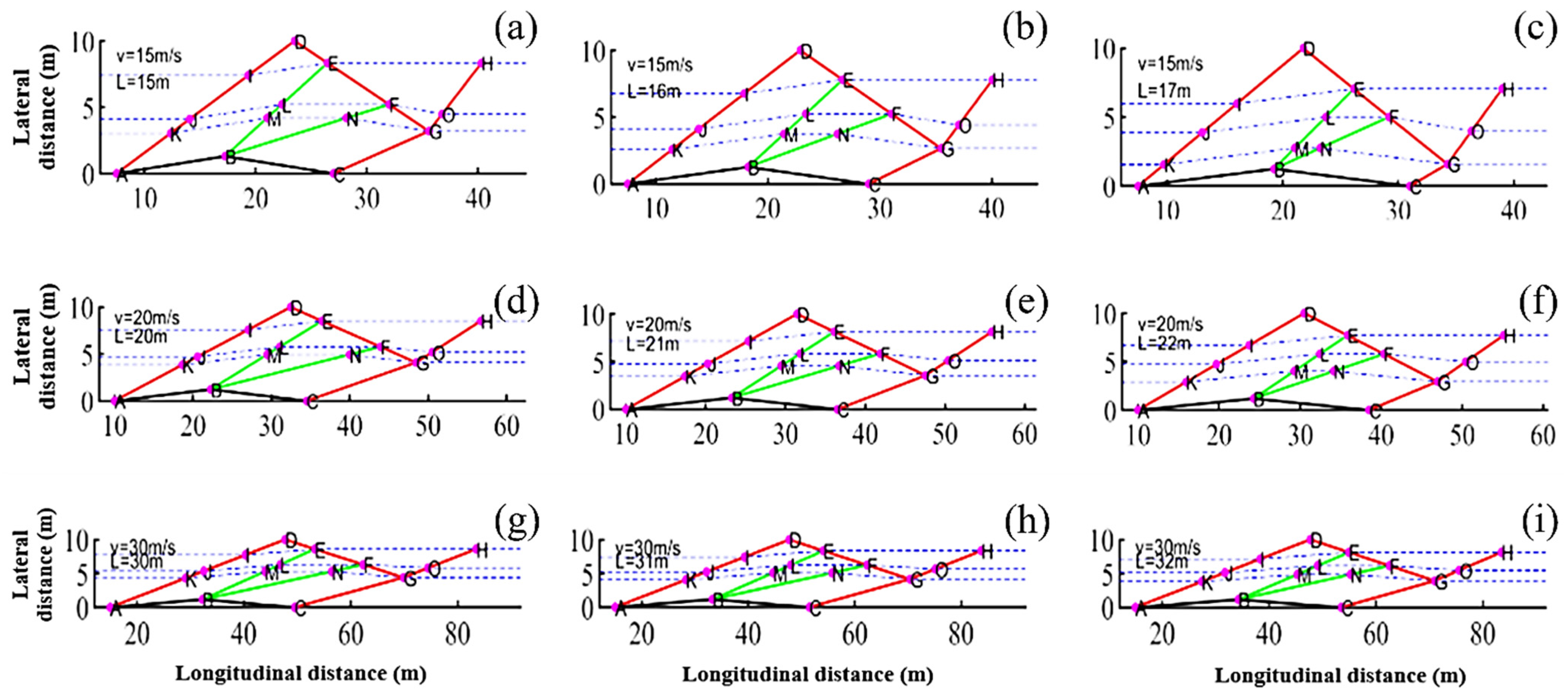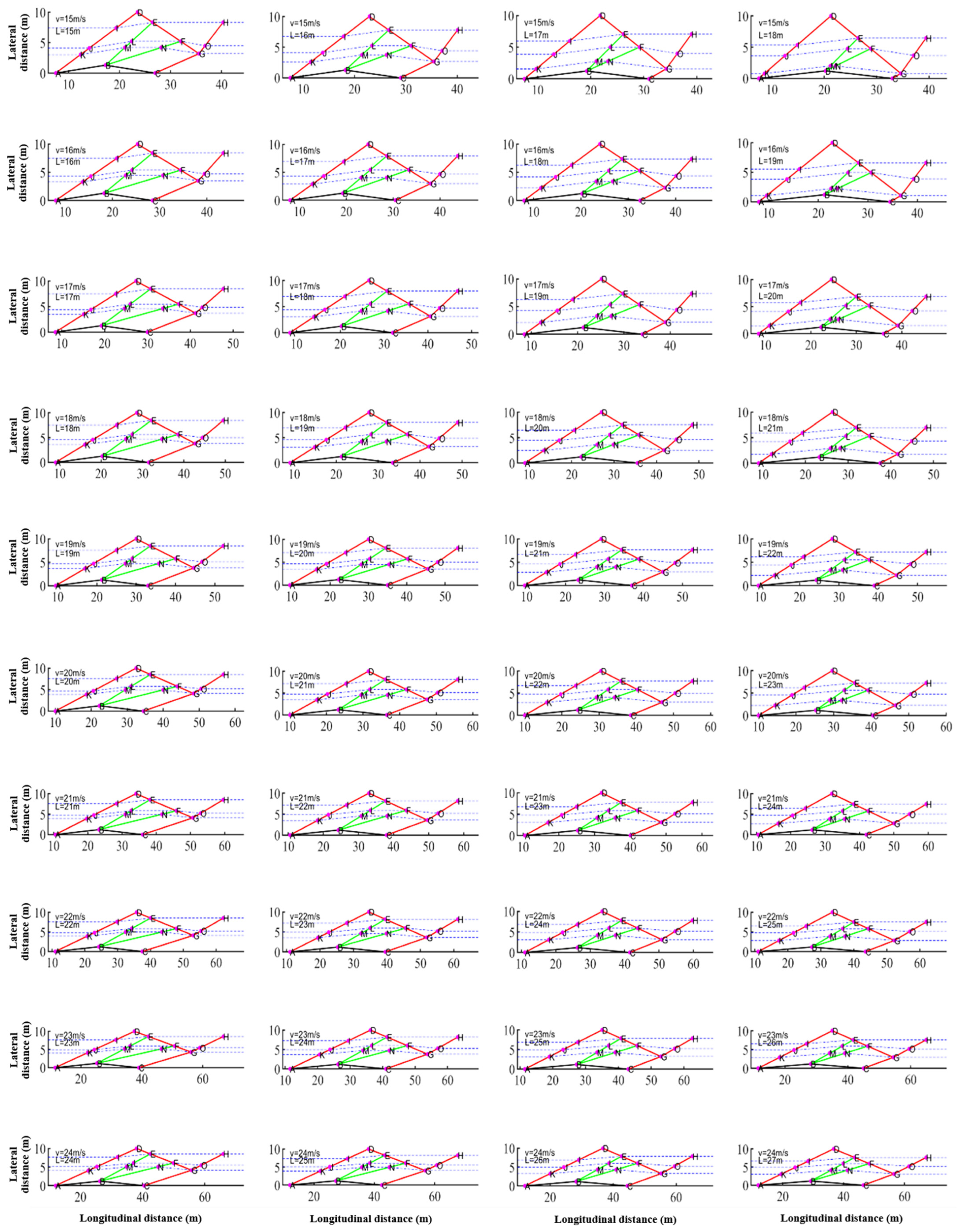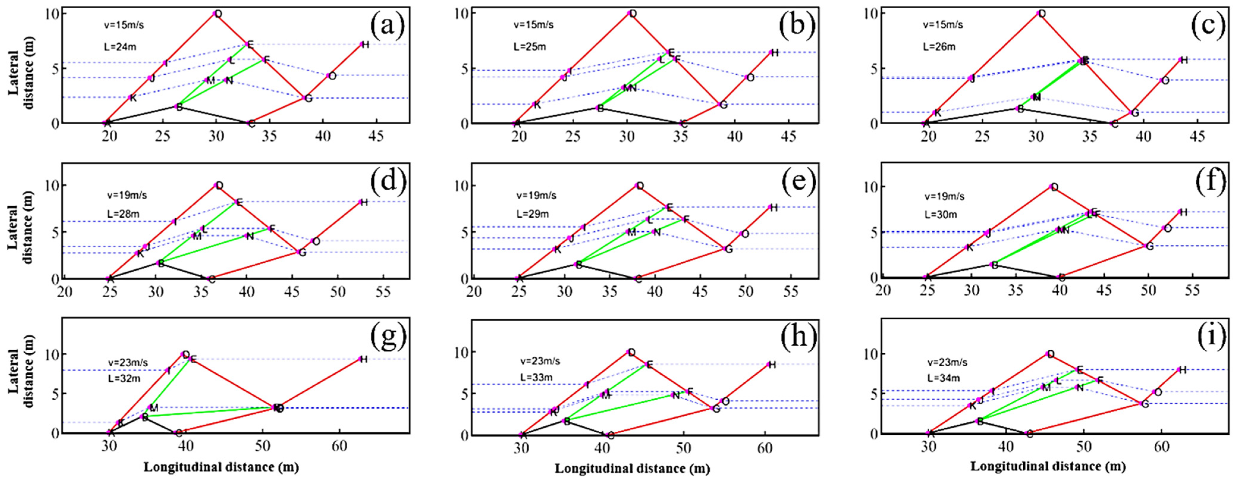 Figure 16g–i) that the lateral shift of the zone interfaces is negligible (i.e., near zero or at maximum reaching the width of a lane). This makes the maneuver to return to the original lateral position after the obstacle avoidance trivially manageable. This matter is discussed in the later part of this section.