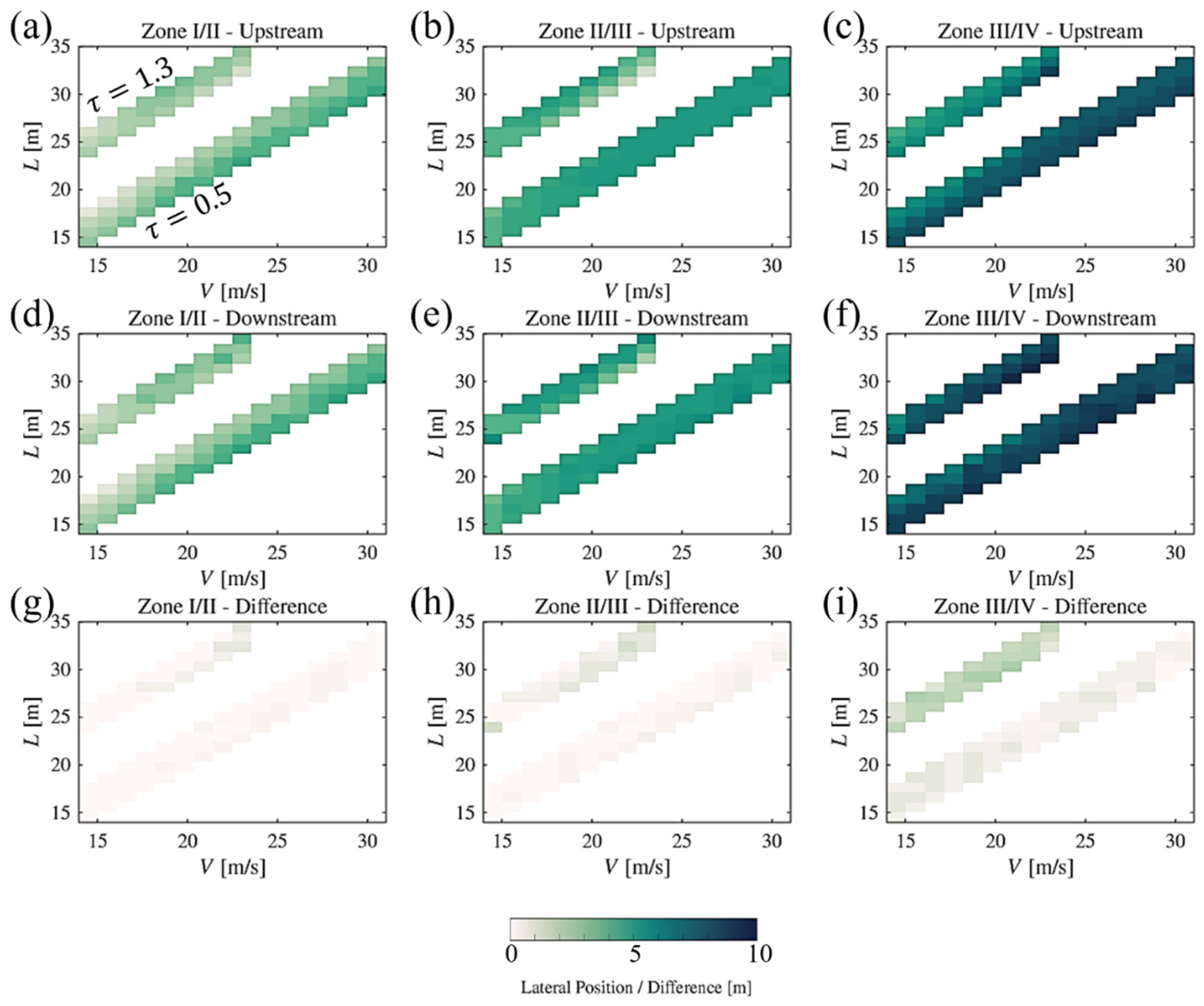 Figure 17 presents statistical analysis on the spread of the zone interfaces for different cases and in up- and downstream locations. It is seen that the maximum shift between the mean lateral location of the zone interfaces occurs for the human driver factors (