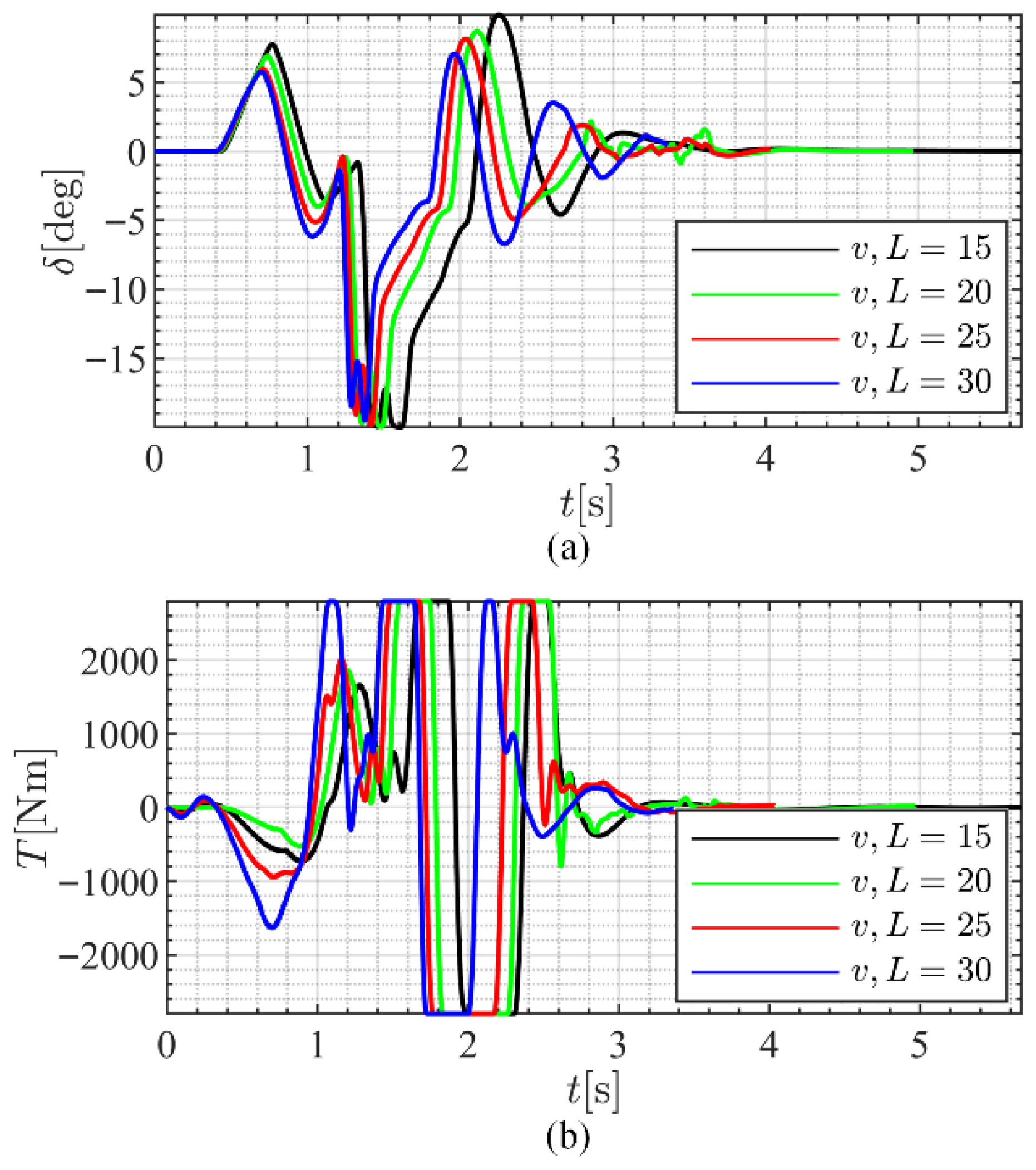 Figure 20 shows the required inputs to the vehicle at different initial velocities to follow the corresponding target path. The speed seems to mainly affect the phase of the inputs, rather than the magnitudes. Vehicles traveling at higher speeds need earlier control inputs compared to vehicles traveling slower.