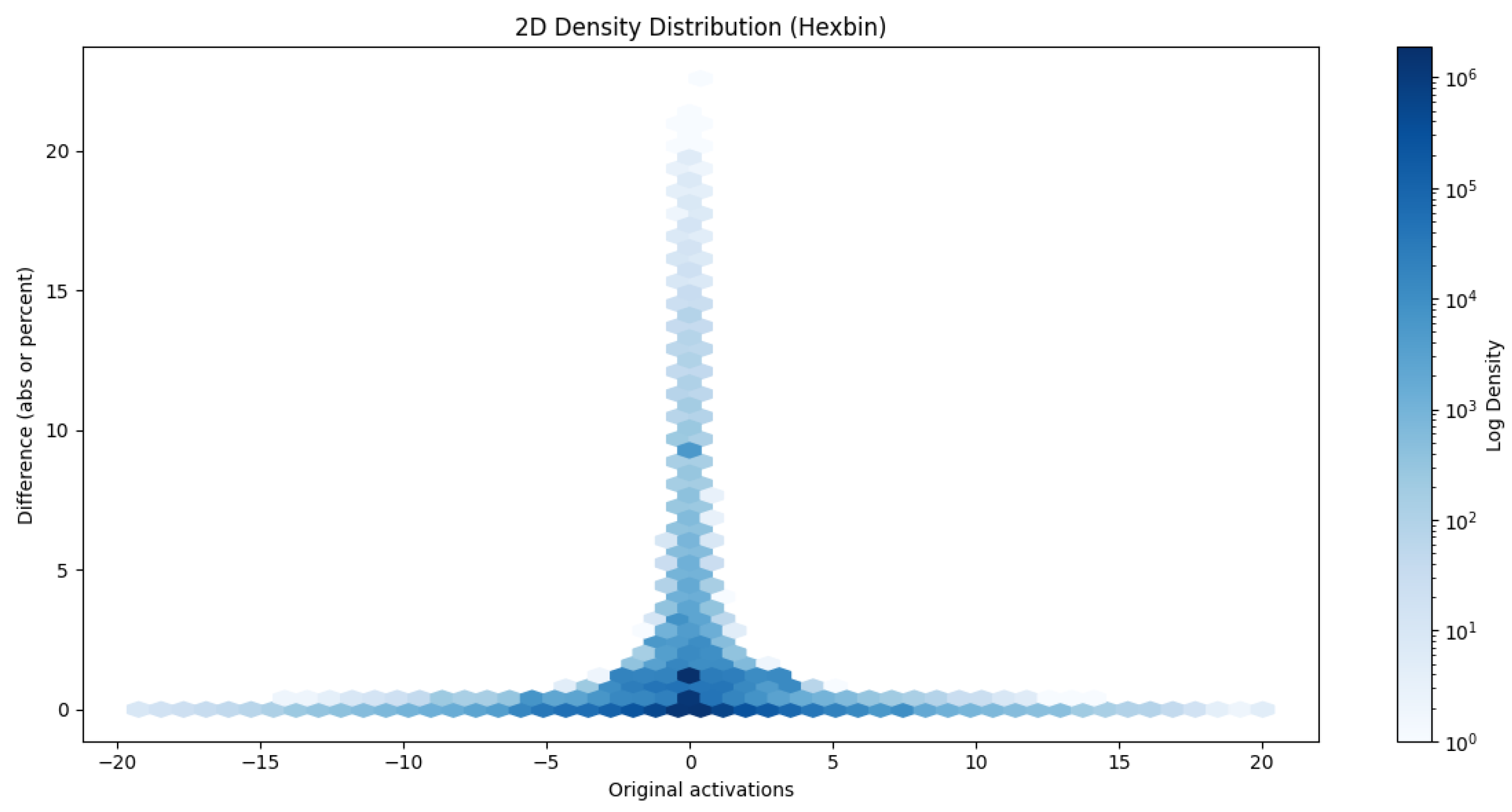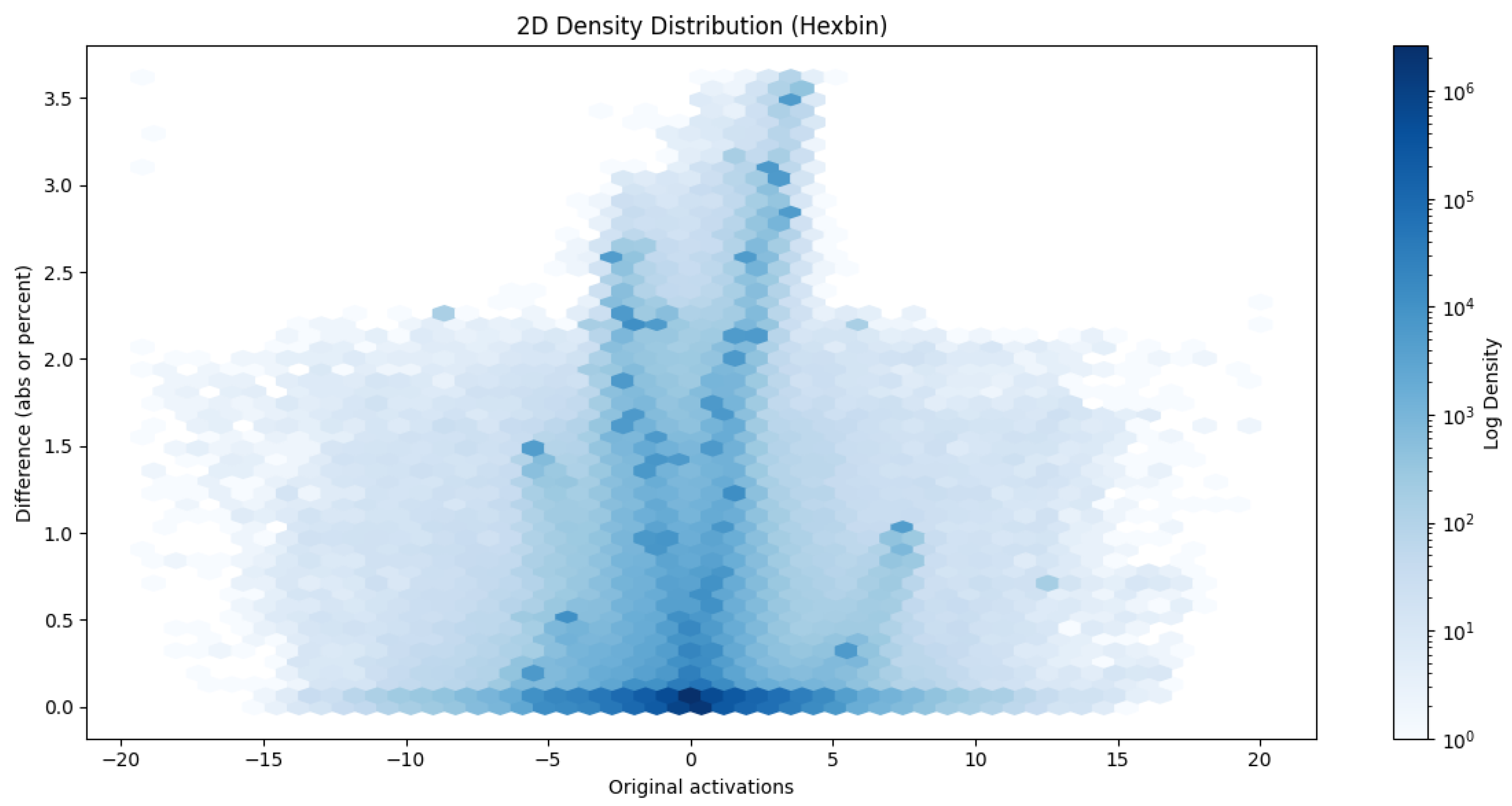 The error does not necessarily have to be grouped by pixel; we can also group by original activations and deviations from them, as shown in the following hexbins