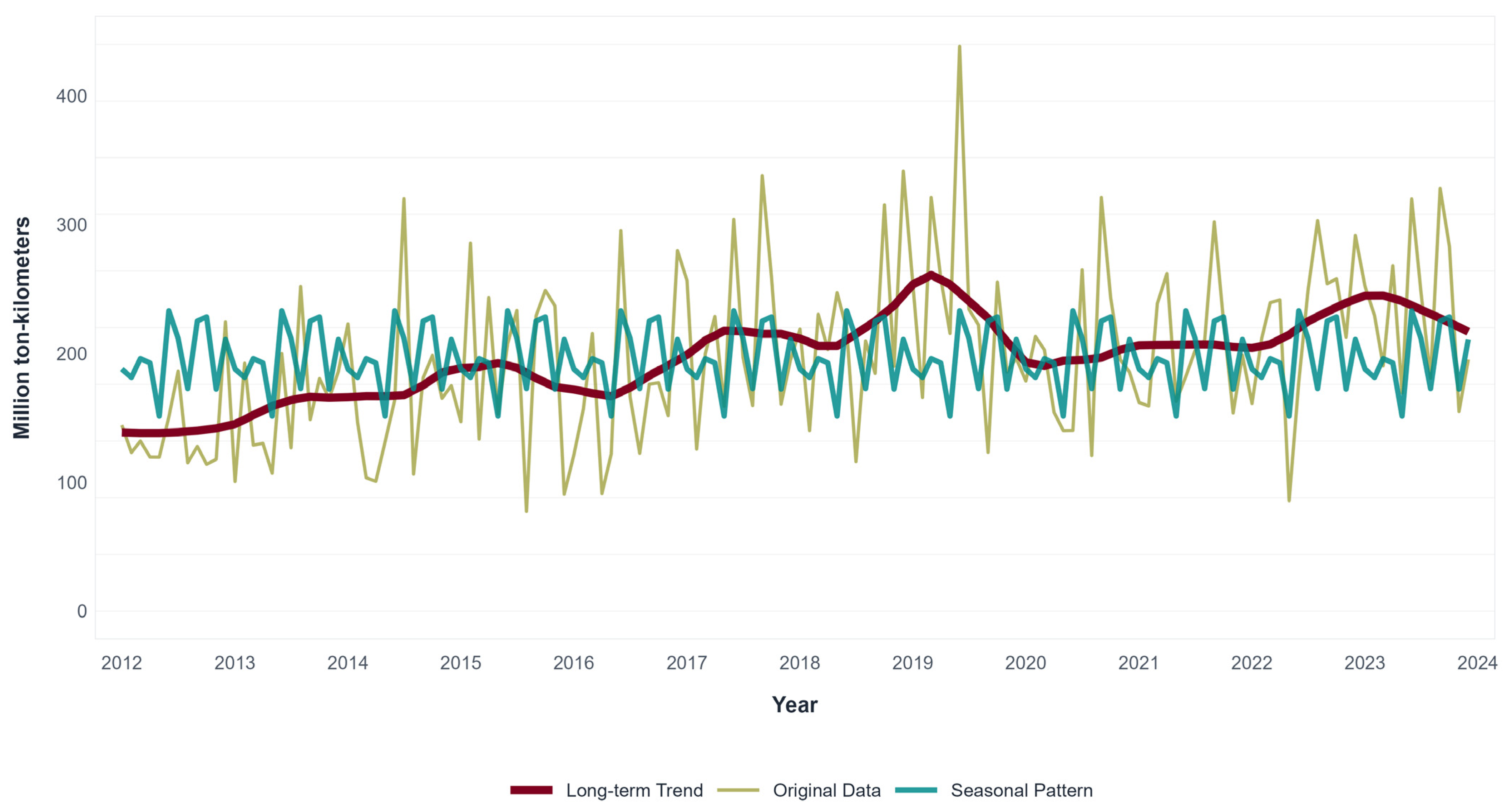 Monthly freight volumes are constructed as time series objects with 12-month frequency, establishing the foundation for decomposition analysis: