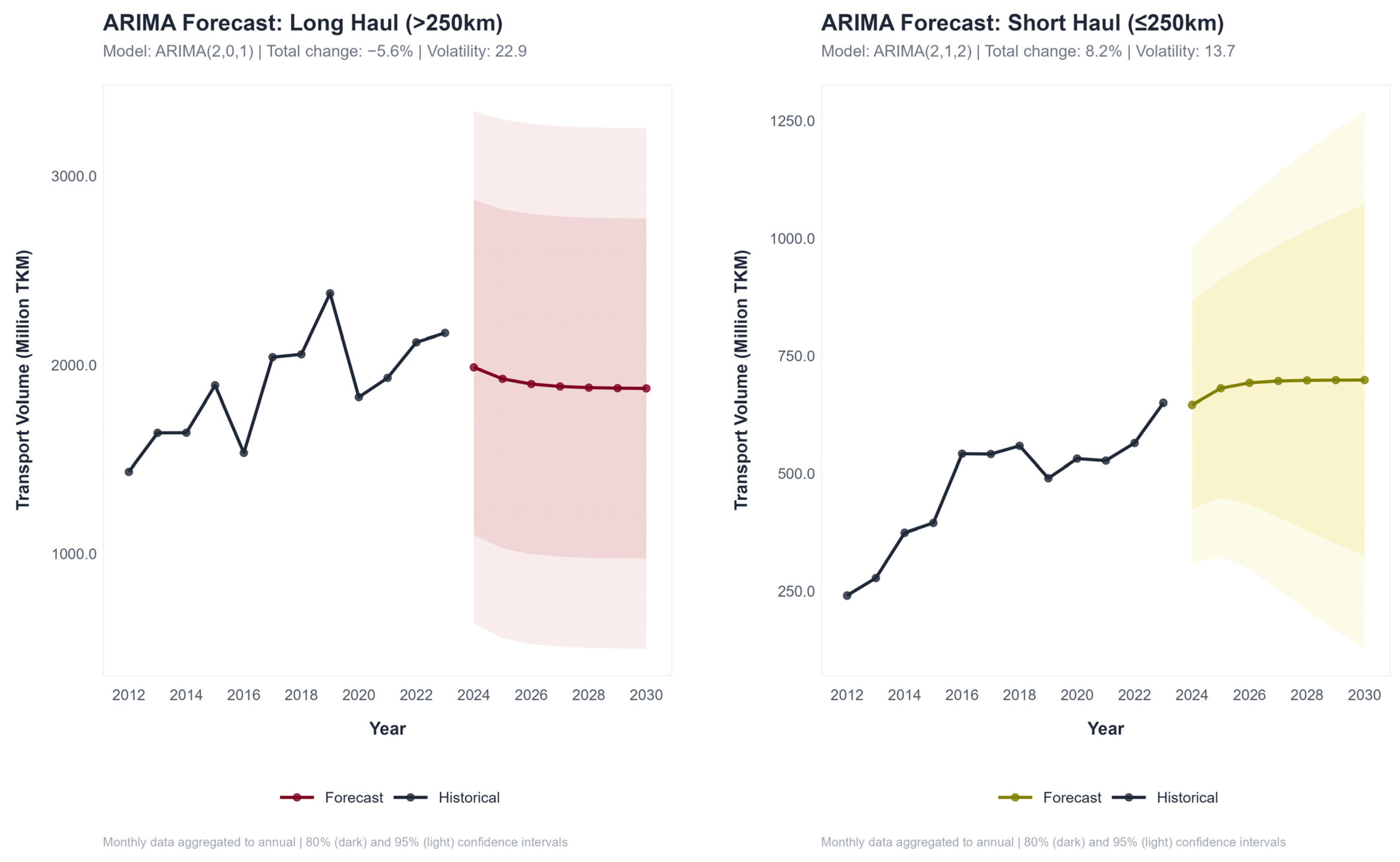 The analysis validates the hierarchical technology deployment strategy. The baseline analysis reveals a volatile freight market where external shocks dominate systematic patterns (49.7% irregular variance), with declining long-haul flows (−5.64% by 2030) contrasting growing short-haul segments (+8.18%). Heavy trucks (N3) bear 87.6% of the freight volume, which operate on predominantly long-haul journeys (362.7 km in average), validating the distance-based technology segmentation strategy. The high forecast uncertainty reinforces the need for adaptive infrastructure approaches responsive to evolving demand rather than static projections.