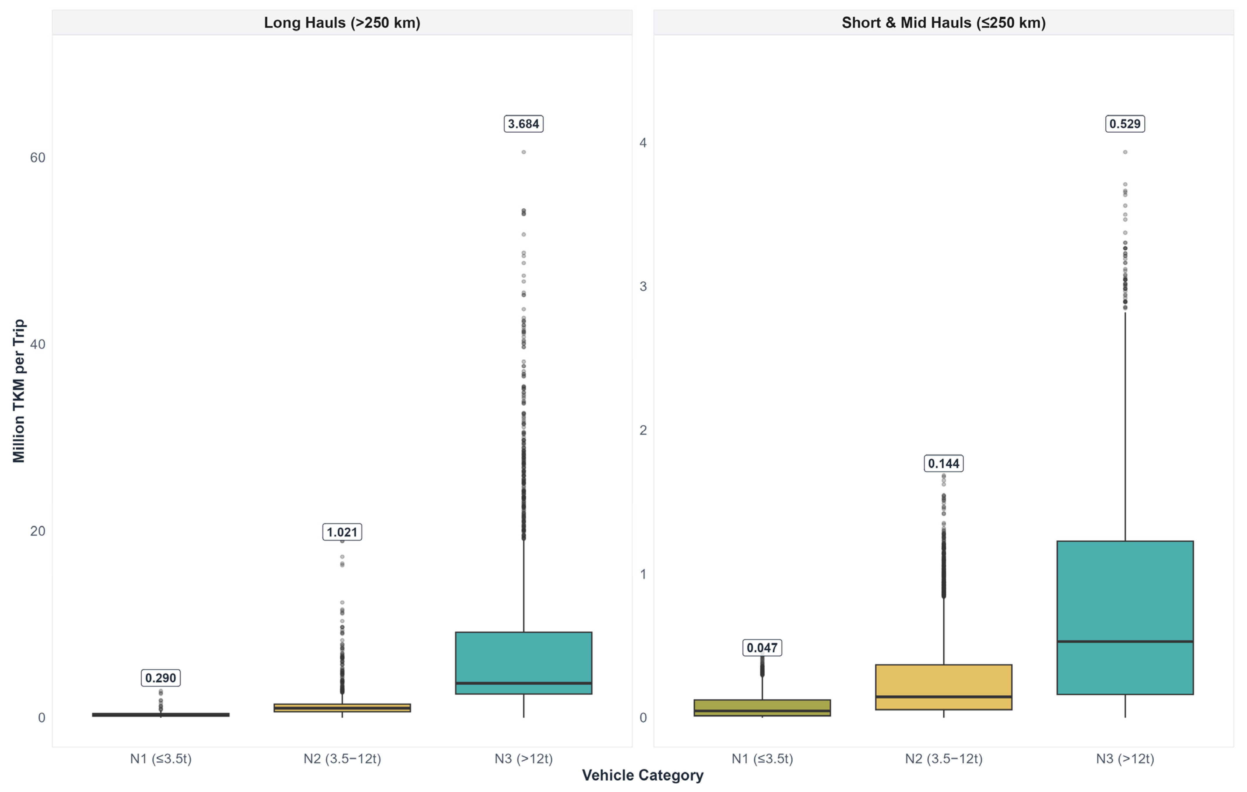 Light Commercial Vehicles (N1) predominantly operate in short and mid-haul segments (62.7% of ton-kilometers), with average trip distances of 118.4 km. This pattern strongly supports BEV deployment for the N1 category, as operational ranges align with current battery technology capabilities.