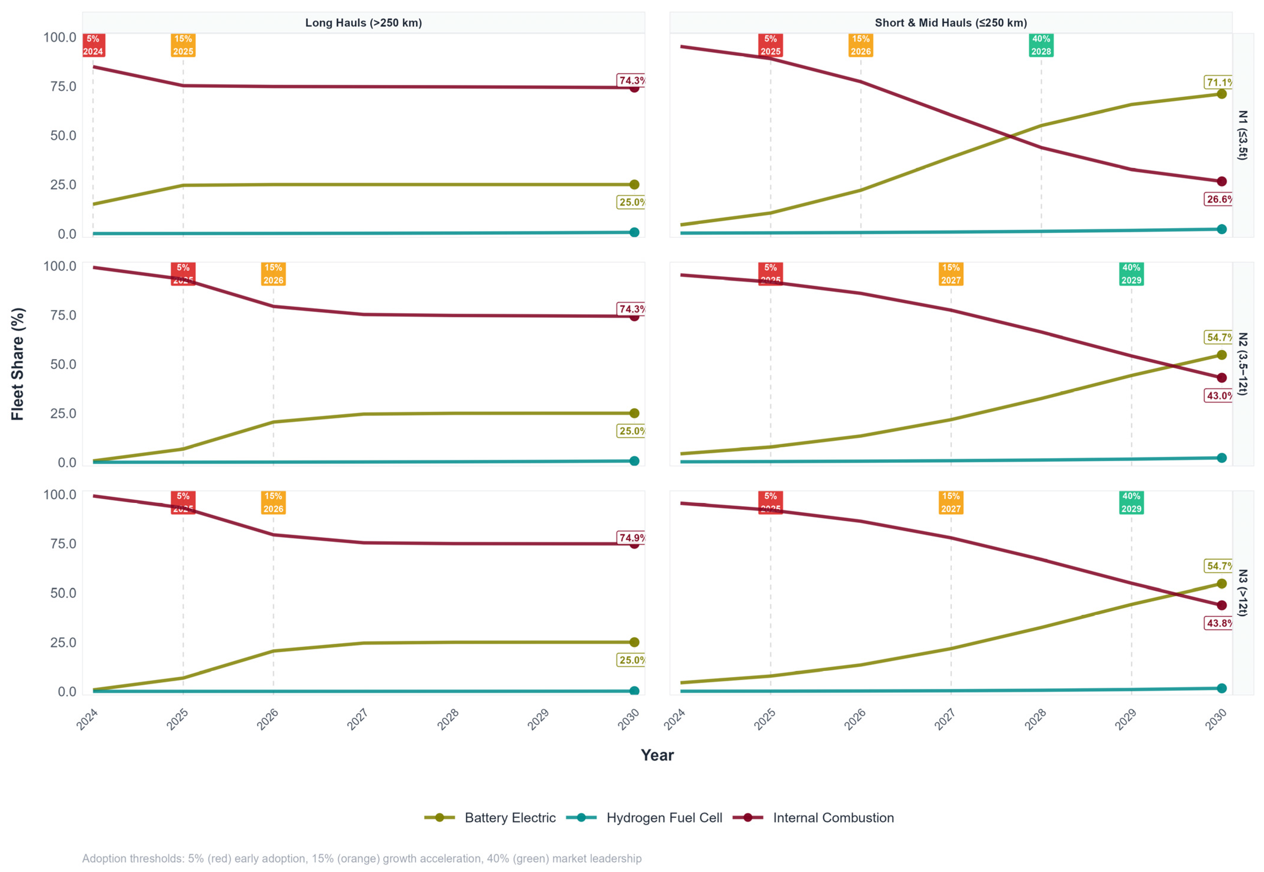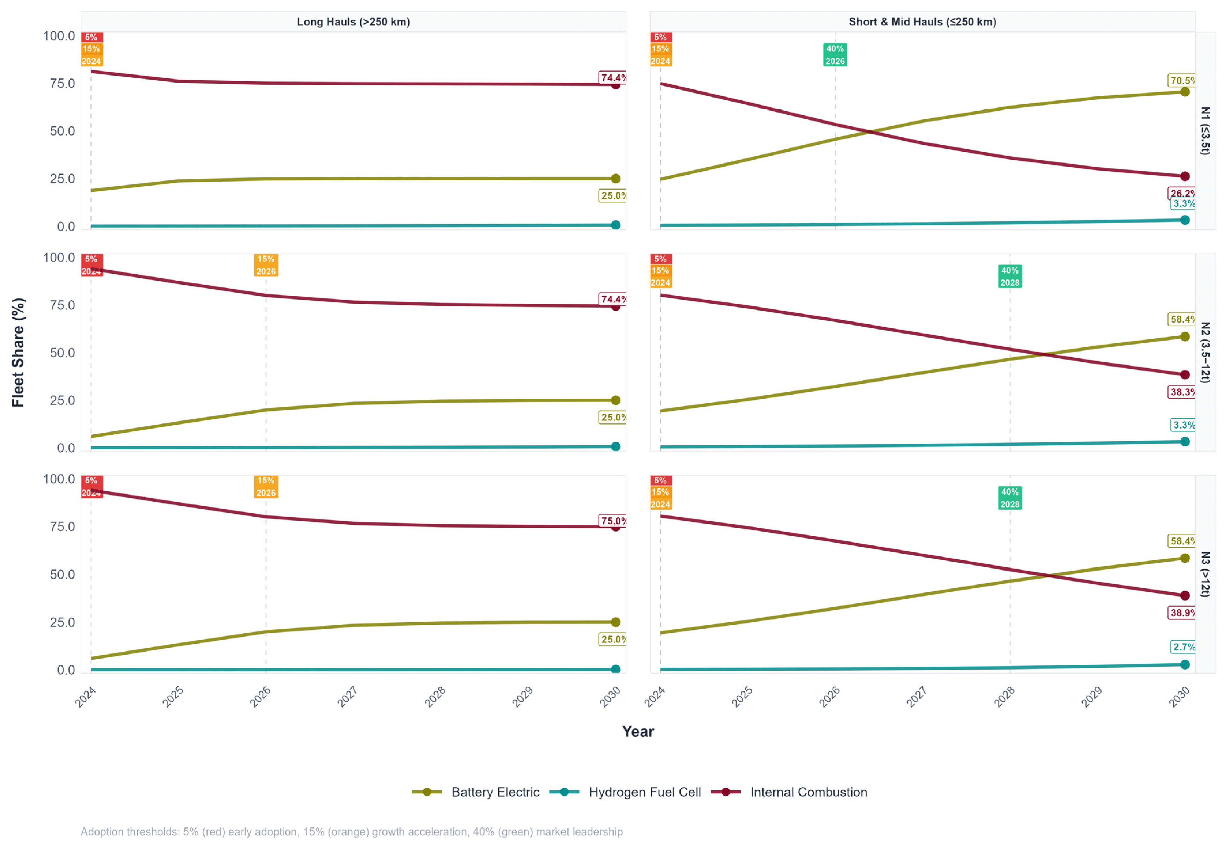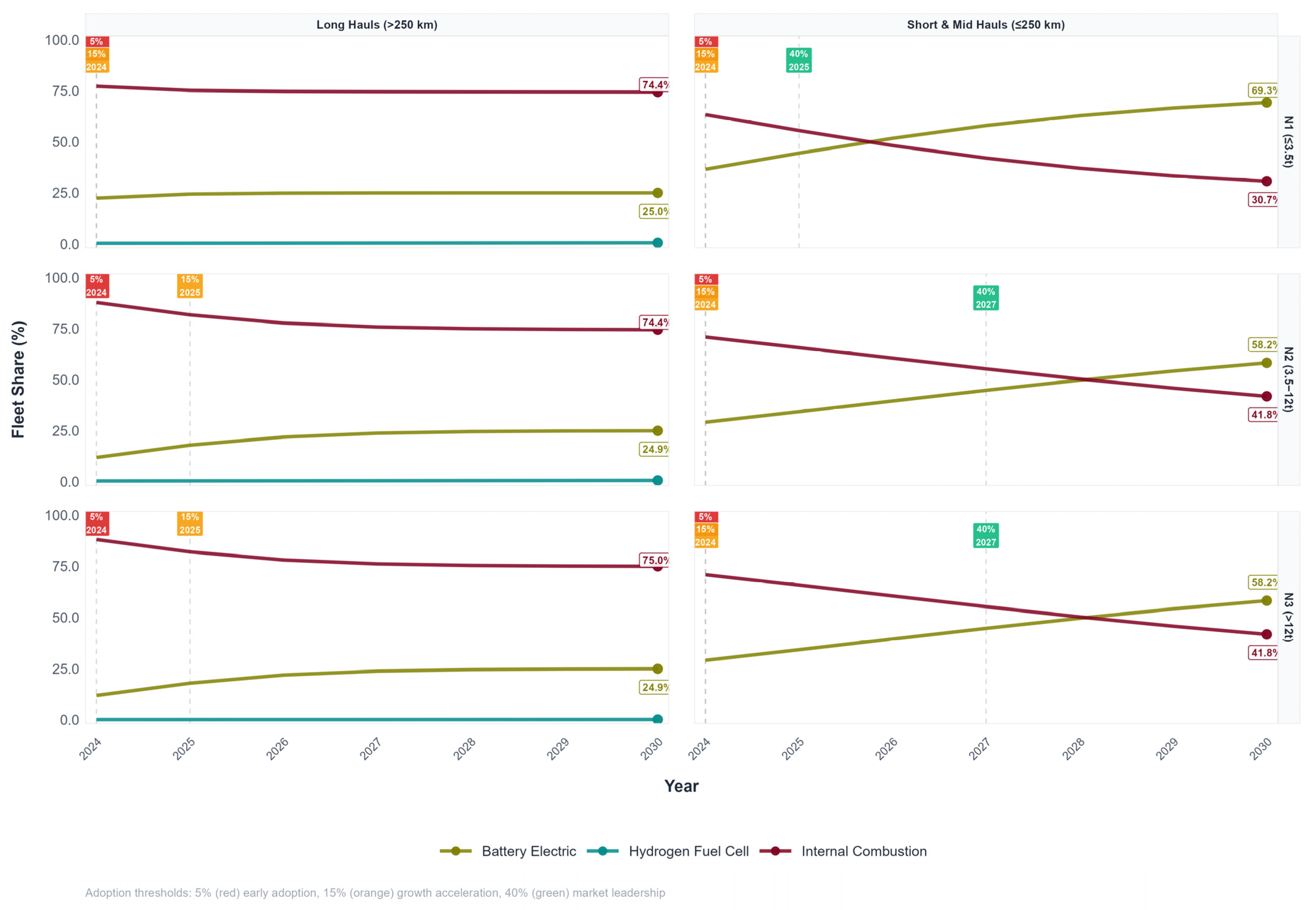 Figure 5 presents the Base scenario evolution, demonstrating natural technology divergence by distance segment. Short-haul BEVs cross the 5% early adoption threshold by 2026, reach 15% growth acceleration by 2027, and approach 40% market leadership beyond 2029. Long-haul adoption follows constrained trajectories, with ICEs maintaining dominance throughout the forecast horizon.