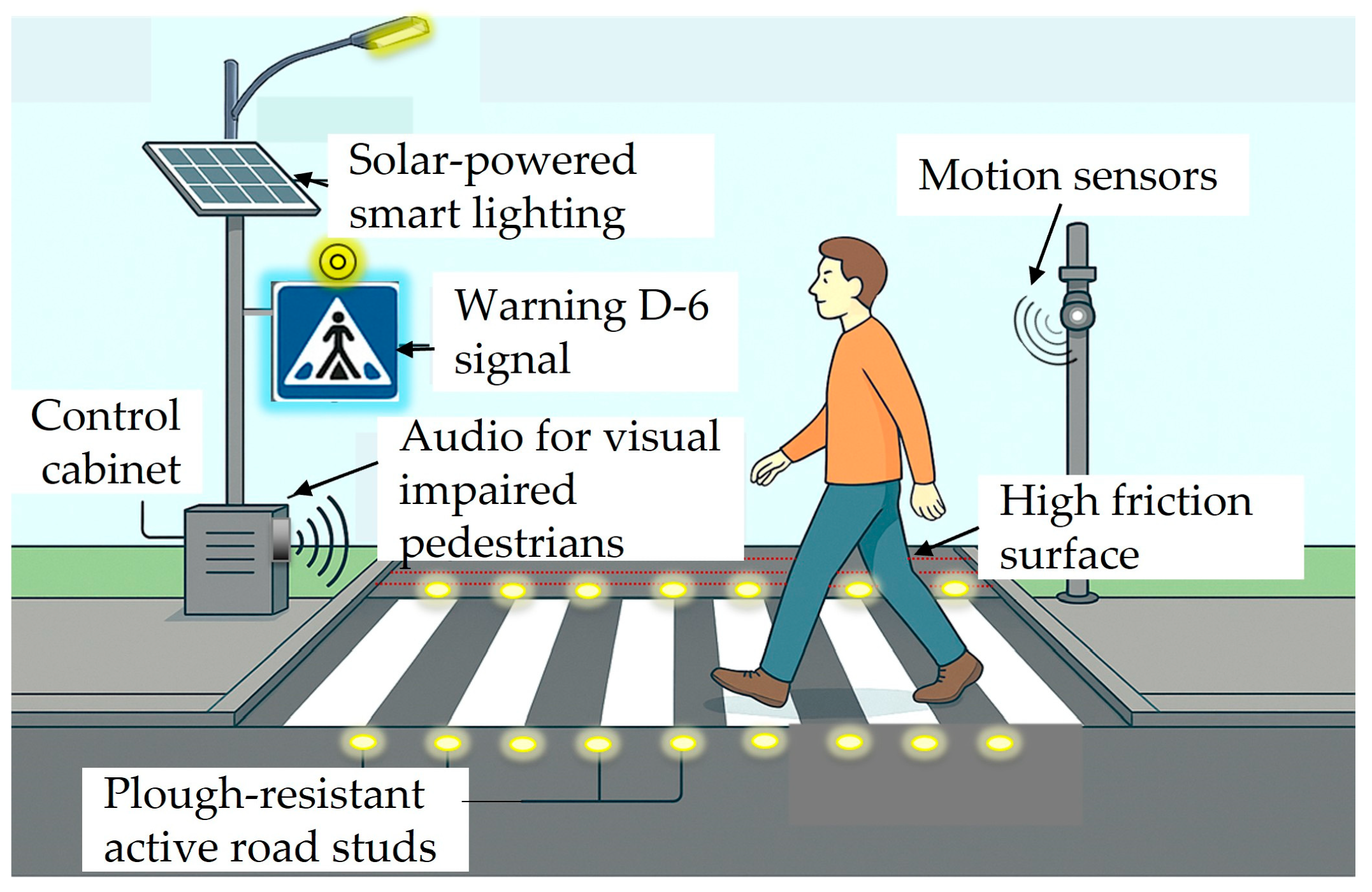 - Pawlak, A.; Pawelec, A.; Kossakowski, P.G. Evaluation of the Efficiency of Solutions Used at Active Pedestrian Crossings. Electronics 2025, 14, 409. [Google Scholar] [CrossRef]