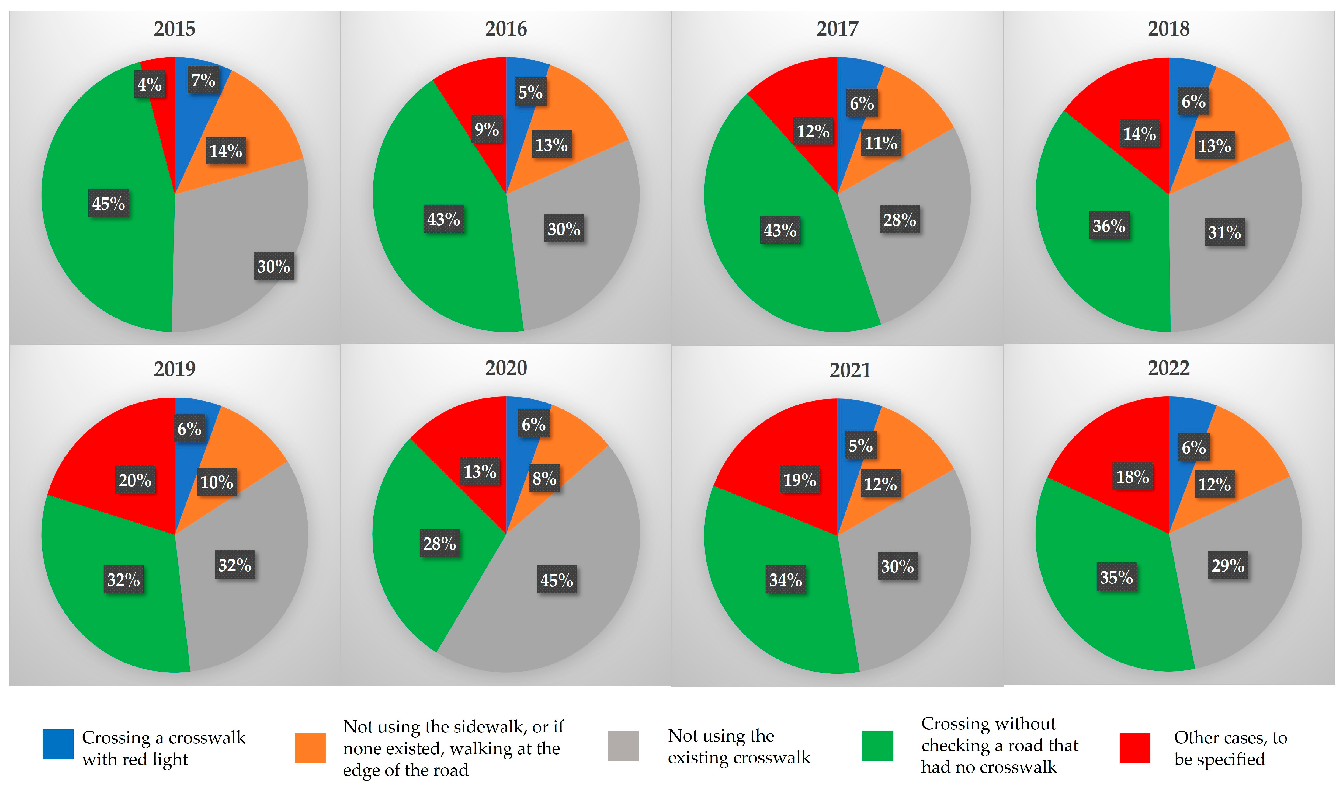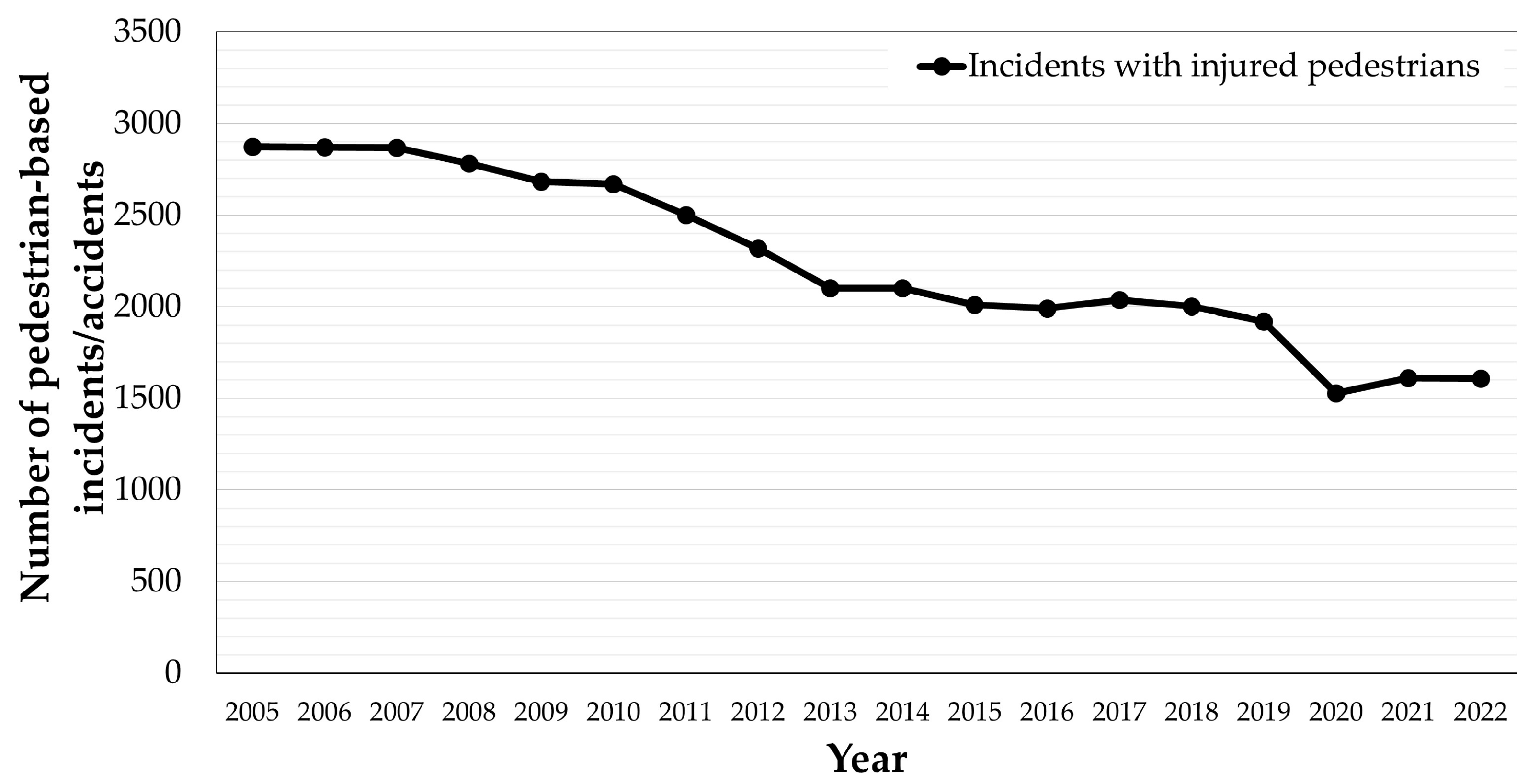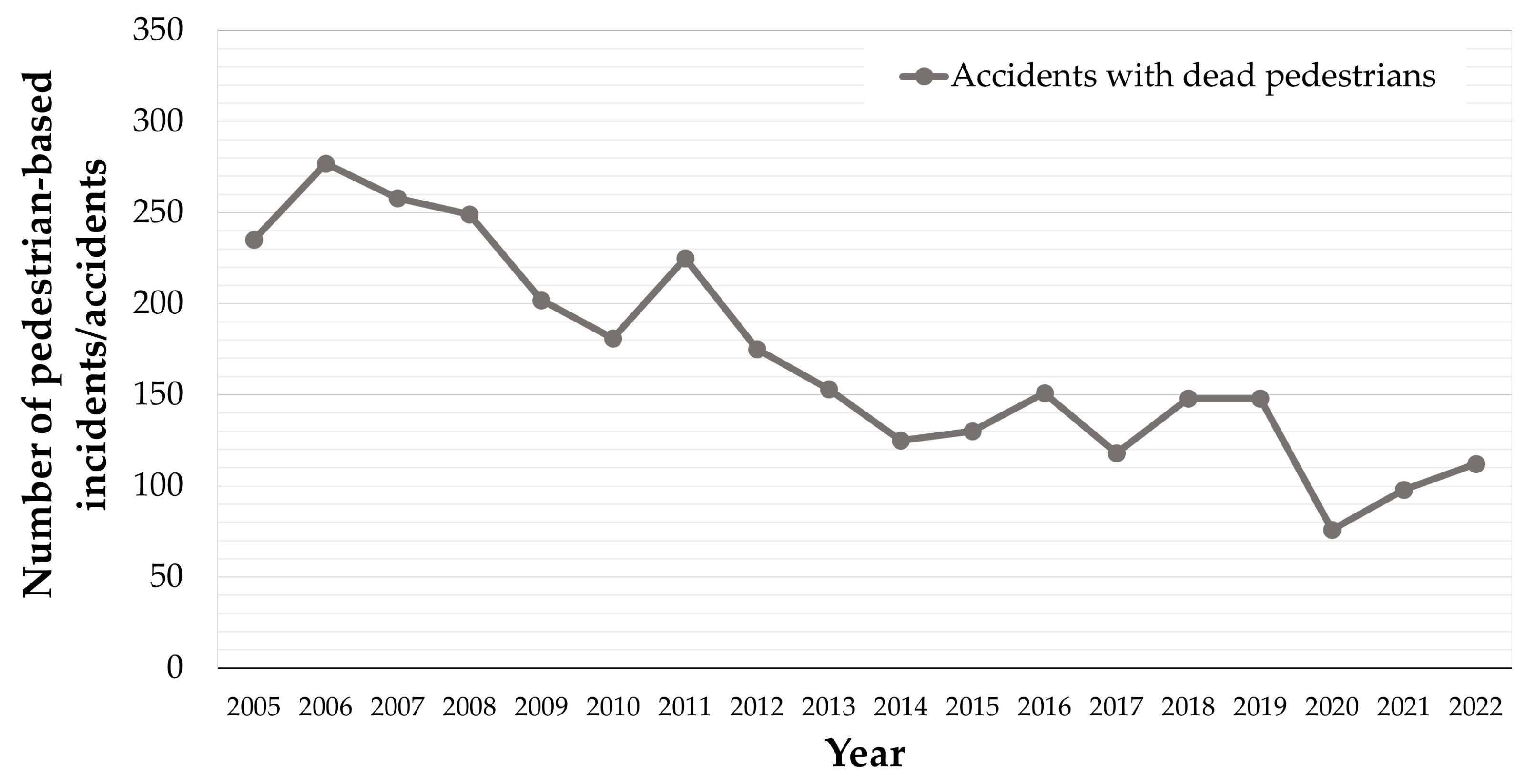 - The analysis of long-term Greek incident records involving pedestrians (analysis period: 2005–2022), showed a clear reduction in pedestrian injuries and fatalities at a rate of 44% and 52%, respectively. The percentage of incidents occurring in areas with no crosswalks decreased by nearly 10% during the last decade. This indicates that, among others, infrastructural interventions like improved crosswalk design can be translated into measurable benefits for pedestrian safety.