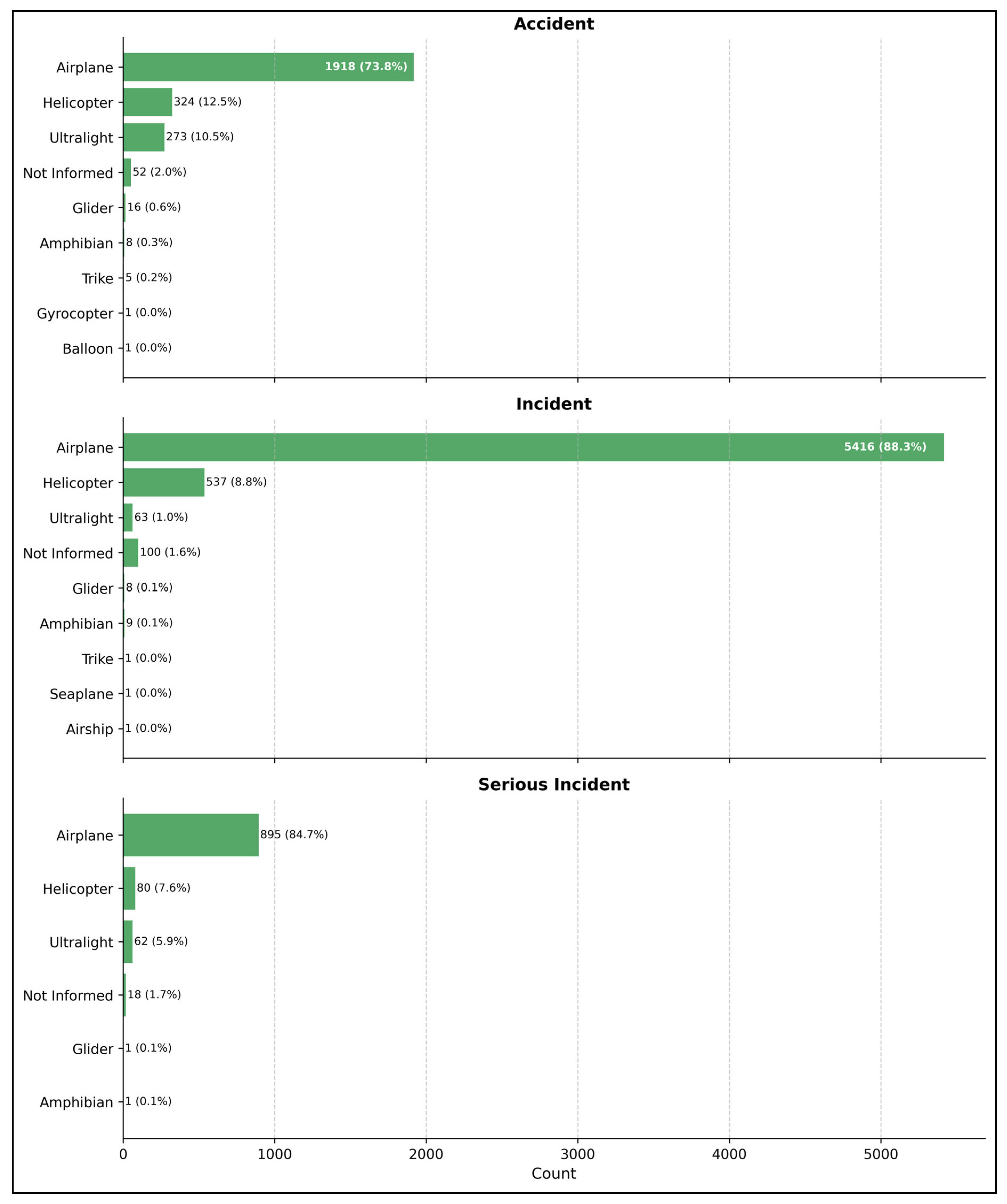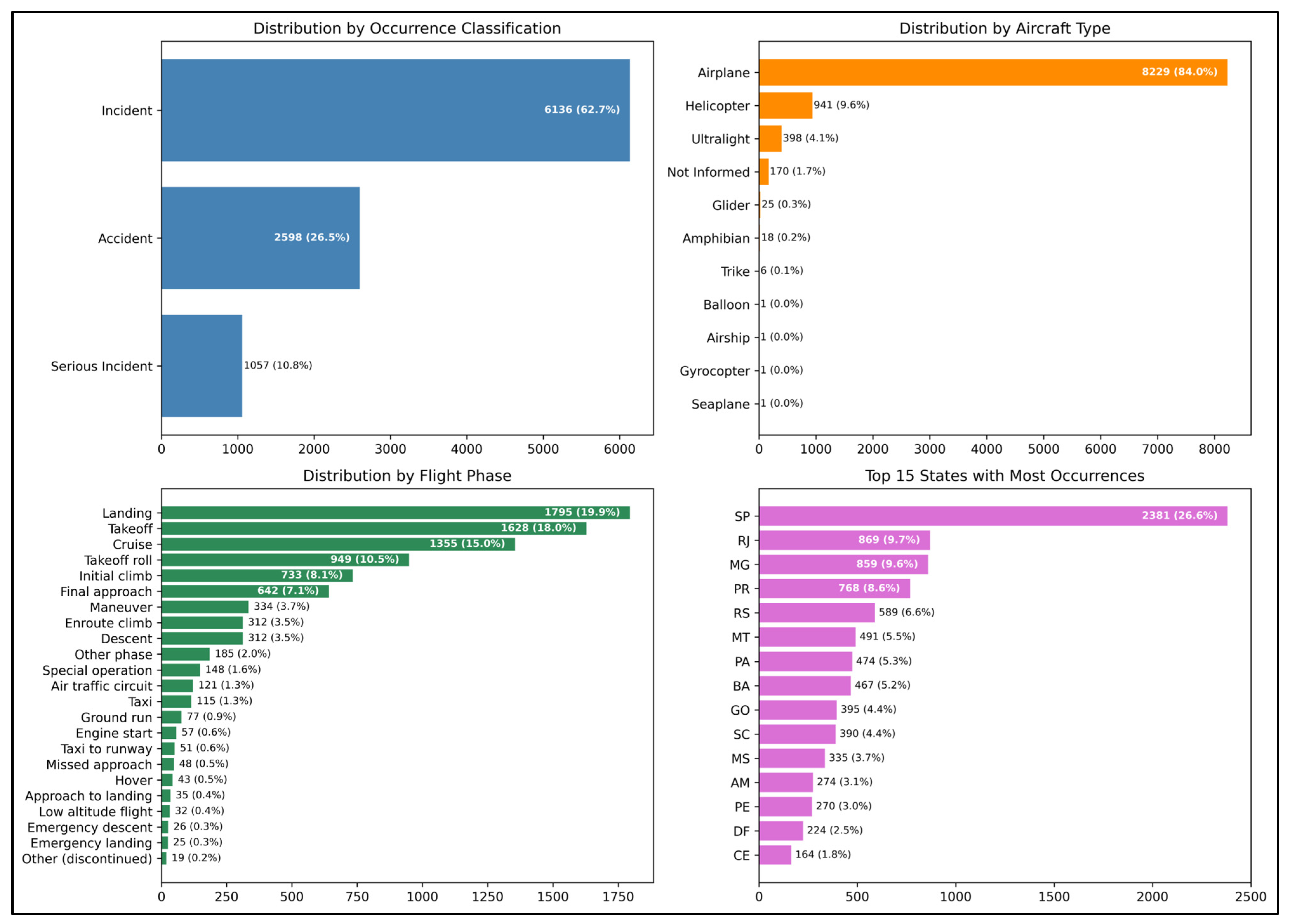 - Brazilian Aeronautical Accidents Investigation and Prevention Center (CENIPA). Aeronautical Occurrences in Brazilian Civil Aviation (2007–2023); Open Data Portal, Brazilian Government: Brasília, Brazil, 2025. Available online: https://dados.gov.br/dados/conjuntos-dados/ocorrencias-aeronauticas-da-aviacao-civil-brasileira (accessed on 1 October 2025).