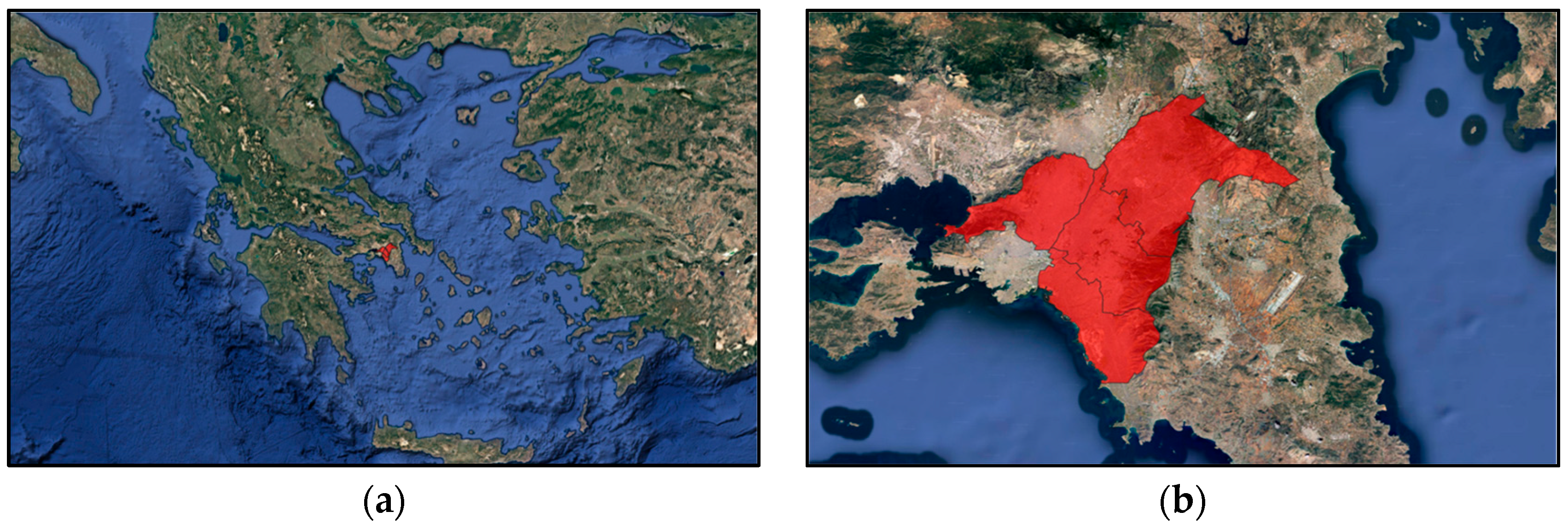 Athens is the capital and the largest urban area in Greece, making it the most politically and economically significant region in the country. For the purpose of this research, the study area is defined as the metropolitan area of Athens, which includes the central, northern, southern, and western districts of the city. The selected study area is located in the Attica region of southern Greece, as is presented in