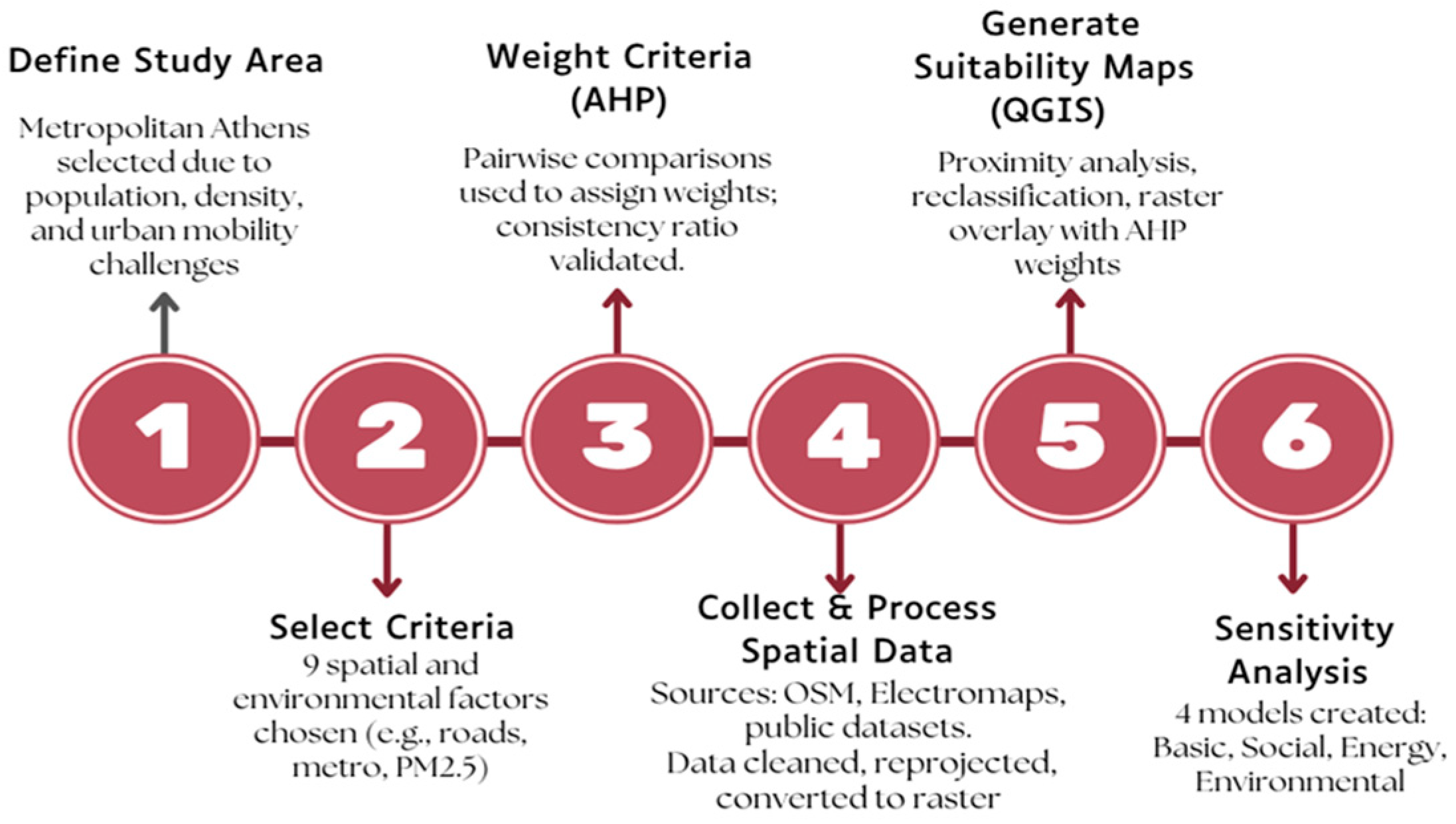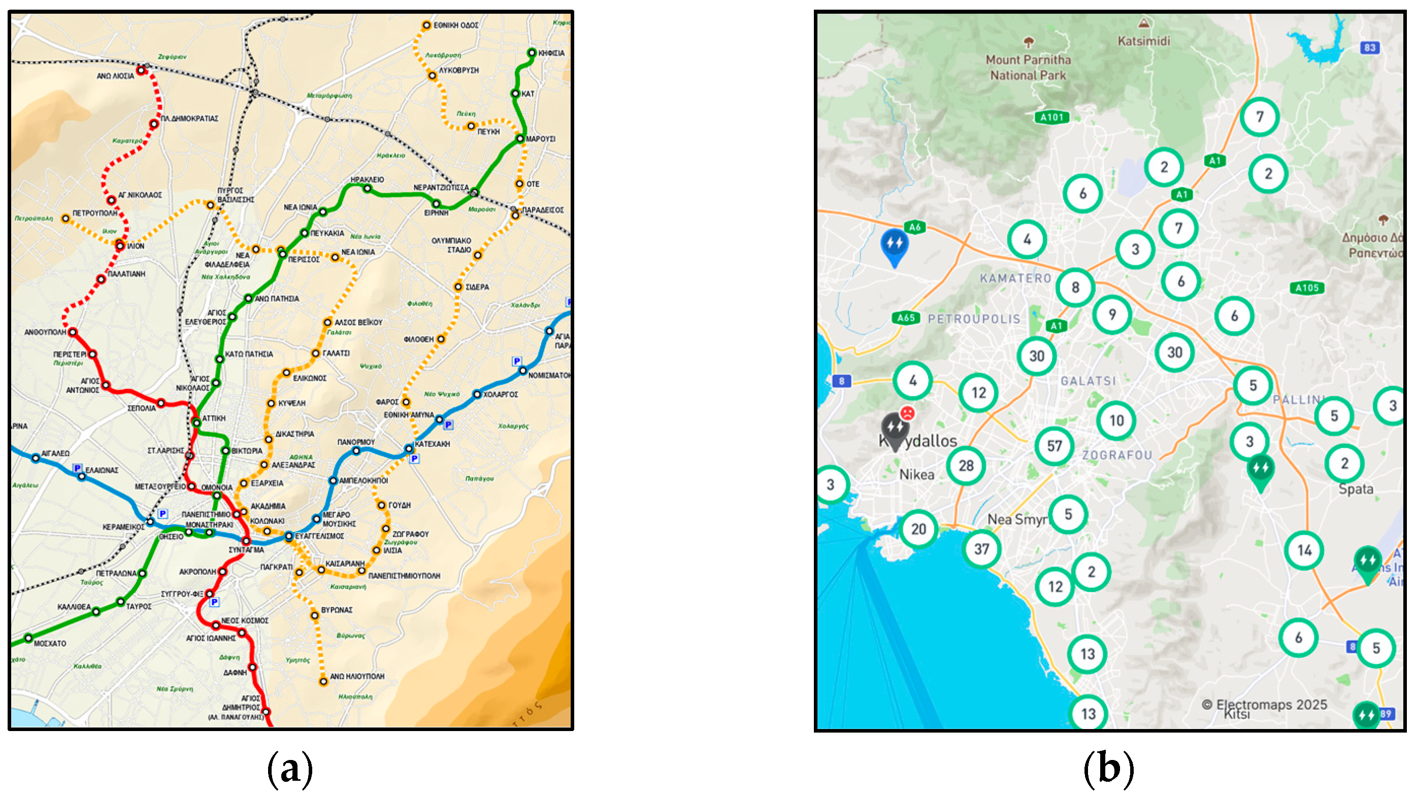 2.5 levels, underscore the need for sustainable transport planning. Thirdly, the region offers comprehensive spatial data, including layers on EVCS, metro access, roads, parking, population, and pollution—sourced from national authorities and platforms like OpenStreetMap and Electromaps. This data availability supports robust GIS-based modeling. Aligned with Greece’s National Energy and Climate Plan (NECP) and initiatives like “I Move Electrically”, Athens is a high-priority region for evaluating EV infrastructure strategies that can later inform national urban planning.
