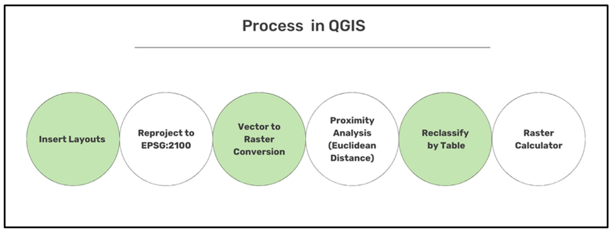 GIS play a pivotal role in spatial data analysis for this study, enabling the integration, visualization, and processing of various datasets related to EV charging station suitability. Several GIS techniques were employed to evaluate and rank each criterion for the siting of charging stations, with a particular focus on proximity analysis and spatial overlays. These techniques helped transform raw spatial data into actionable insights and assisted in identifying the most suitable locations for the charging infrastructure. The steps and tools followed are presented in