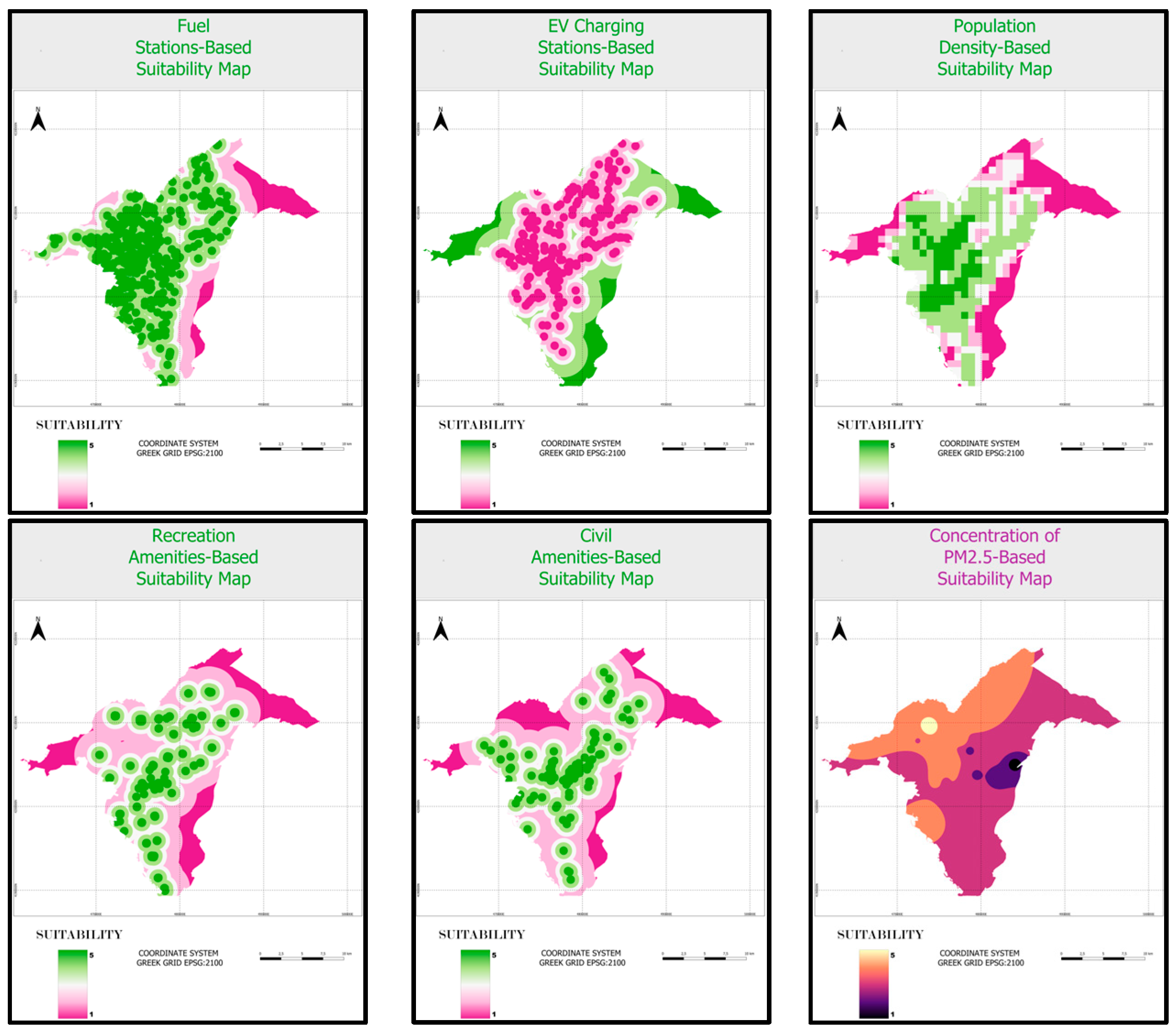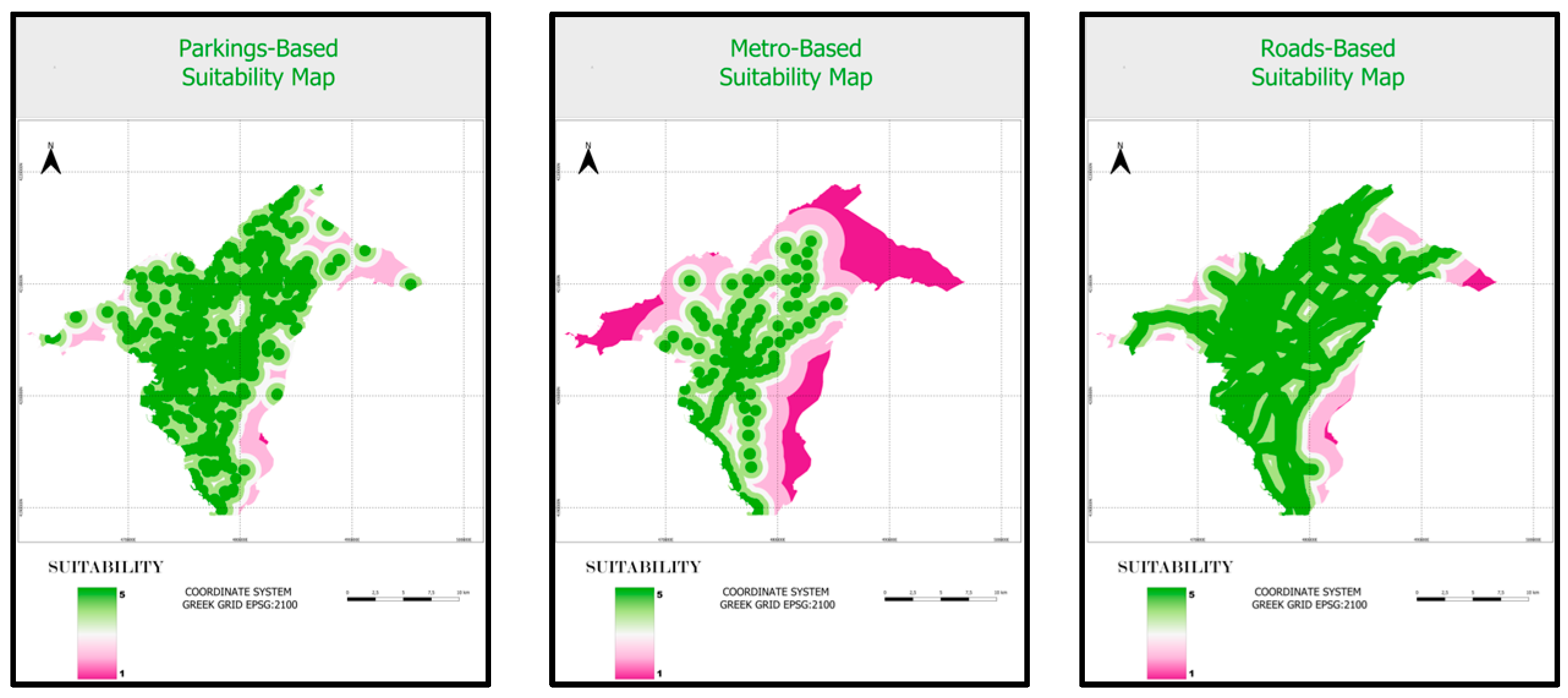 25]. It also explored alternative locations, three of which are situated in Athens. However, the study did not incorporate the use of GIS software, nor did it generate a suitability map specifically for Athens. This distinction highlights a key gap that this research aims to address by utilizing GIS technology to create a detailed suitability analysis for EV charging station placement in the city.
