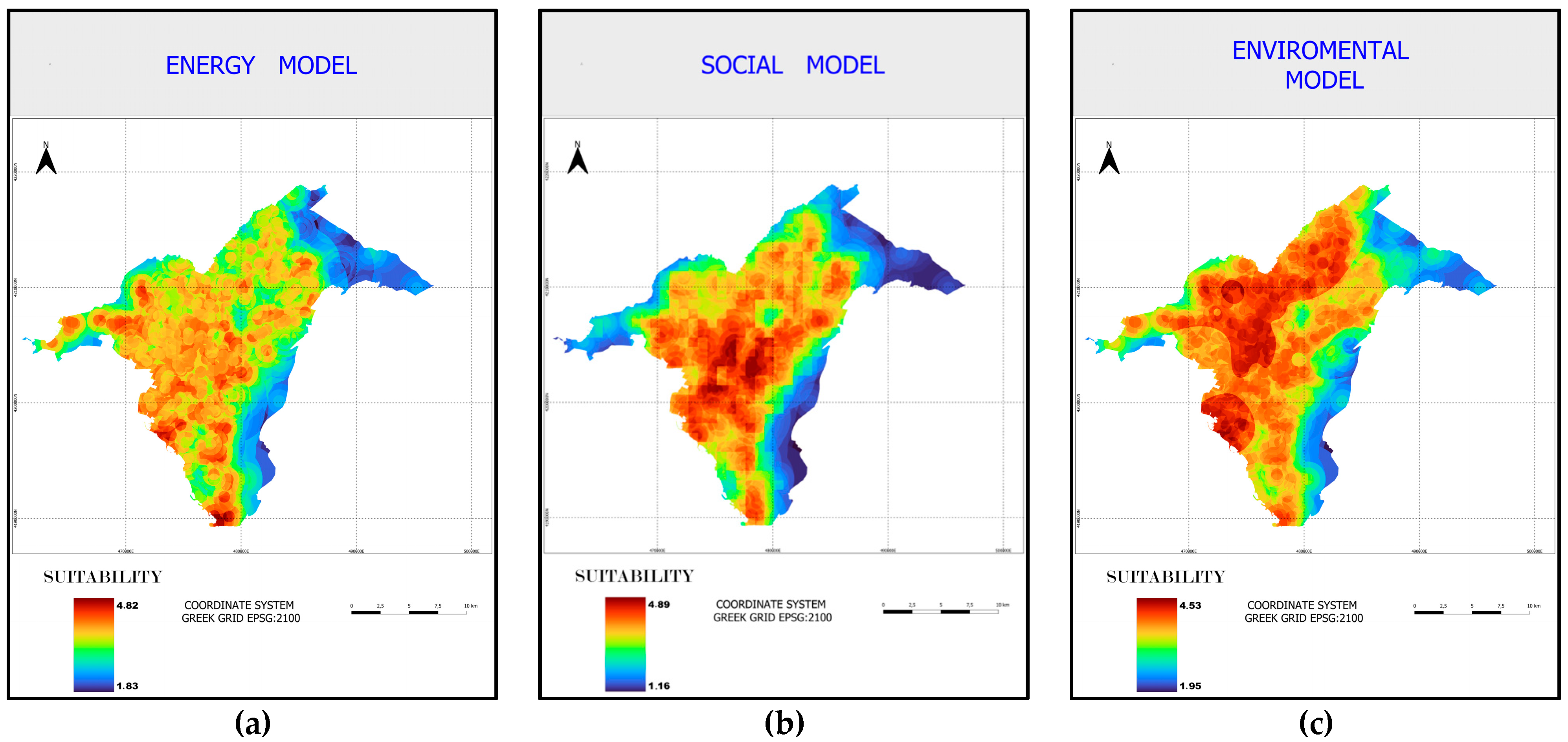 It should be noted that the higher spatial resolution (1 m × 1 m) used in the social suitability model originates from the inherent resolution of the population density raster, which was imported from an external geospatial source. Although this resolution differs from the 10 m × 10 m pixel size adopted in the other sub-models, all datasets cover the same geographic extent. Consequently, the difference affects only the level of spatial detail (i.e., the number of grid cells per area unit) and not the overall spatial weighting or cumulative suitability values. The finer resolution, therefore, does not introduce measurable bias or scale-related distortion in the final integrated suitability maps.