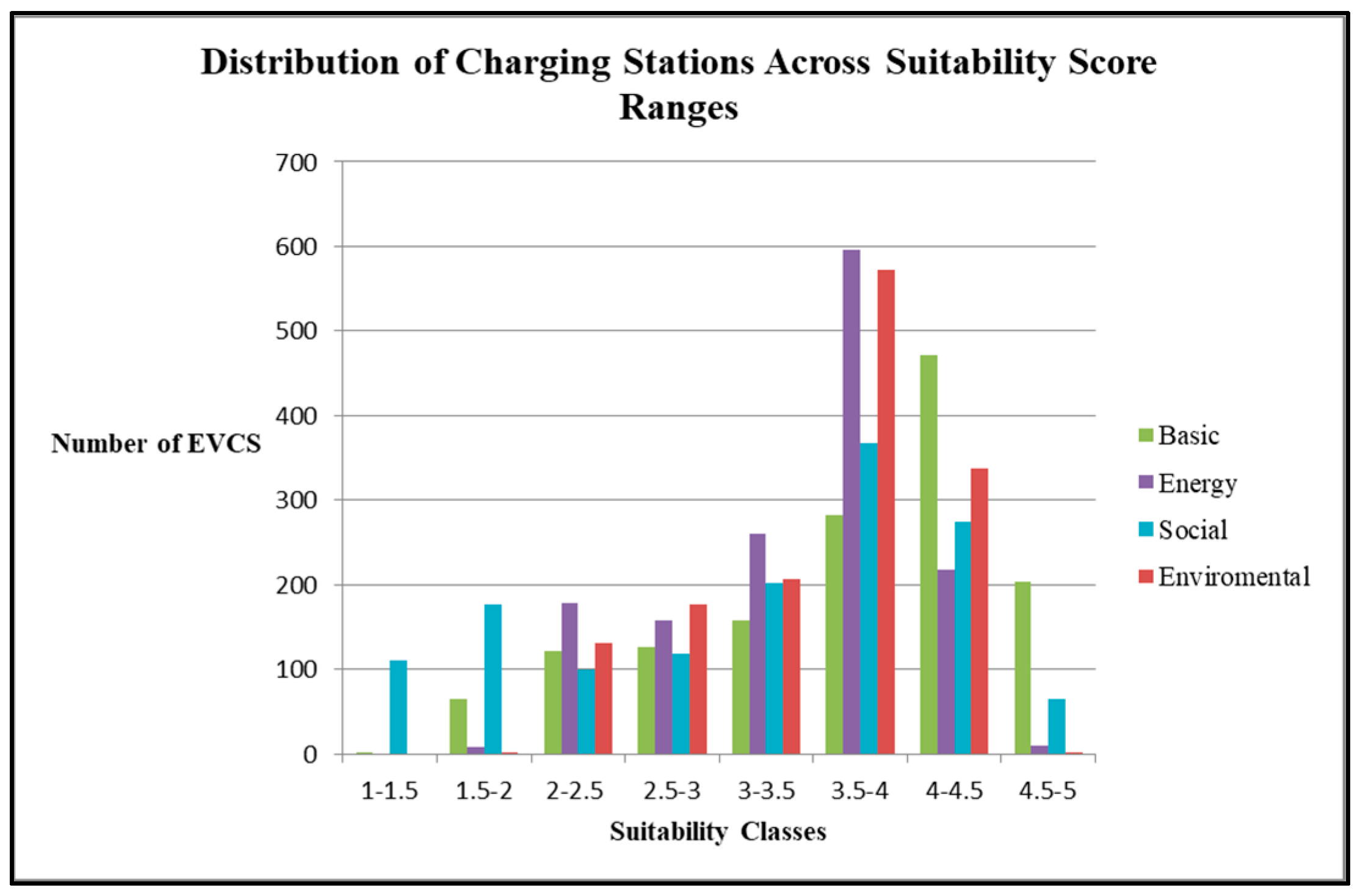 In order to quantitatively represent the results of the spatial analysis, it was deemed appropriate to classify the suitability scores into discrete categories. This classification facilitates the estimation of the exact number of charging stations that can potentially be installed within each suitability class. Through this approach, we move from abstract suitability scores to tangible, spatially explicit infrastructure planning.