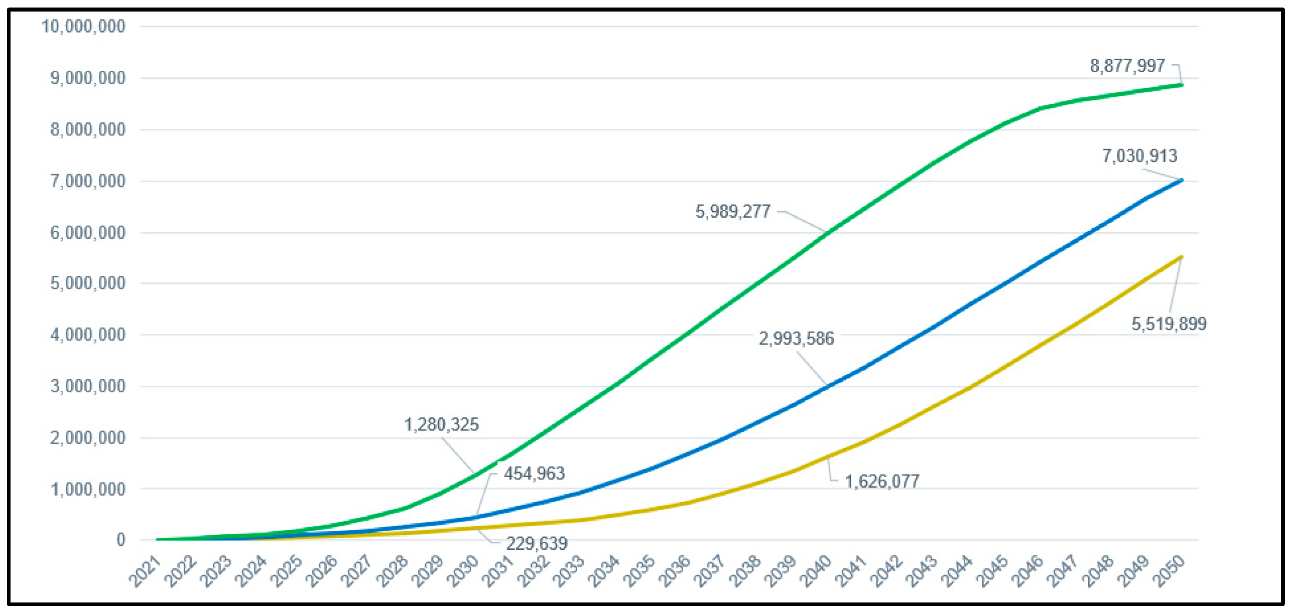 Figure 10. The y-axis represents the projected number of EVs, while the x-axis corresponds to the years from 2021 to 2050. Each trajectory is color-coded: the yellow line represents the Reference Scenario, the blue line denotes the NECP (policy) Scenario, and the green line illustrates the Ambitious Plan 2025 Scenario.