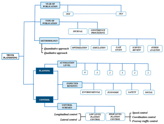 - Phase 1: Literature search and selection. A comprehensive search of relevant publications was carried out across the databases Web of Science, IEEE Xplore, ScienceDirect, SAE Journals, and Google Scholar. The following keywords were used in different combinations: “truck platooning” together with “planning, control, benefits, economic benefit, safety, social impact, environmental”. Overall, the combined search of the aforementioned databases using the selected keywords initially returned approximately 250 papers. The filtering process was conducted iteratively, eliminating duplicates and non-peer-reviewed sources, papers not written in English as well as articles that did not directly address truck platooning applications. Studies focusing on light vehicle or car platooning were excluded. To ensure an updated overview of the state of the art, only studies published between 2010 and 2024 were considered. A total of 97 papers met the inclusion criteria, namely: (i) relevance to truck platooning planning and control; (ii) clear discussion of benefits related to the platoon.