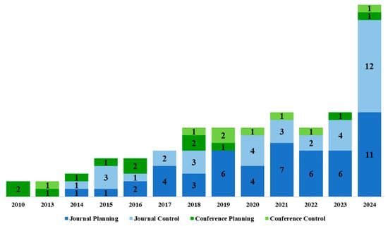 - Phase 2: Preliminary classification. The selected papers were first classified by year of publication, source type (journal or conference proceedings), research methodology, and main thematic focus (planning or control).