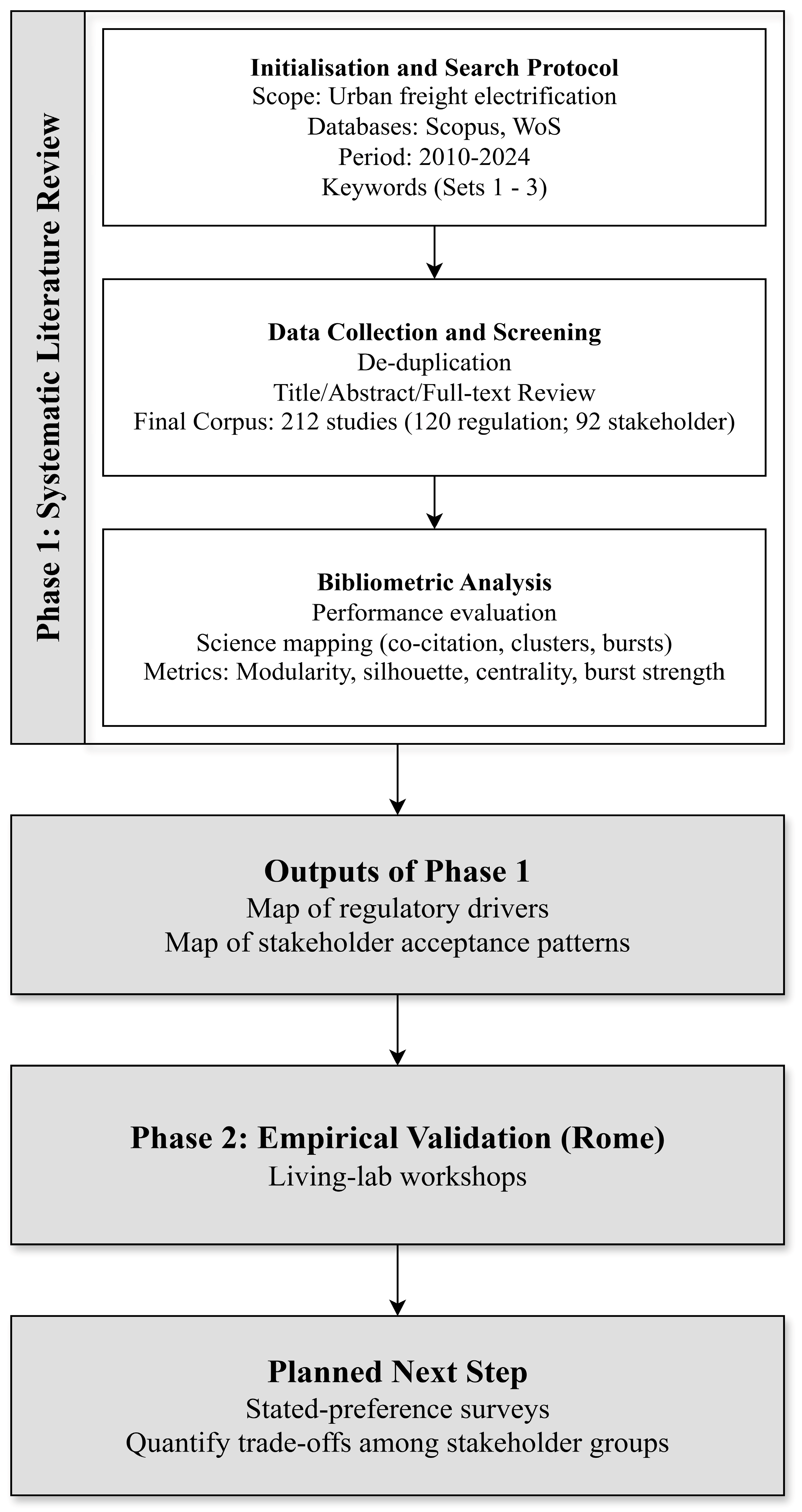 - Initialisation and Search Protocol: During the initialisation stage, the scope of the review was defined as urban freight electrification, and the search protocol was established. Peer-reviewed journal articles, conference papers, and book chapters published in English between 2010 and 2024 were retrieved from the Scopus and Web of Science databases. The search strategy combined three sets of keyword strings. The first set delineated the domain of application (urban freight and logistics), while the second set targeted eco-friendly vehicles. The third set was divided into two dimensions: one addressing regulation and the other focusing on stakeholders’ acceptance.