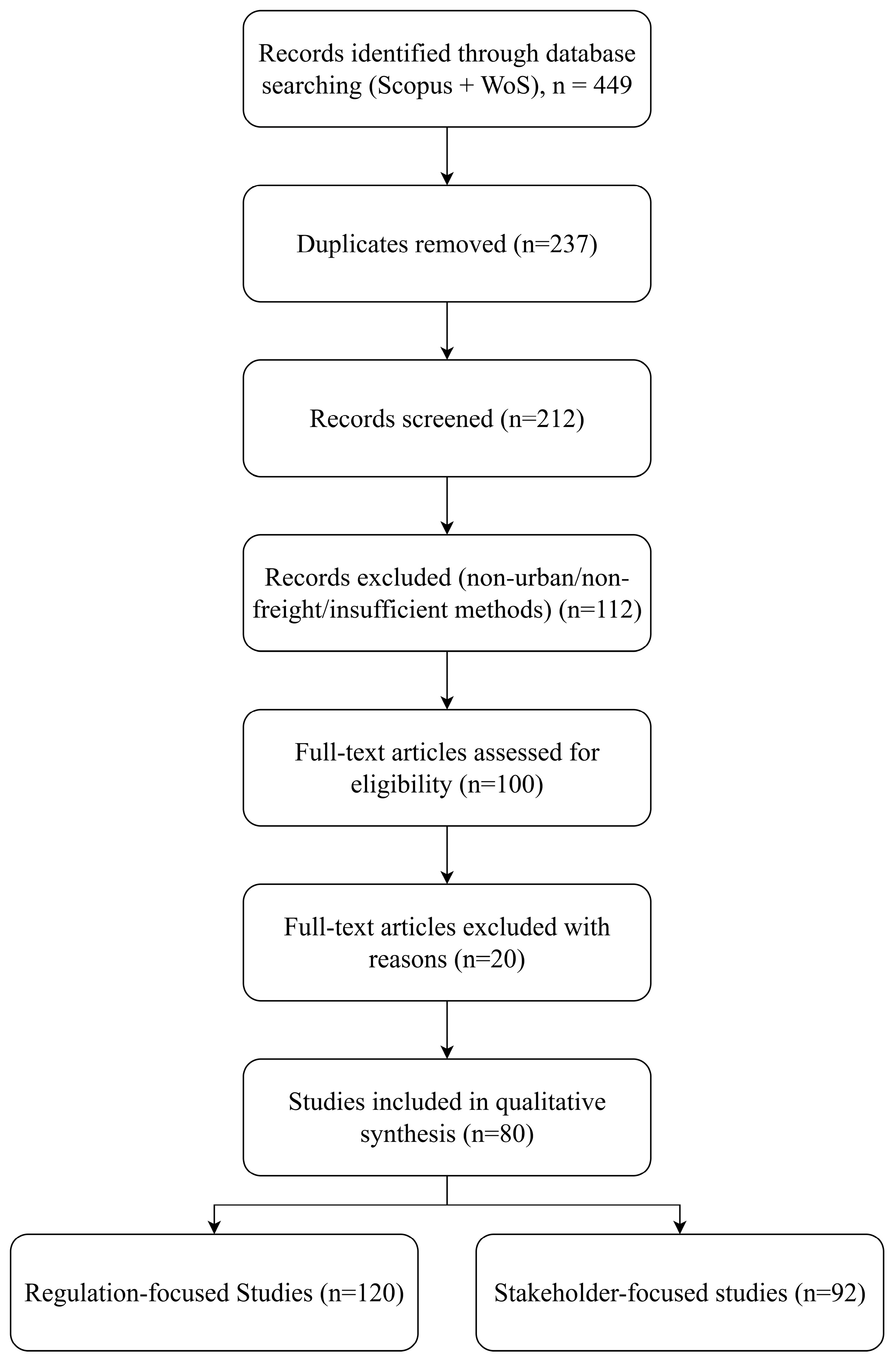 | “regulation” OR “regulatory” OR “ordinance” OR “decree” OR “ban” OR “incentive*” OR “subsid*” OR “tax*” OR “zero emissions” OR “LEZ” OR “ZEZ” OR “enforcement” OR “sanction*” OR “complian*” OR “measures” OR “polic*” | 163 | 146 | 26 | 283 | 163 | 120 |