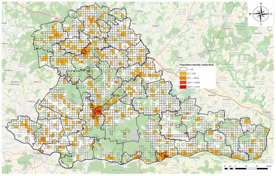 The population density of Tauragė region in grids (compiled by the authors). The background source used to create the figure is the World Topo Map from ESRI.