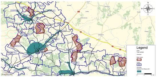 In order to evaluate the effects of DRT within the region, a digital model of PT was devised for the designated area. This model was constructed utilizing the PTV Vissum 2024 software, whereby the region’s zones were delineated based on an array of available social, economic, statistical, and demographic datasets. The region was partitioned into zones corresponding to the smallest level of administrative division, specifically elderships, as exemplified by Lithuania. The partitioning of zones according to elderships mitigates potential inaccuracies and errors during data processing within the model. The centrality of zones was determined by the following criteria: the most urbanized area, the largest population size, or the greatest population density. Subsequently, connections were established from the zone’s center to the bus route stops: