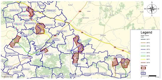 Based on the criteria of territorial and route dimensions and their boundaries, which are based on the previously defined assumptions, DRT areas were designated where regular PT is proposed to be abolished and DRT introduced. This PT is user-oriented and designed to meet the needs of different users. In the Tauragė region, 8 DRT areas have been identified (Table S4), shown in Figure 5.
