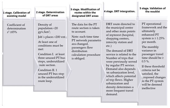 In regions characterized by low population density, the incorporation of adaptable PT systems, such as DRT, into the existing PT infrastructure adheres to the methodology devised by the authors, as delineated below.