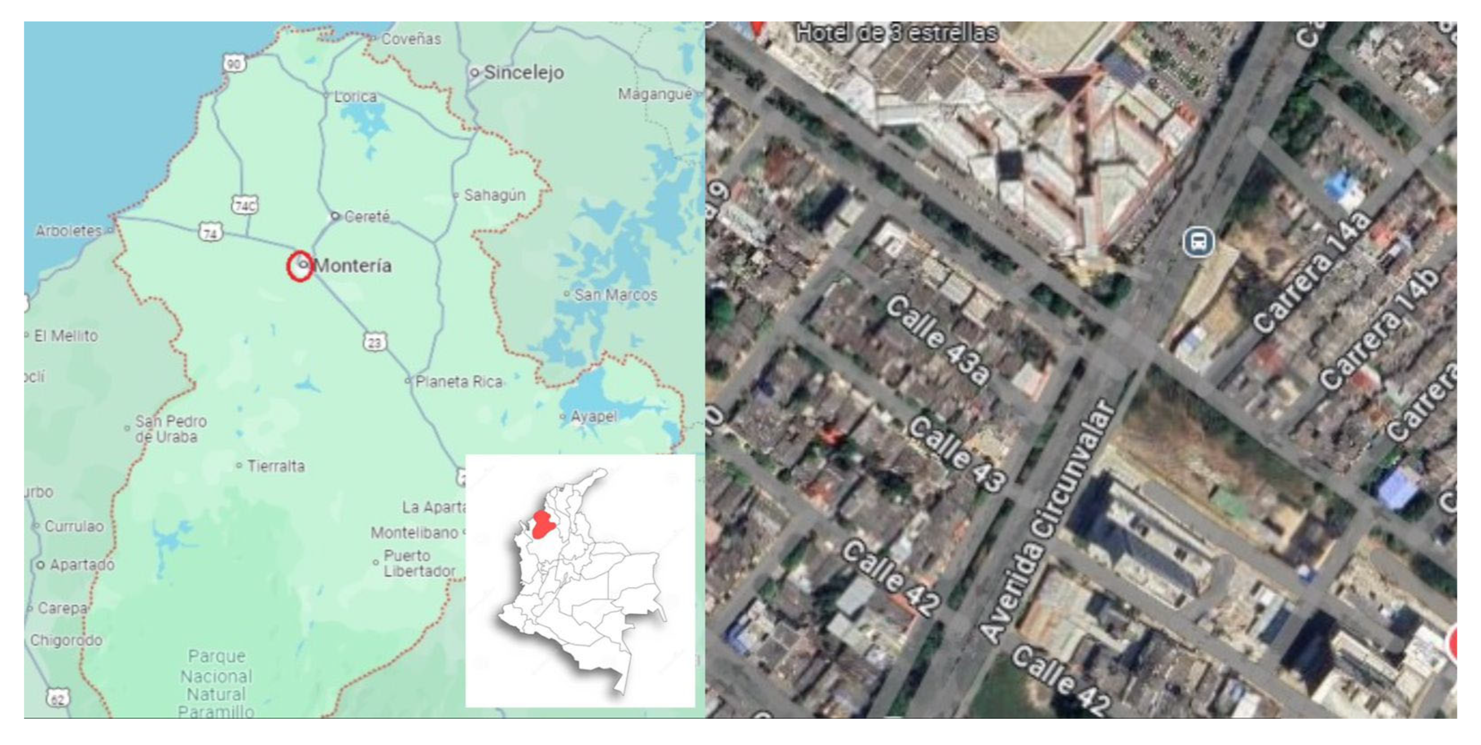 The study area corresponds to the intersection of Calle 44 and Avenida Circunvalar in Montería (Colombia), which was selected due to its high traffic density during peak hours and the availability of fixed security cameras that allow continuous recording of traffic flow. This intersection is a critical point within the urban road network, as it connects residential and commercial areas of the city. Its location is illustrated in