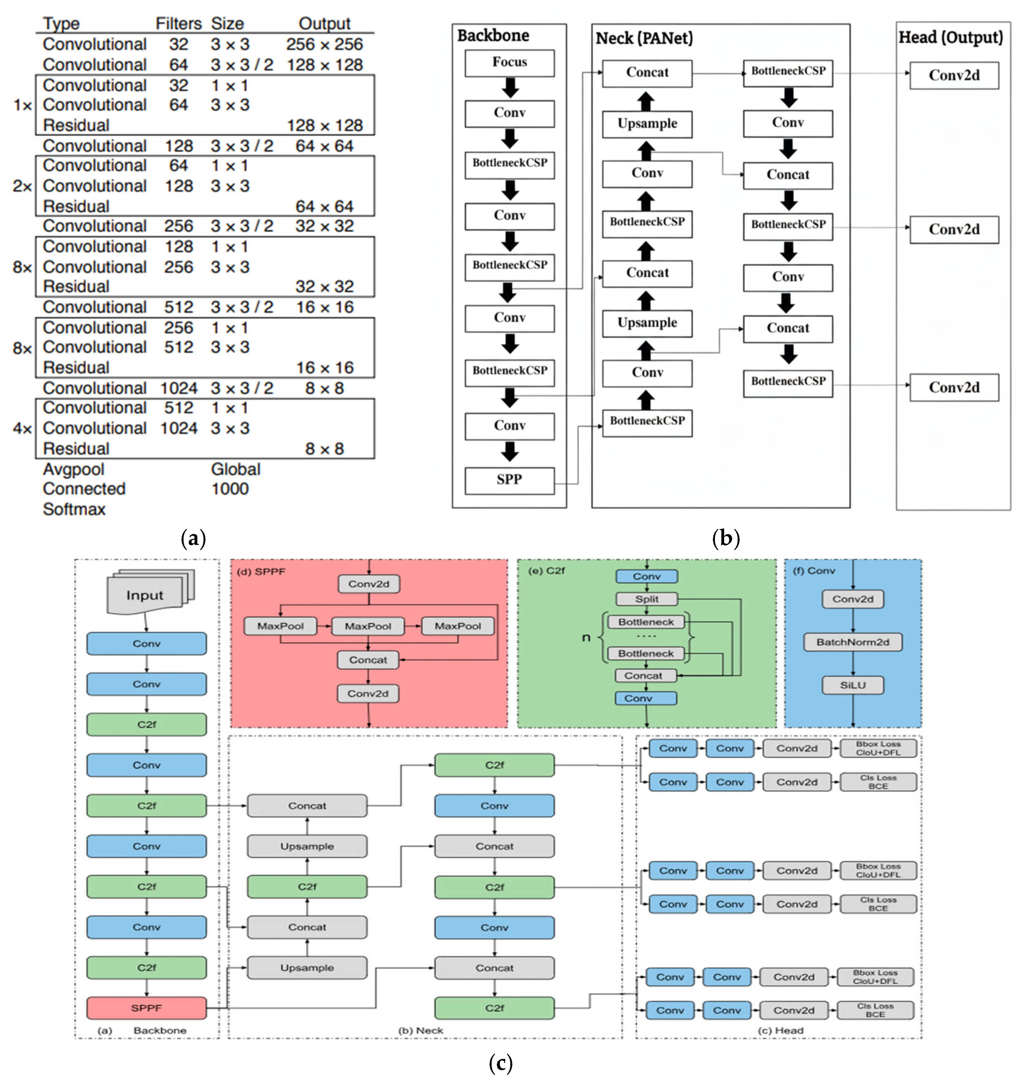 36] efficiently. Noteworthy modules include C2f (CSP Concatenation and Feature Fusion), inspired by DenseNet, which improves feature fusion and reduces computational complexity [
