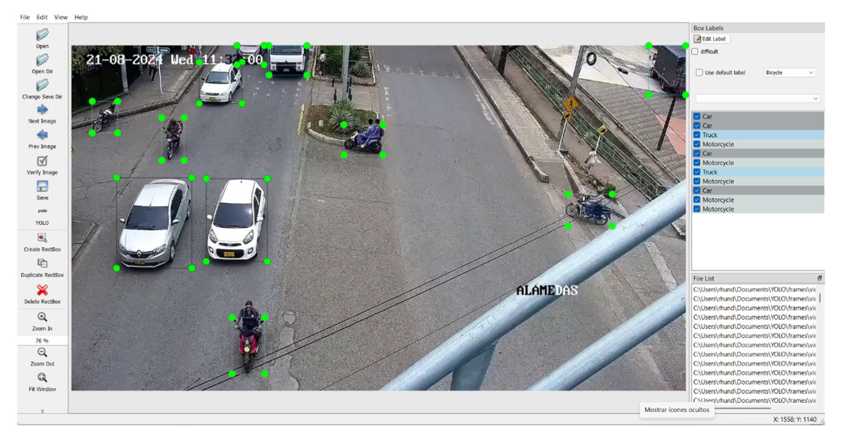 The labeling was performed using the LabelImg tool (1.8.6+), considering five representative vehicle categories in urban mobility: cars, buses, trucks, motorcycles, and bicycles. This process was carried out by a single observer, following consistent annotation criteria in terms of: precise delimitation of detection boxes, assignment of correct labels to each category, and quality control through subsequent cross-checking to rule out obvious errors.