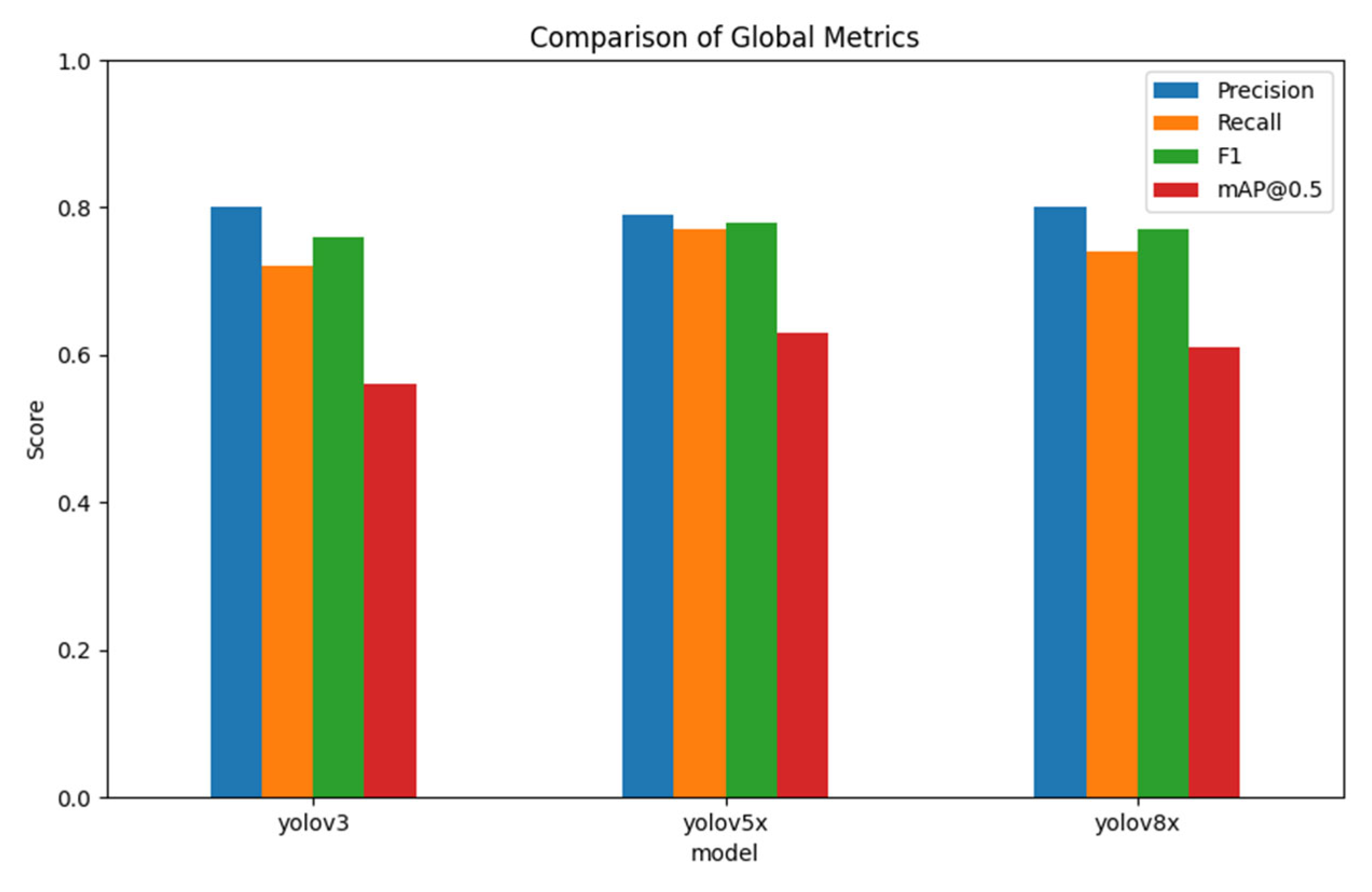 Figure 5 reinforces these findings through a comparative graphical representation, which provides a clearer visualization of the differences in performance between architectures. YOLOv5 outperforms its counterparts in terms of mAP@0.5, while YOLOv3 shows the most significant gap in terms of recall.