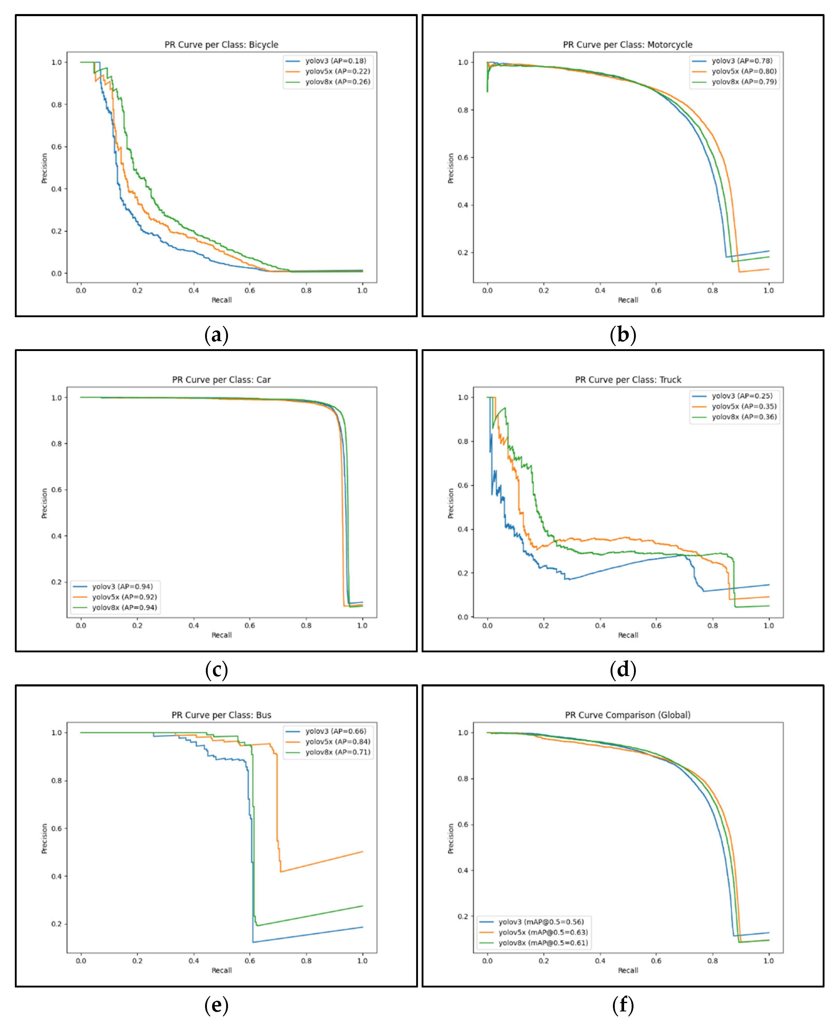 Figure 6 shows the precision–recall (PR) curves broken down by vehicle class and overall, where the areas under the curve correspond to the AP values. These curves enable a more detailed analysis of the balance achieved between the two metrics across the different confidence thresholds. Globally, YOLOv5 showed the most significant area under the curve, confirming its ability to maintain a balance between precision and recall compared to YOLOv3 and YOLOv8.