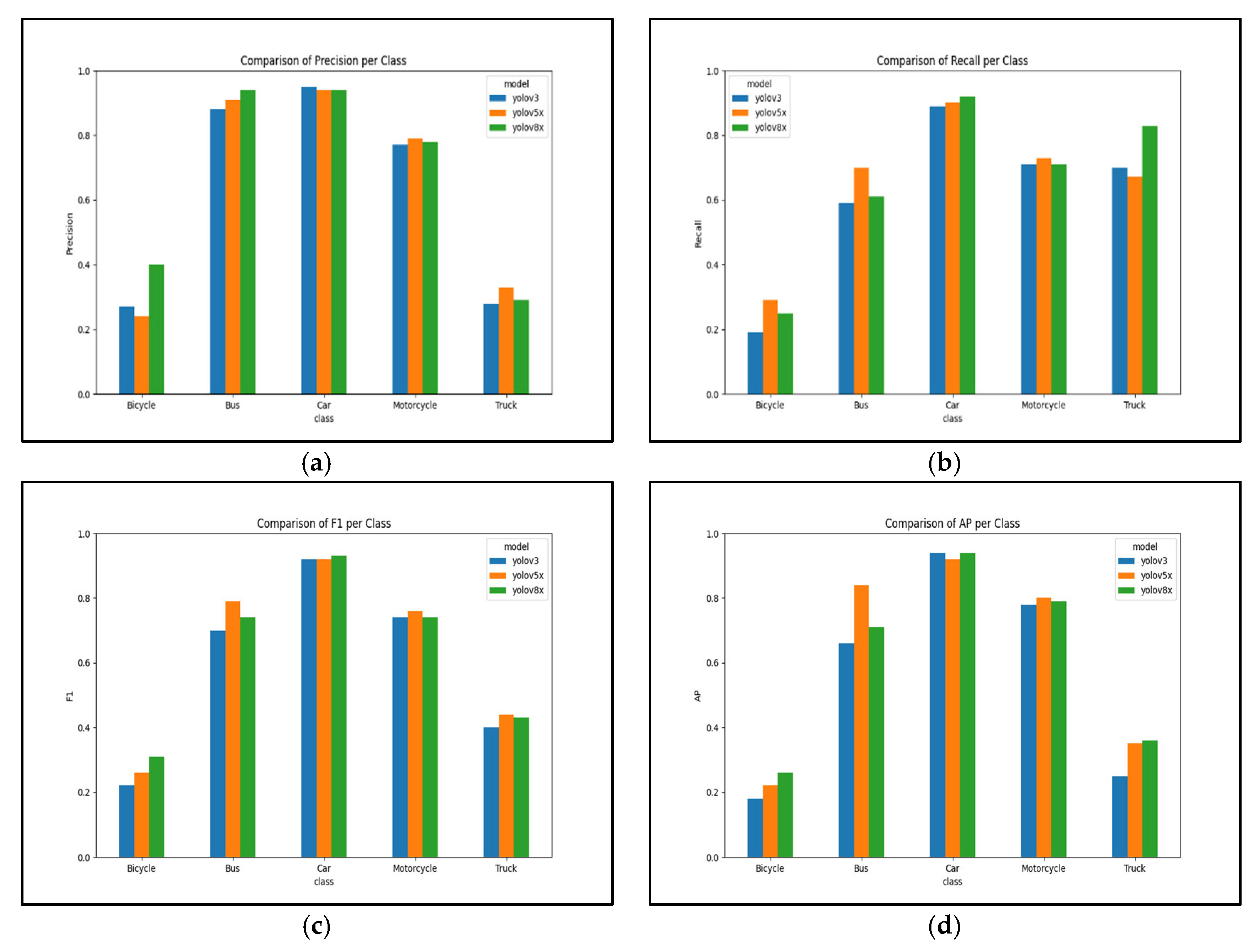 Figure 7 complements this analysis with a graphical comparison of metrics by class, highlighting that YOLOv5 and YOLOv8 offer more balanced performance across categories, whereas YOLOv3 shows greater disparity, with notable drops in bicycle and truck performance.