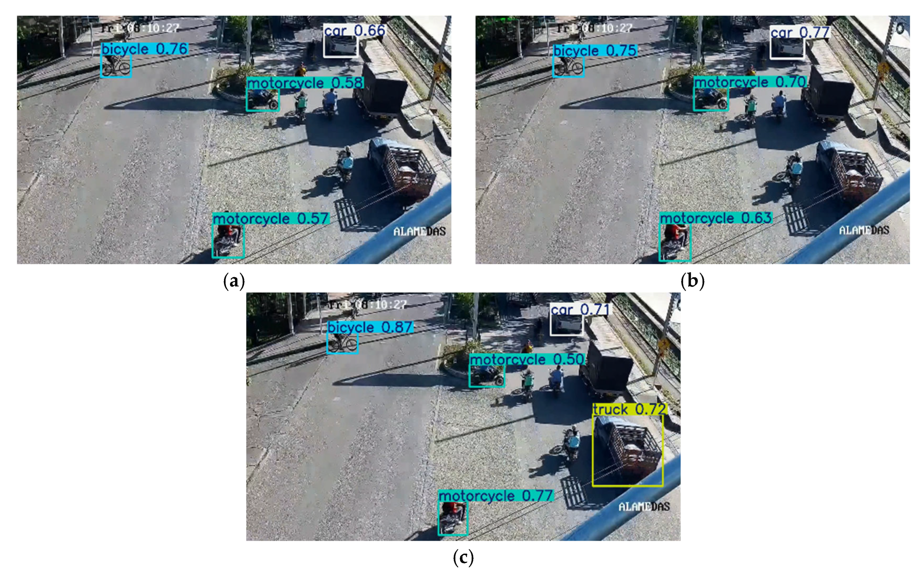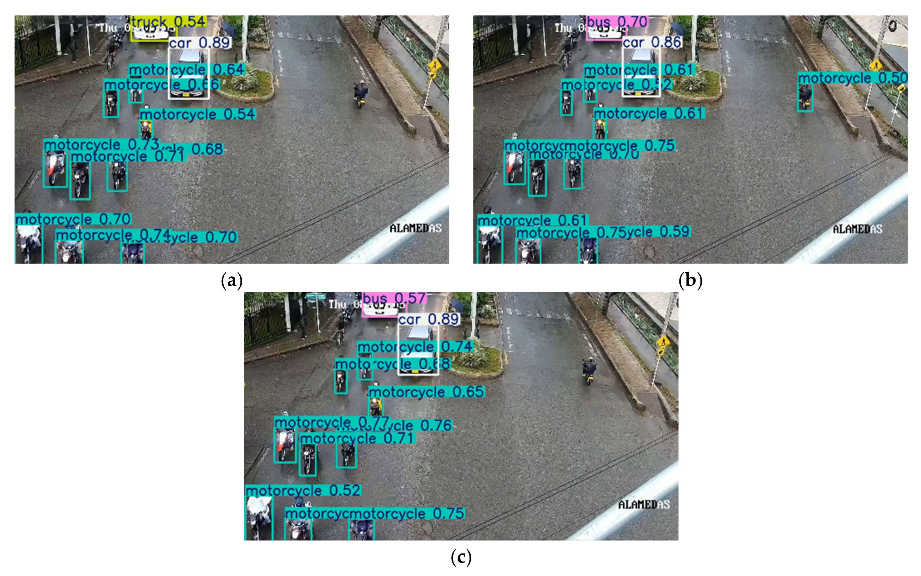 Table 3a–c: (i) Cars were the most consistently detected category. All architecture achieved AP values close to or above 0.90 in the three architectures, reflecting both the abundance of instances in the dataset and the relative stability of their visual patterns. (ii) Motorcycles and buses show intermediate performance. Both classes consistently maintain F1-scores between 0.70 and 0.79 in the three models, confirming the ability to generalize in categories with greater structural variability. (iii) Trucks and bicycles emerge as the most challenging classes. These categories have the lowest levels of precision and AP (≤0.36), suggesting that their low frequency of occurrence and morphological heterogeneity negatively impact detection.