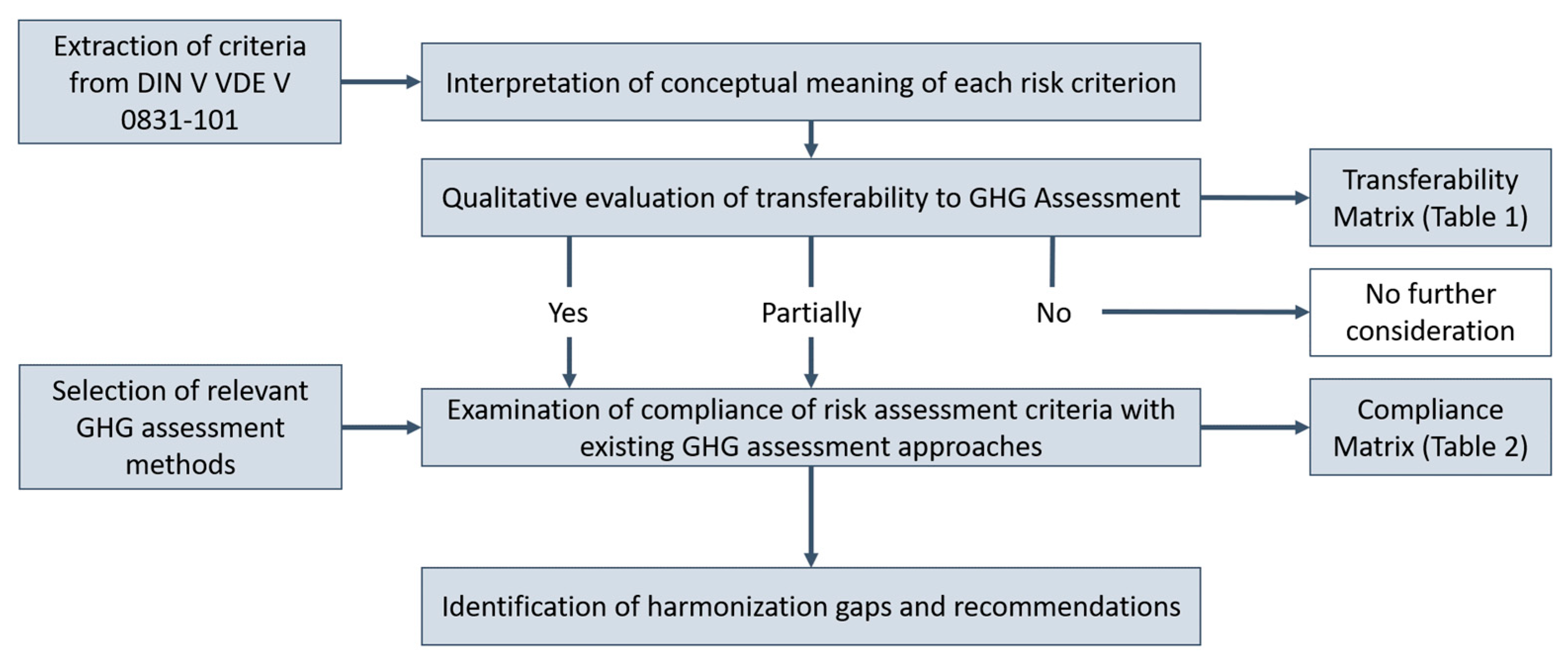 While the concept of a semi-quantitative approach is easy to understand, the question of how exactly this method should be constructed needs to be evaluated. It is postulated that by evaluating the criteria of pre-standard DIN V VDE V 0831-101 and discussing their transferability to the area of GHG assessment methods (GHG_AM), valuable input for designing future methods can be obtained.